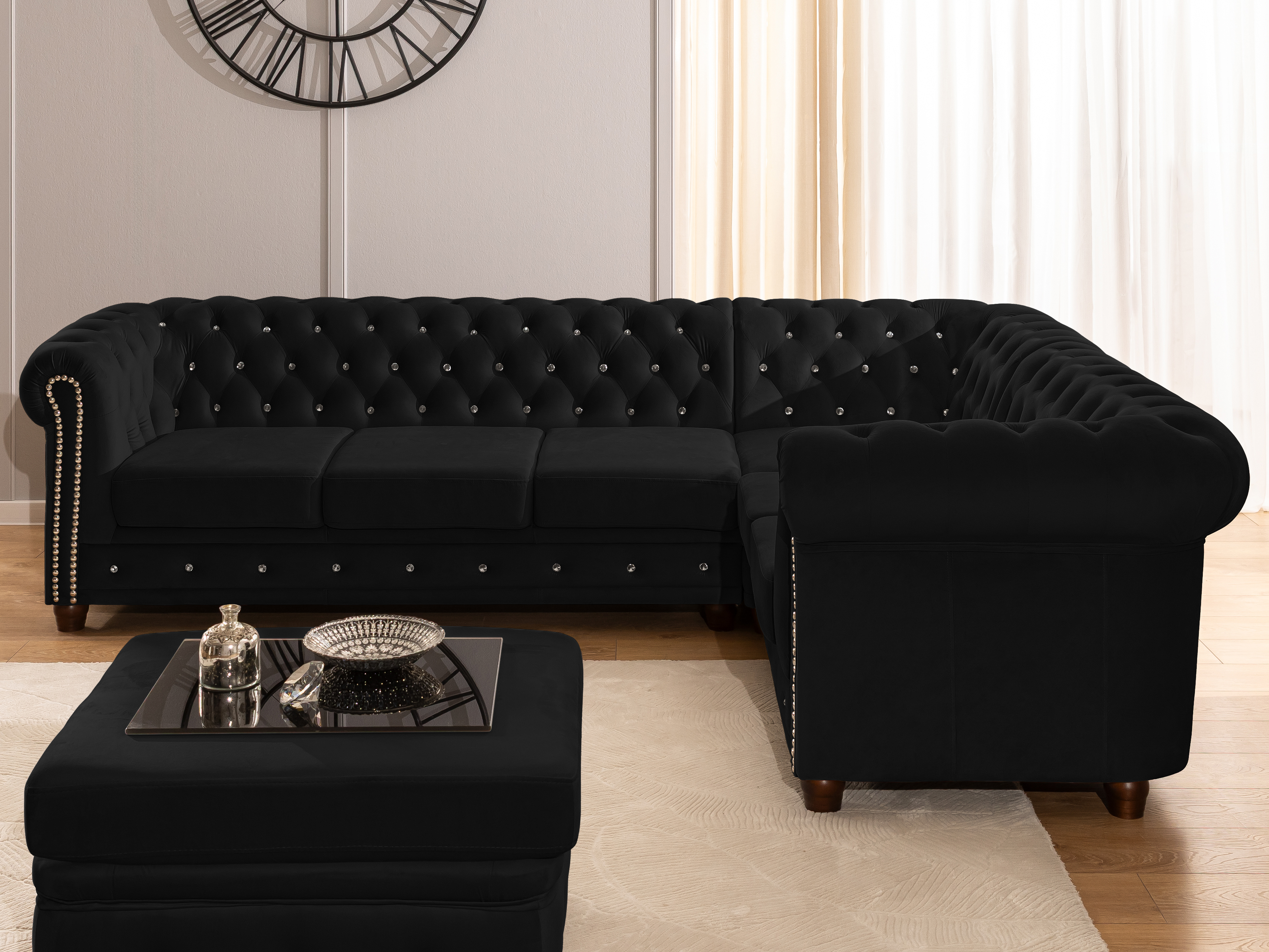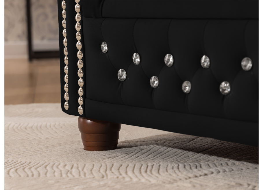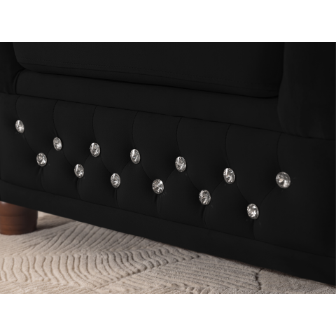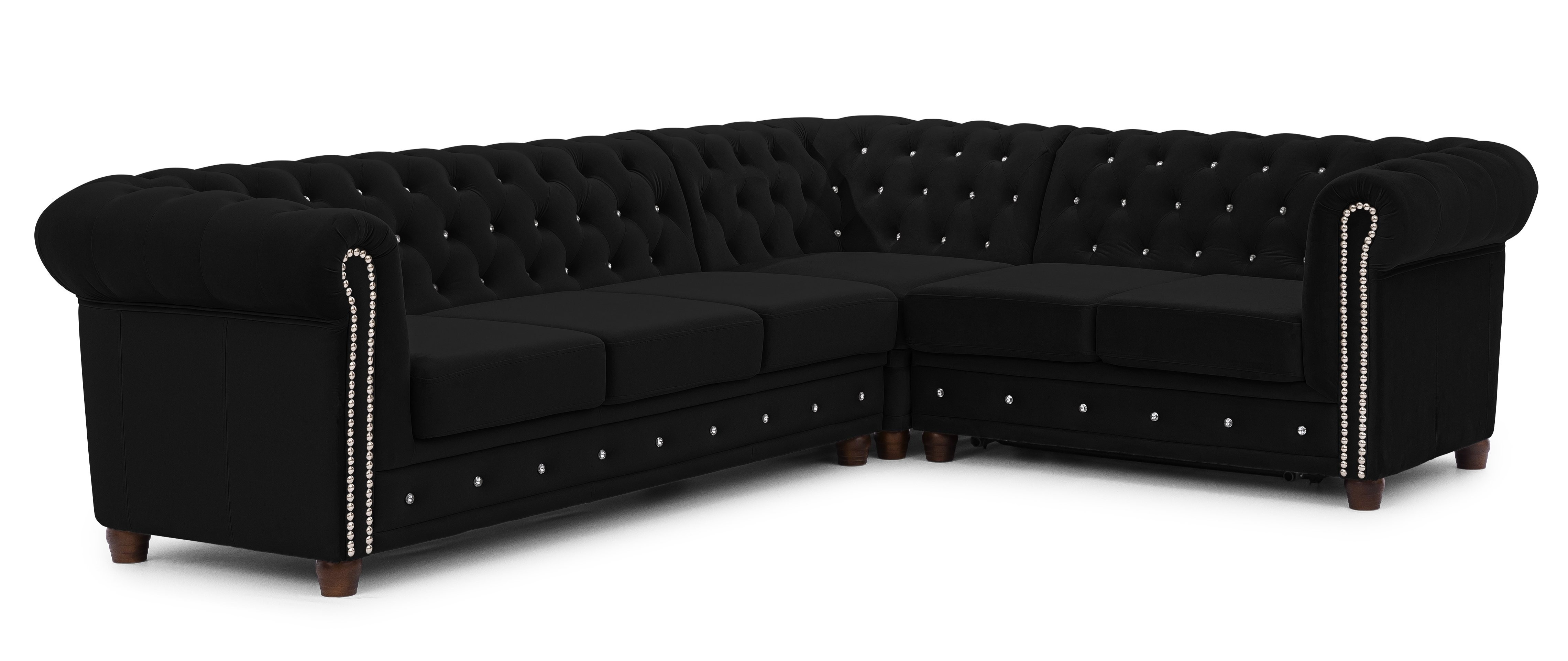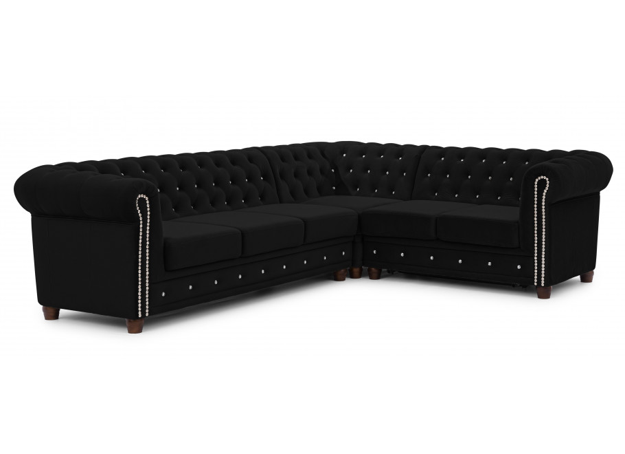Czarny narożnik Chesterfield FELIX BLINK to propozycja dla osób, które cenią mocne, wyraziste akcenty w aranżacji wnętrz. Pikowane wykończenie, ozdobione kryształkami w kolorze srebrnym lub złotym, podkreśla luksusowy charakter mebla i sprawia, że staje się on centralnym punktem salonu. Kształt litery „L” nadaje mu elegancji, a jednocześnie praktycznego charakteru.