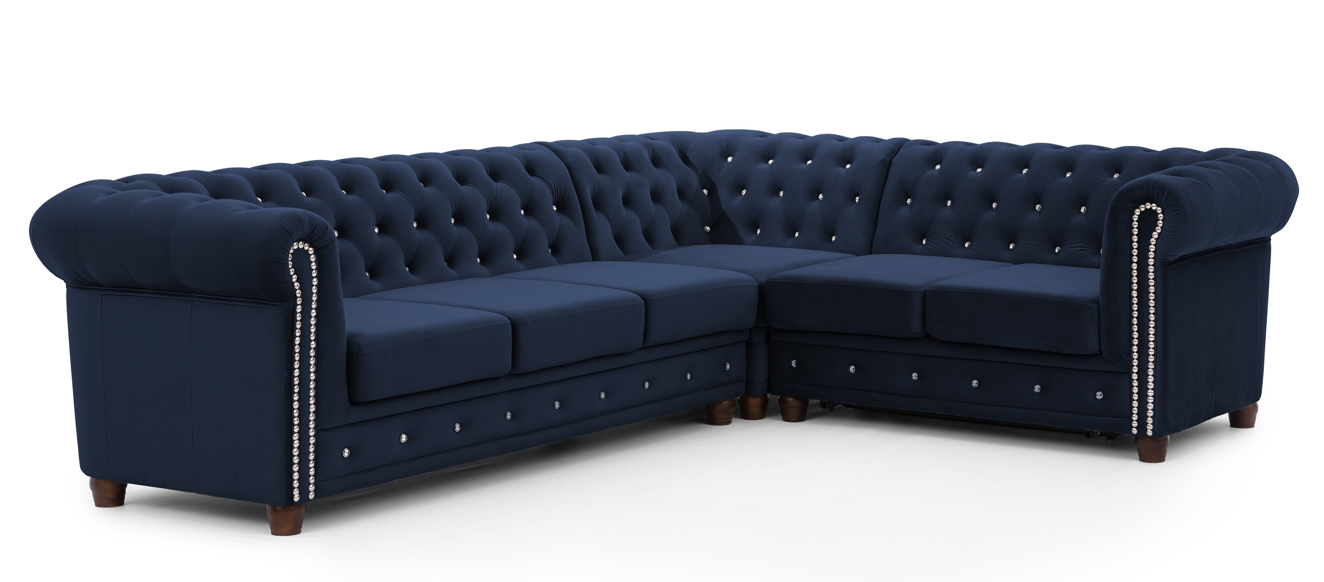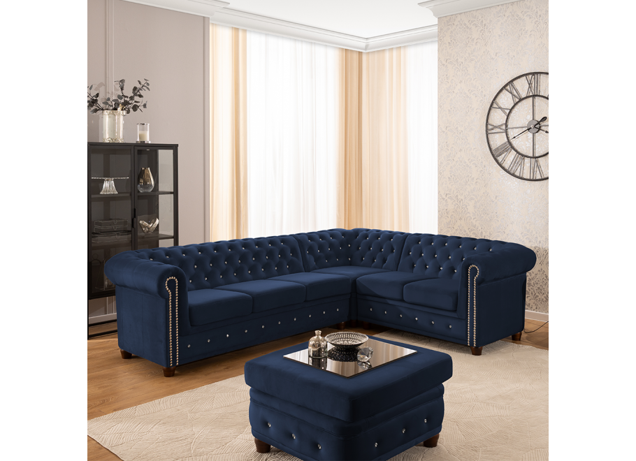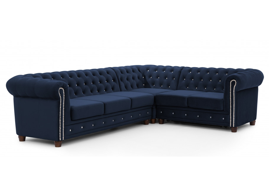 Granatowy narożnik Chesterfield FELIX BLINK to mebel, który łączy elegancję z nowoczesnym designem. Jego ozdobne pikowanie, uzupełnione kryształkami w złotej lub srebrnej tonacji, sprawia, że narożnik nabiera wyjątkowego charakteru. Układ w kształcie litery „L” zapewnia wygodne siedziska i czyni go centralnym punktem aranżacji każdego salonu.