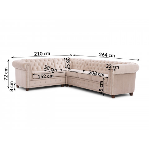 Wymiary narożnika wynoszą 264 cm szerokości, 210 cm głębokości i 72 cm wysokości. To proporcje, które pozwalają dopasować mebel do różnych typów wnętrz – zarówno przestronnych, jak i średnich metraży. Dzięki nim narożnik zachowuje elegancki wygląd przy jednoczesnym zachowaniu pełnej funkcjonalności.