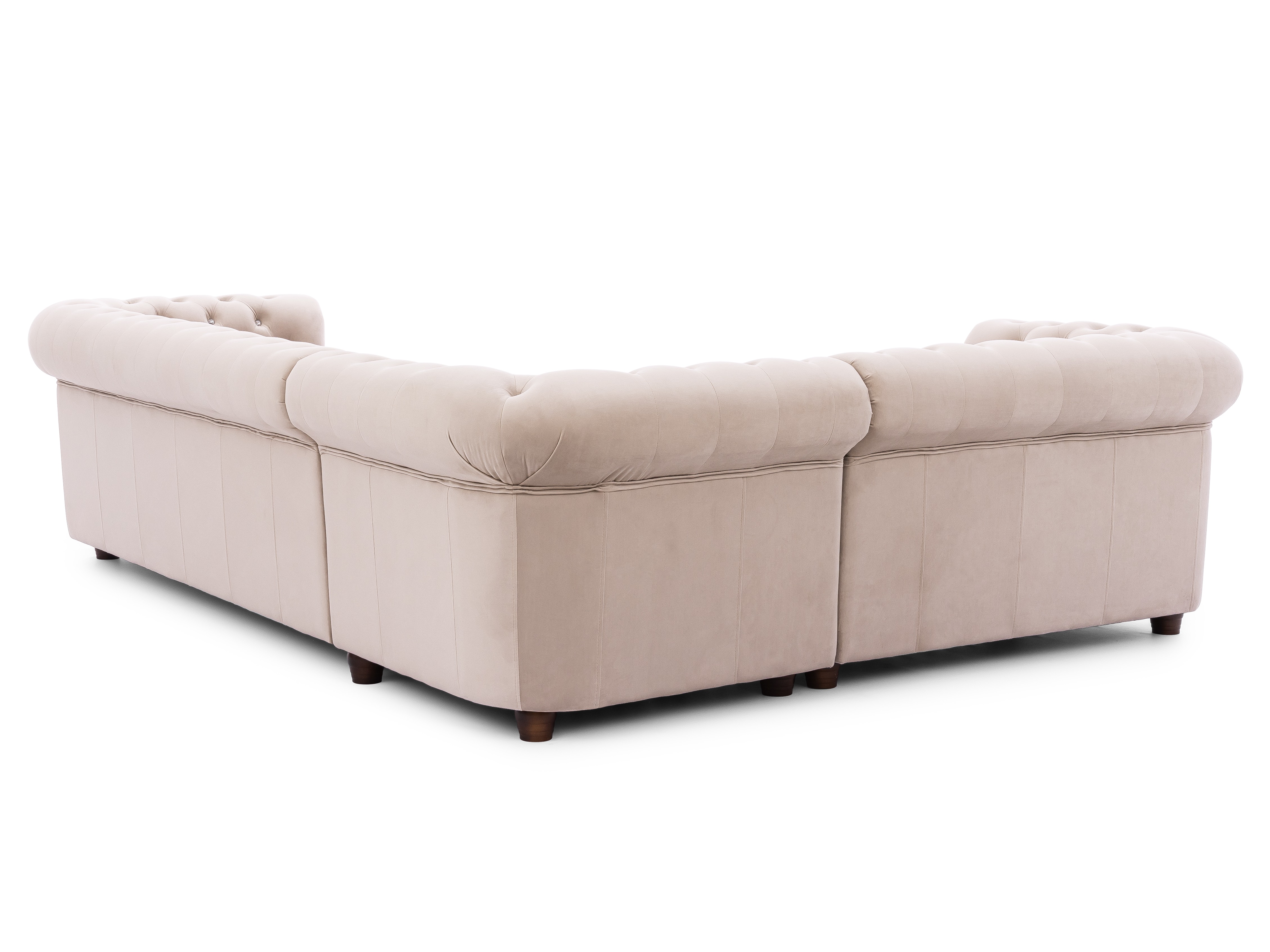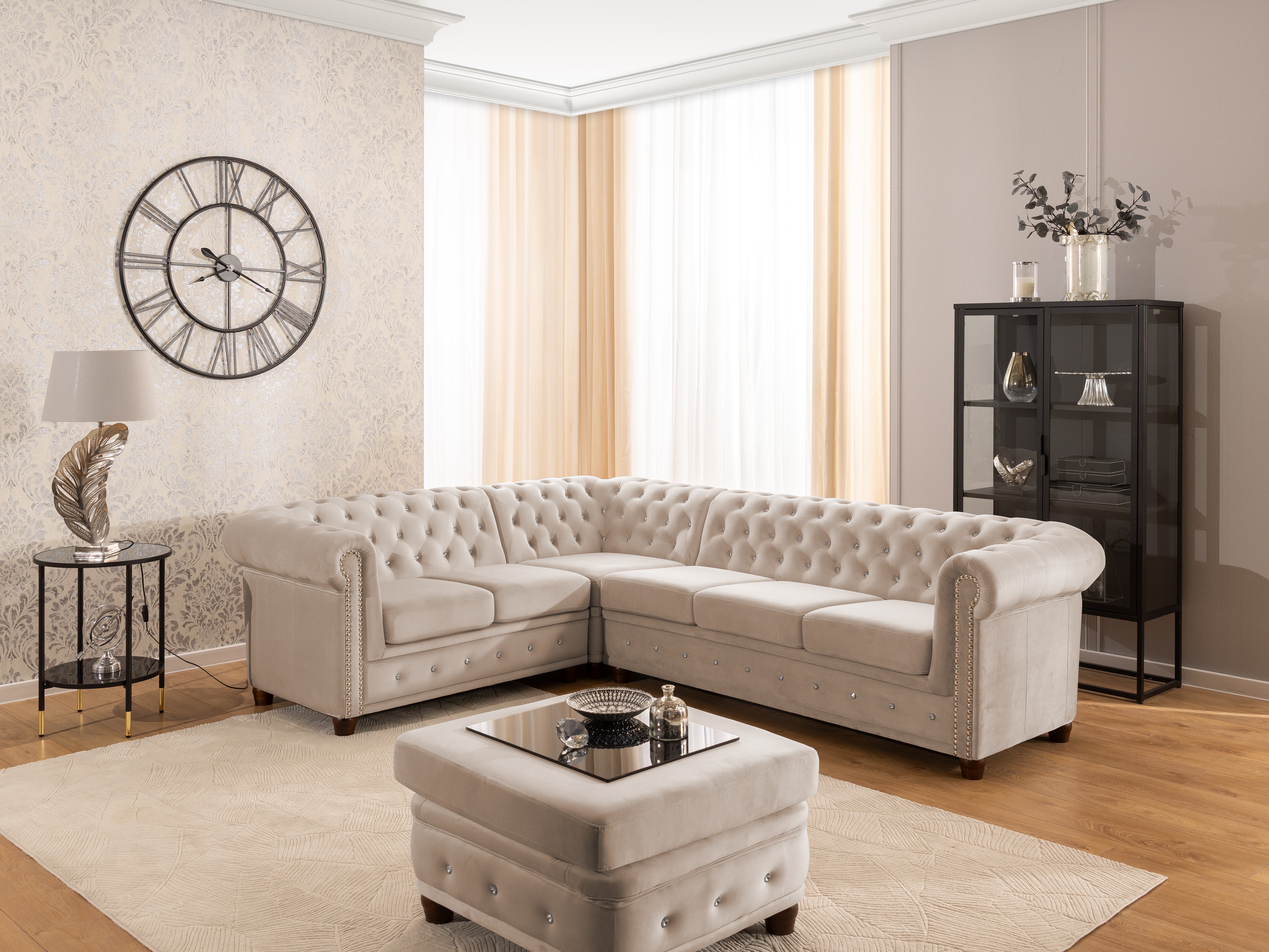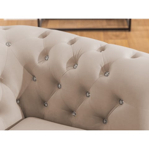 Narożnik Chesterfield FELIX BLINK w welurze w odcieniu beżowym to mebel, który łączy w sobie klasykę i subtelną nowoczesność. Jego charakterystyczny kształt litery L został wzbogacony o głębokie pikowania, wykończone dekoracyjnymi kryształkami w kolorze złotym lub srebrnym – w zależności od indywidualnych upodobań. To właśnie ten detal sprawia, że model natychmiast wyróżnia się we wnętrzu, a jego jasny, beżowy kolor dodaje całości przytulności i lekkości. Dzięki swojej estetyce narożnik staje się centralnym punktem salonu i jednocześnie elementem, który buduje elegancki charakter całej przestrzeni.