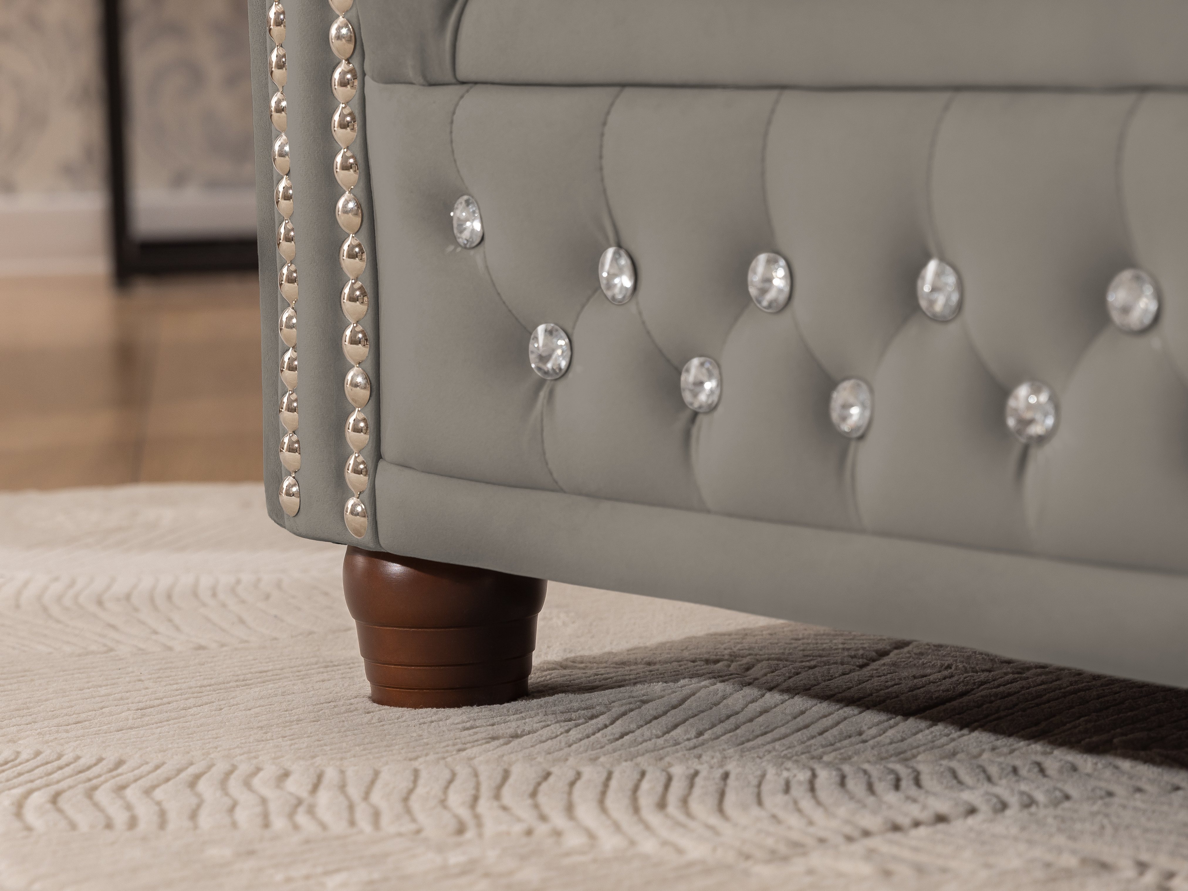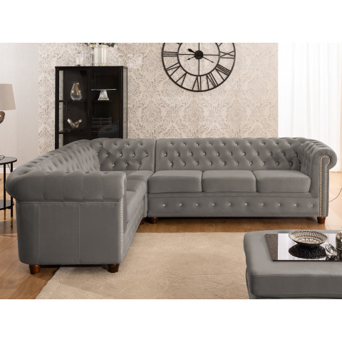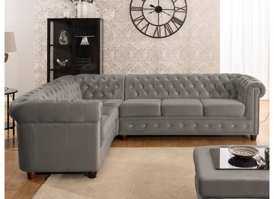 Szary narożnik Chesterfield FELIX BLINK to uniwersalna propozycja, która świetnie wpisuje się w różne aranżacje wnętrz. Eleganckie pikowania zakończone kryształkami – do wyboru w kolorze srebrnym lub złotym – nadają meblowi wyjątkowego wyglądu. Stonowany, szary odcień podkreśla nowoczesny charakter narożnika, sprawiając, że pasuje on zarówno do jasnych, jak i ciemnych pomieszczeń.