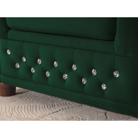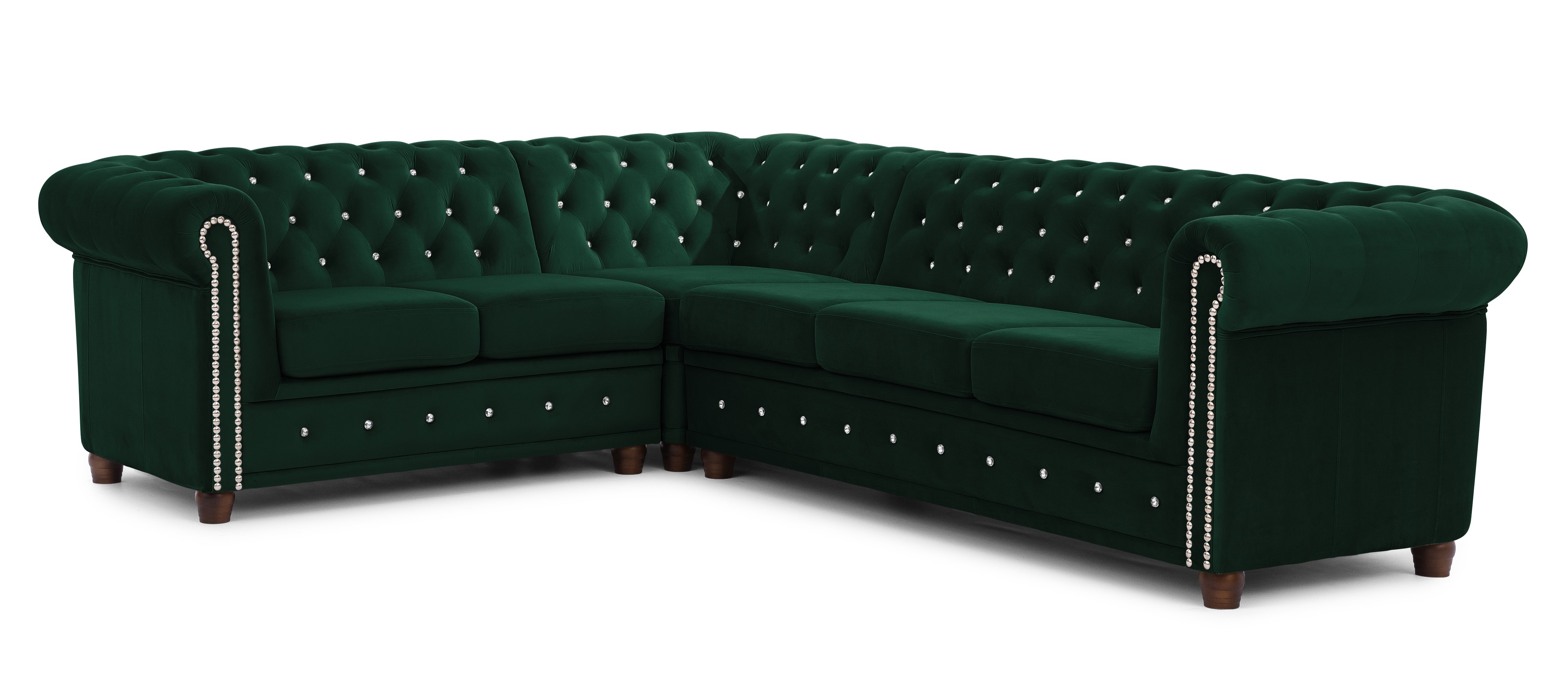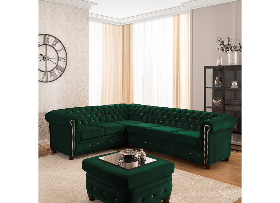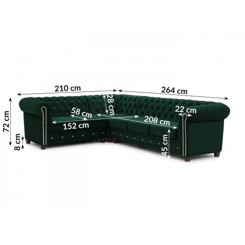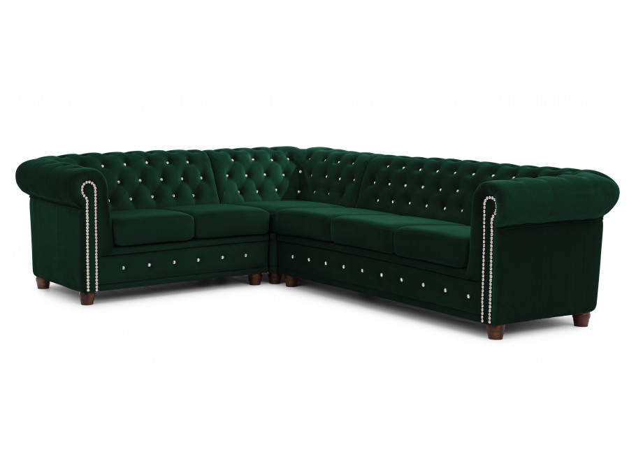 Narożnik Chesterfield FELIX BLINK w kolorze butelkowej zieleni to mebel, który wprowadza do salonu harmonię i elegancję. Głębokie pikowanie wykończone kryształkami – dostępnymi w wariancie srebrnym lub złotym – sprawia, że narożnik przyciąga uwagę i staje się ozdobą całego wnętrza. Ten detal dekoracyjny podkreśla charakterystyczny styl Chesterfield i nadaje meblowi wyjątkowego uroku.