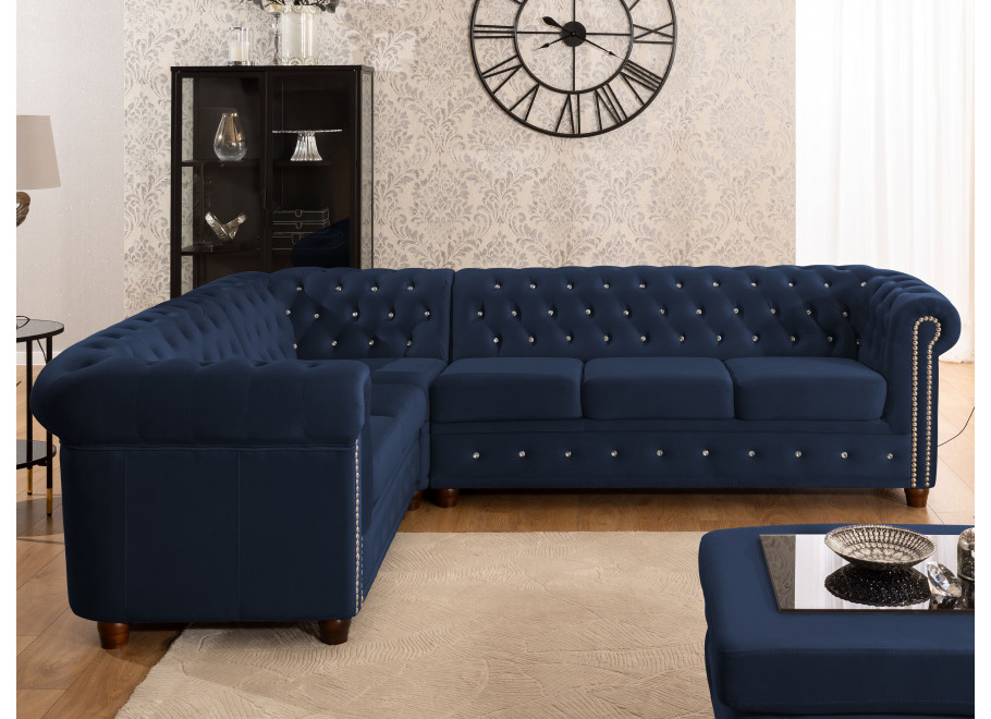Granatowy narożnik Chesterfield FELIX BLINK to propozycja dla osób, które cenią wyraziste, a zarazem eleganckie rozwiązania. Charakterystyczne pikowanie ozdobione kryształkami – w zależności od wyboru srebrnymi lub złotymi – przyciąga spojrzenia i nadaje meblowi luksusowego charakteru. To element, który sprawia, że narożnik staje się centralnym punktem aranżacji, podkreślając jej wyjątkowość.