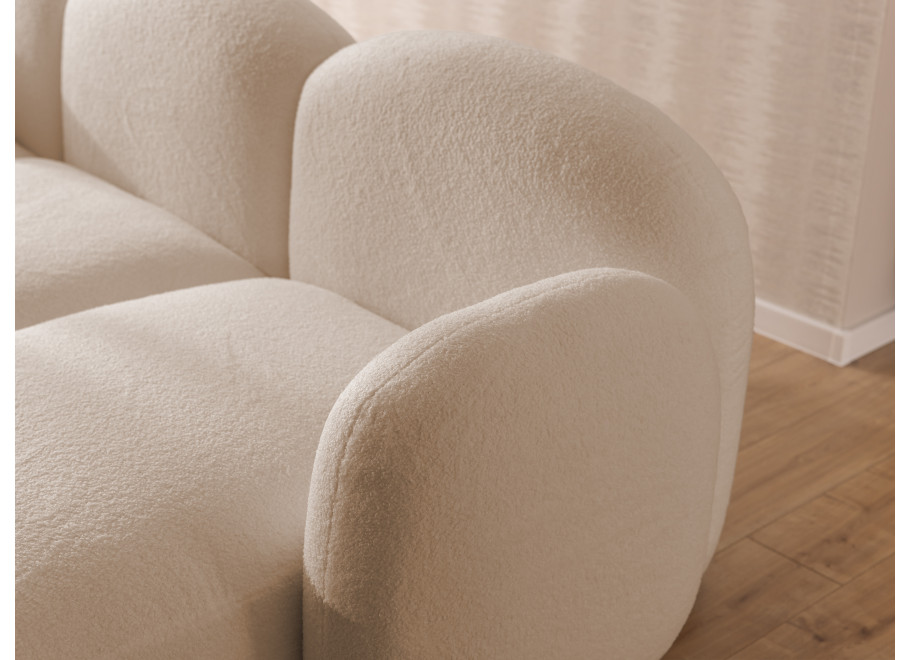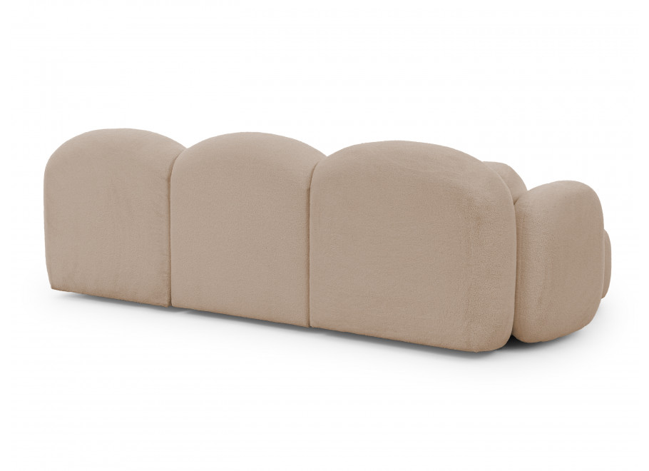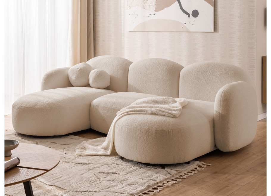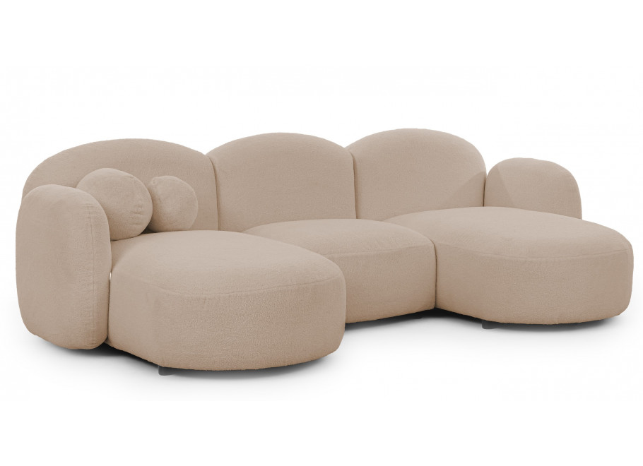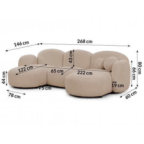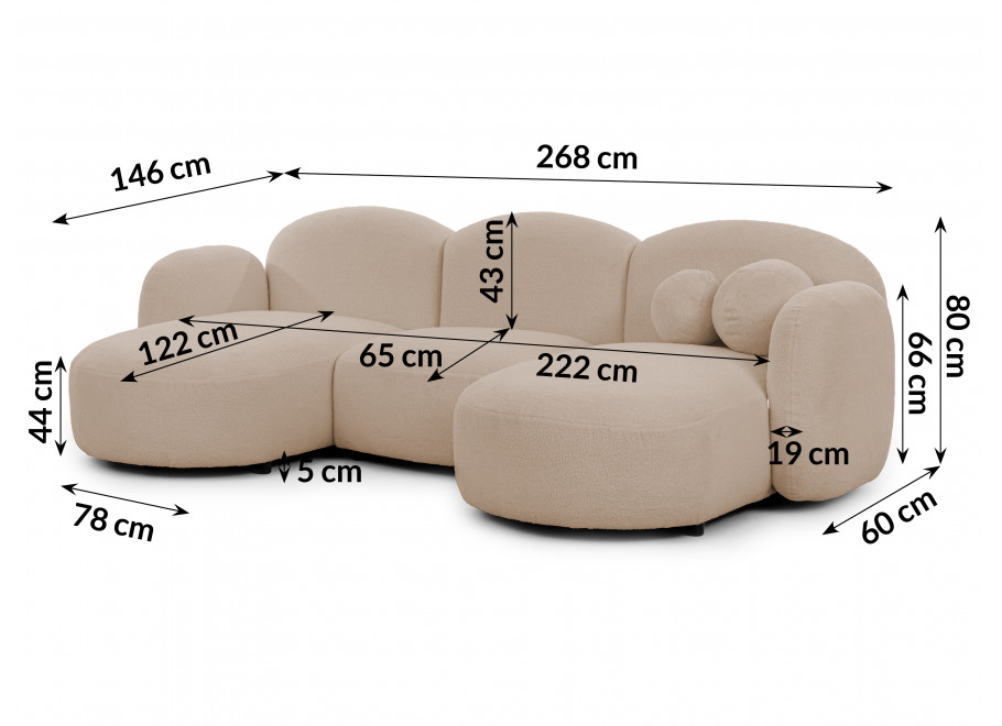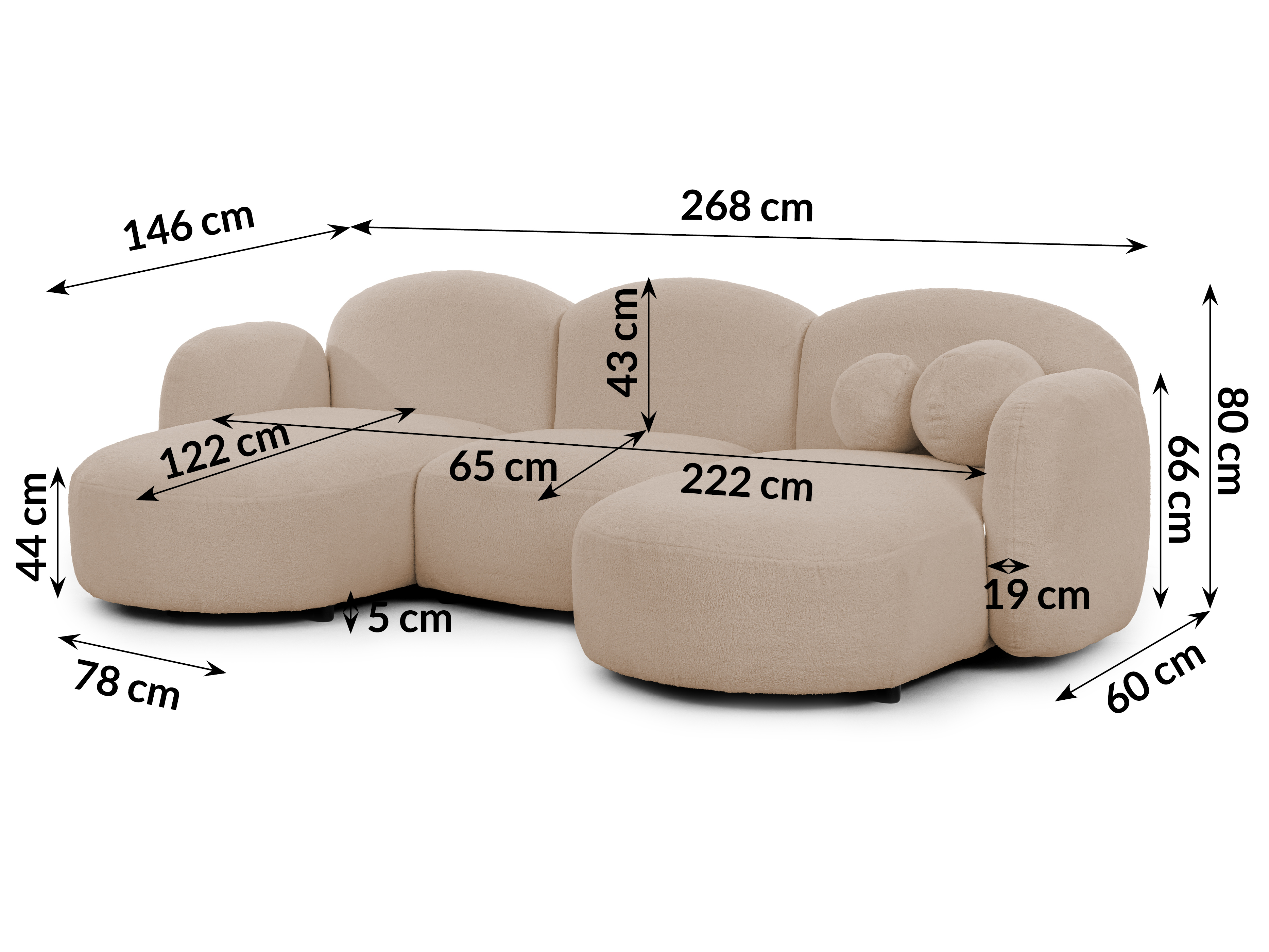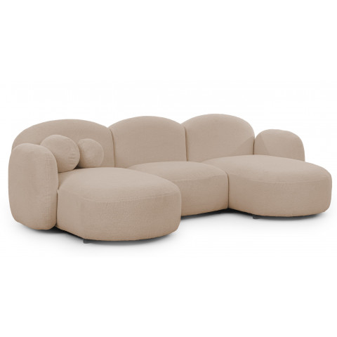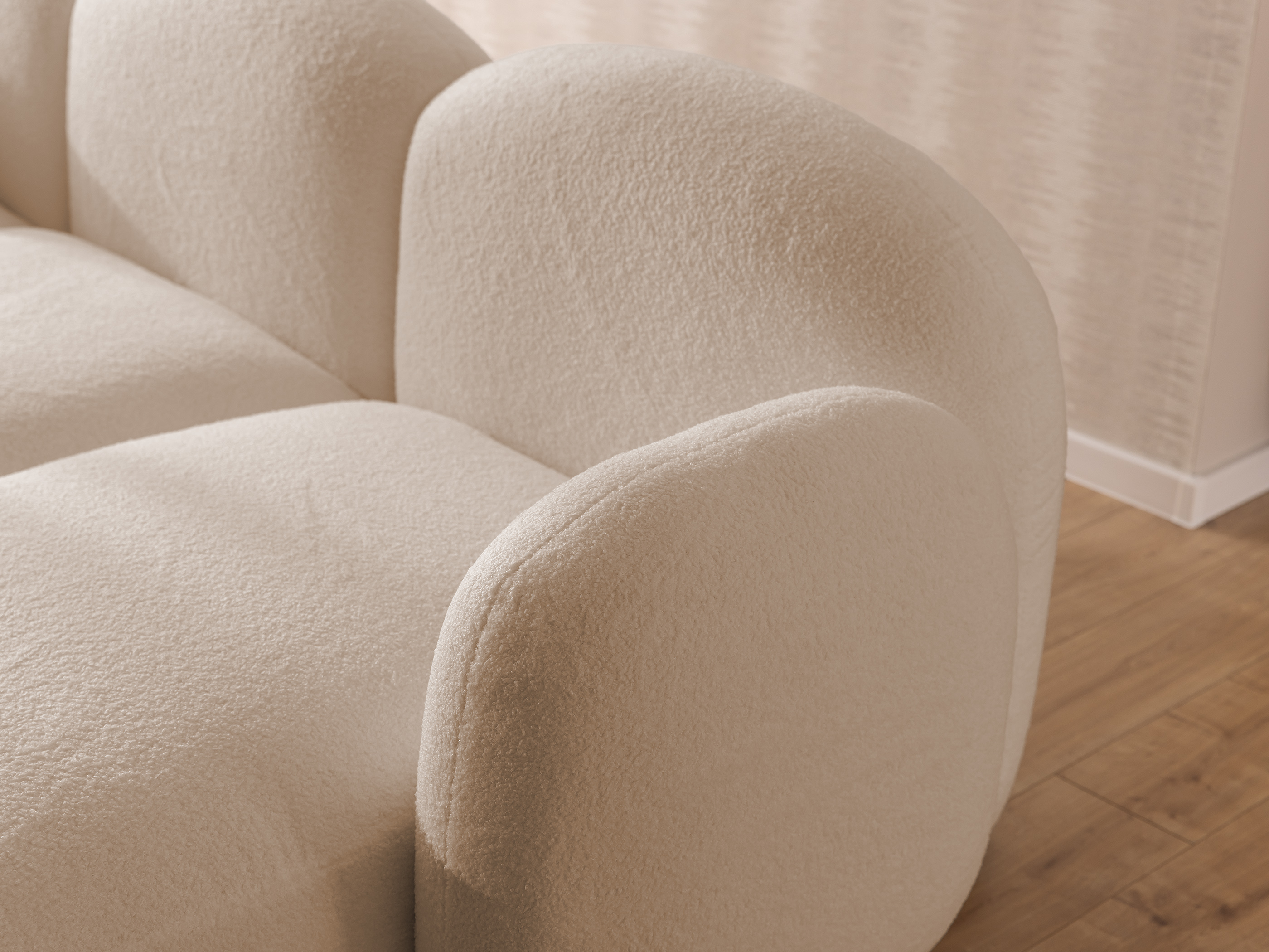 Beżowy narożnik to propozycja dla osób, które cenią naturalne barwy i przytulny charakter wnętrz. Jego kolor wprowadza do pomieszczenia spokój, ciepło i harmonię, sprawiając, że salon staje się miejscem sprzyjającym odpoczynkowi. Neutralny odcień beżu pasuje do wielu aranżacji – od klasycznych po nowoczesne – i doskonale komponuje się zarówno z jasnym drewnem, jak i ciemniejszymi akcentami. Zaokrąglona forma narożnika, inspirowana miękkimi liniami natury, nadaje mu subtelnej elegancji i sprawia, że świetnie wpisuje się w każdy wystrój.
