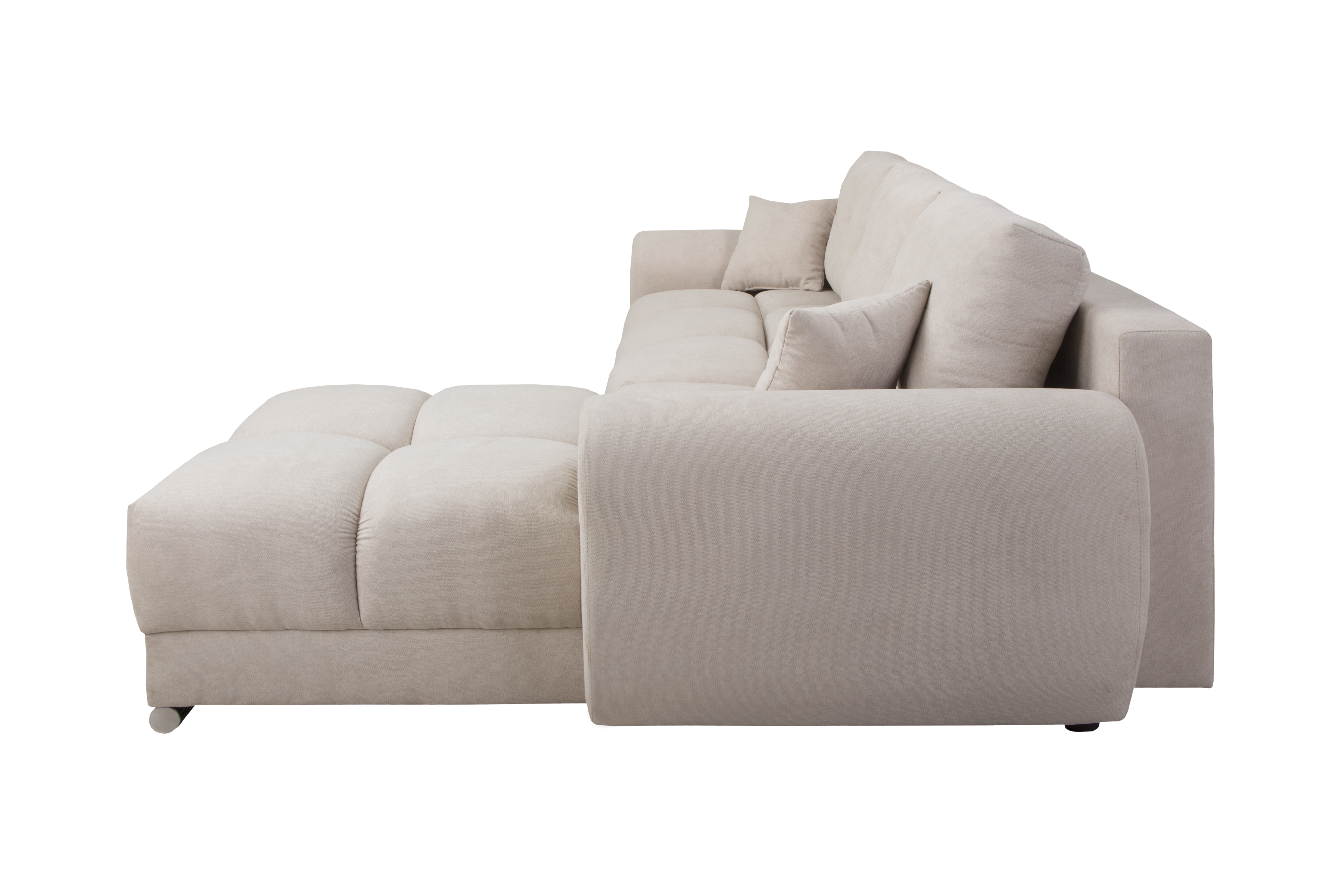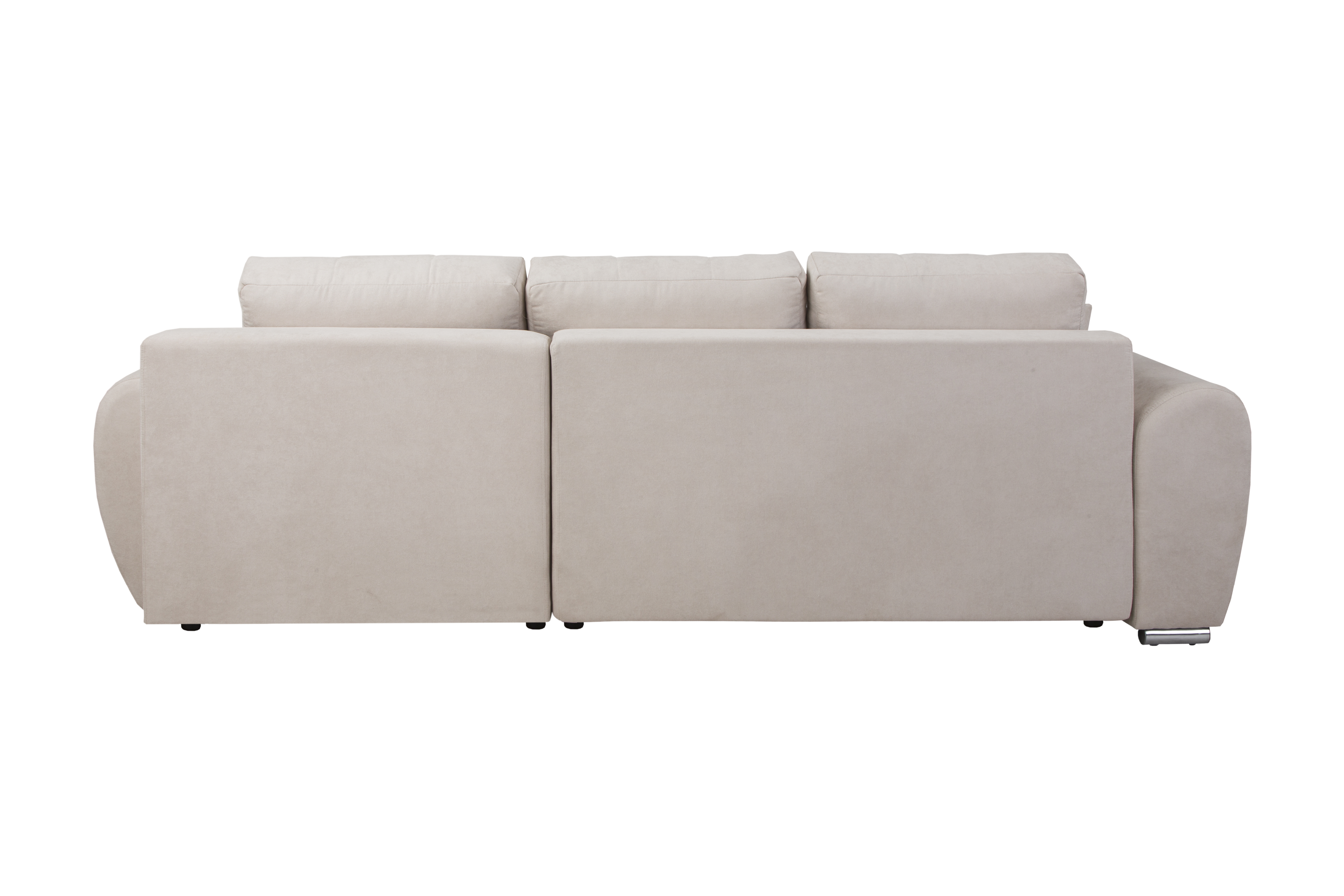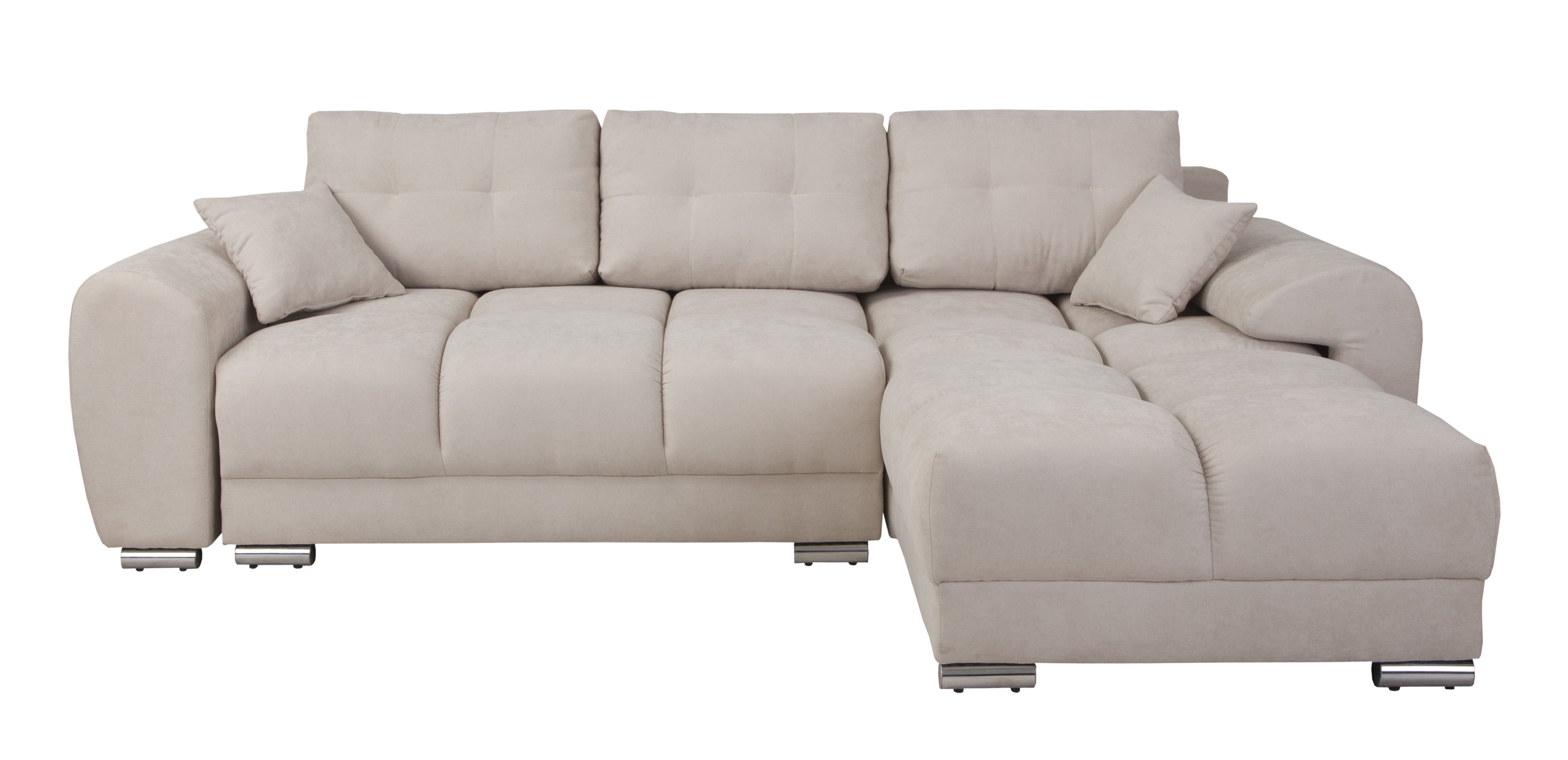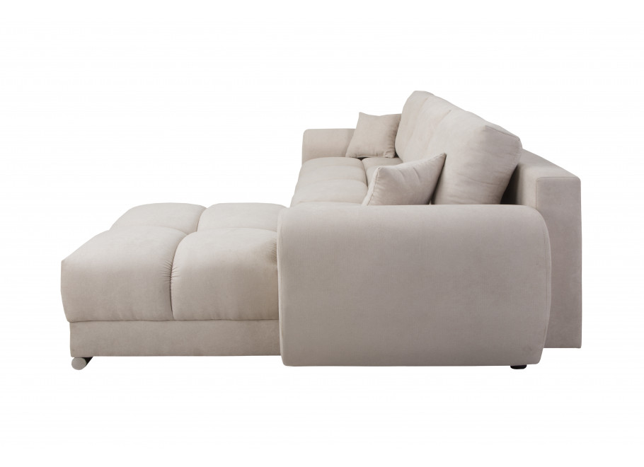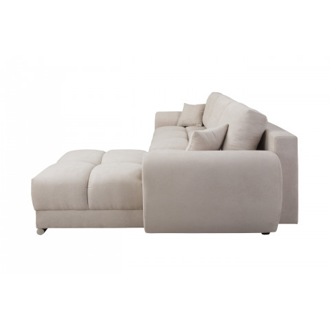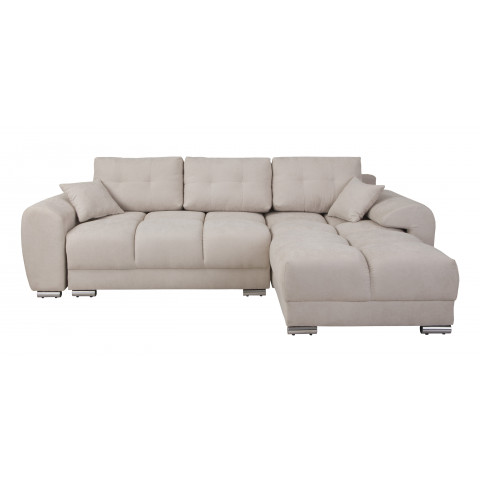 Sercem narożnika jest zaawansowana technologicznie konstrukcja oparta na solidnym stelażu z litego drewna, sklejki oraz wytrzymałych płyt wiórowych, MDF i HDF, co zapewnia meblowi wyjątkową stabilność oraz trwałość na długie lata intensywnego użytkowania. Niezwykle wygodny i ergonomiczny komfort siedzenia to zasługa zastosowania sprawdzonych sprężyn falistych oraz innowacyjnej, wysokoelastycznej pianki poliuretanowej, która znajduje się zarówno w siedzisku, jak i w oparciu, dzięki czemu mebel idealnie dopasowuje się do kształtu ciała i błyskawicznie wraca do swojej pierwotnej formy. Oparcie tworzą trzy luźne, duże poduszki oparciowe o wymiarach 42 x 64 x 18 cm, które wypełniono specjalną mieszanką pianki oraz silikonu, gwarantując miękkość i doskonałe podparcie dla kręgosłupa, natomiast dwie dodatkowe poduszki dekoracyjne o wymiarach 34 x 34 x 14 cm dodają całości przytulnego charakteru i podnoszą walory estetyczne wnętrza.