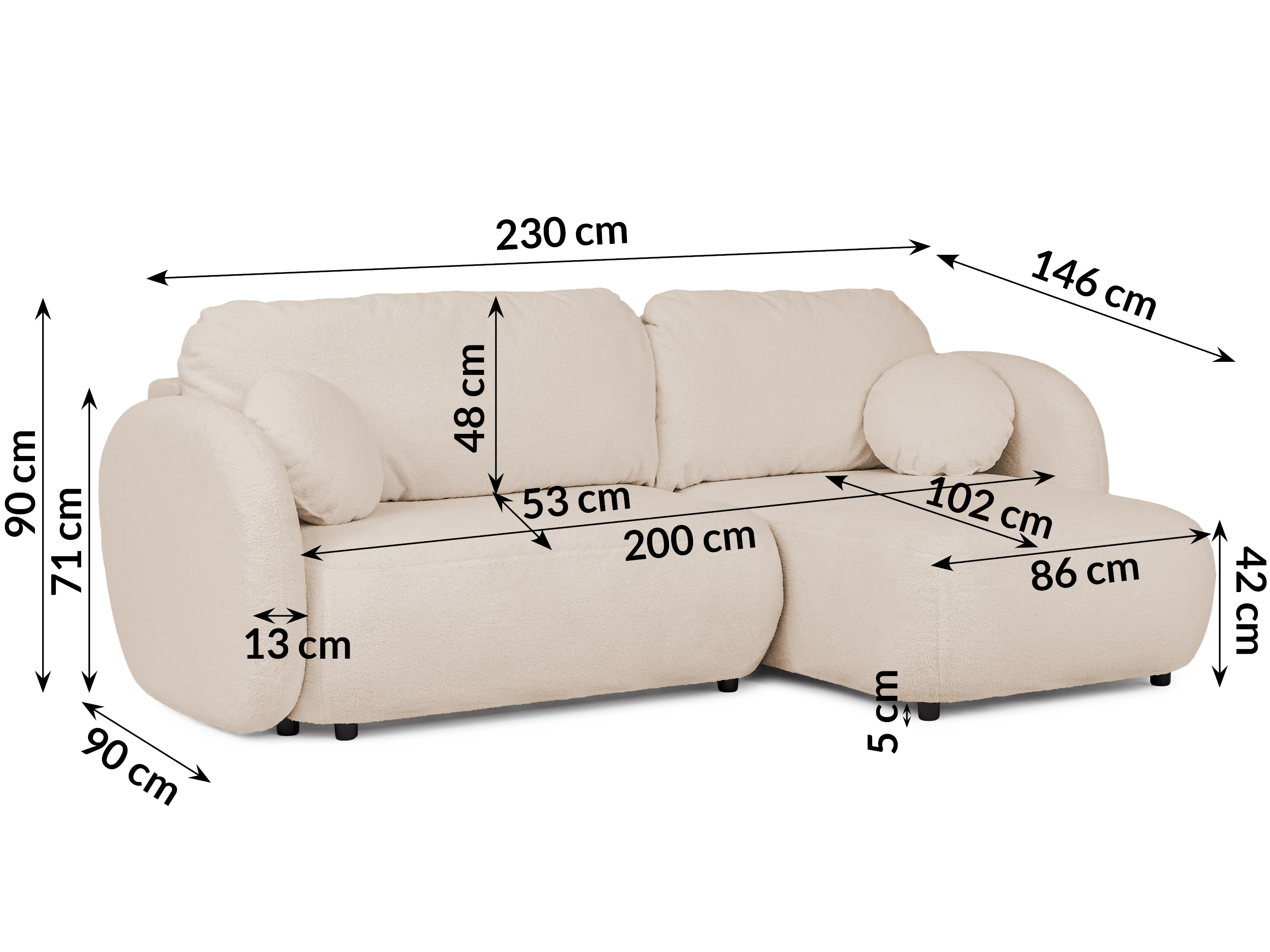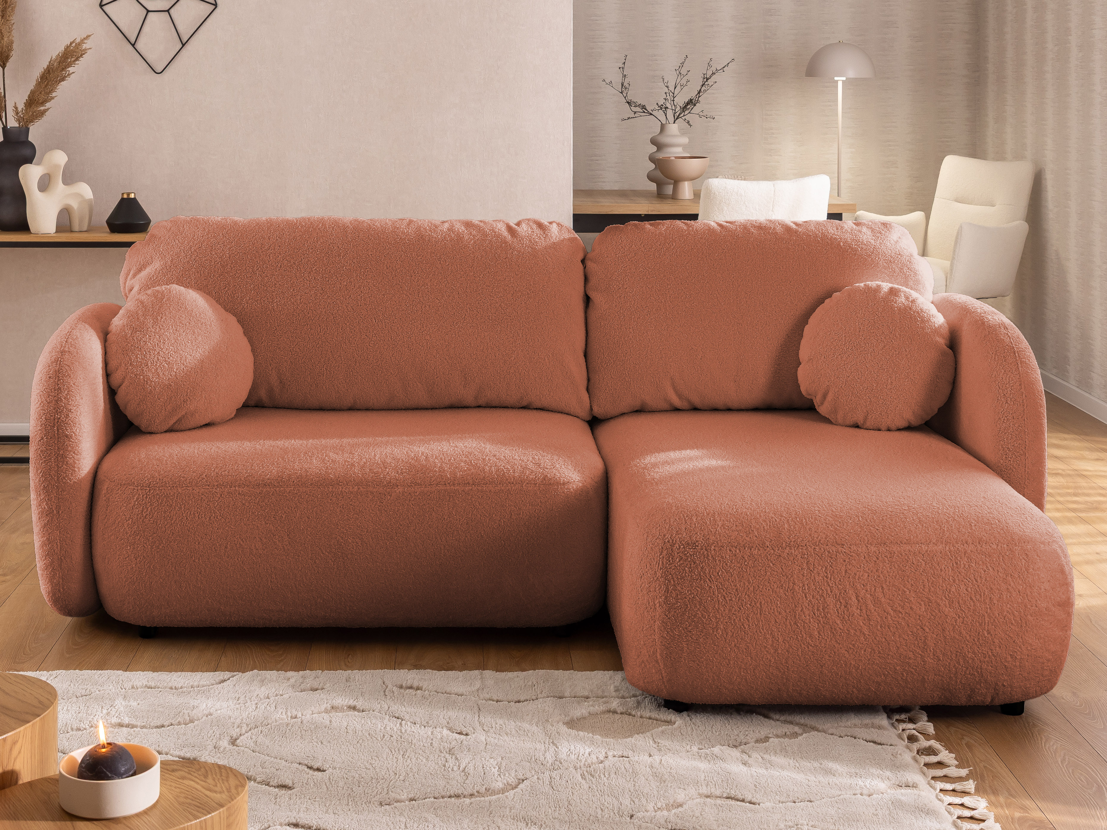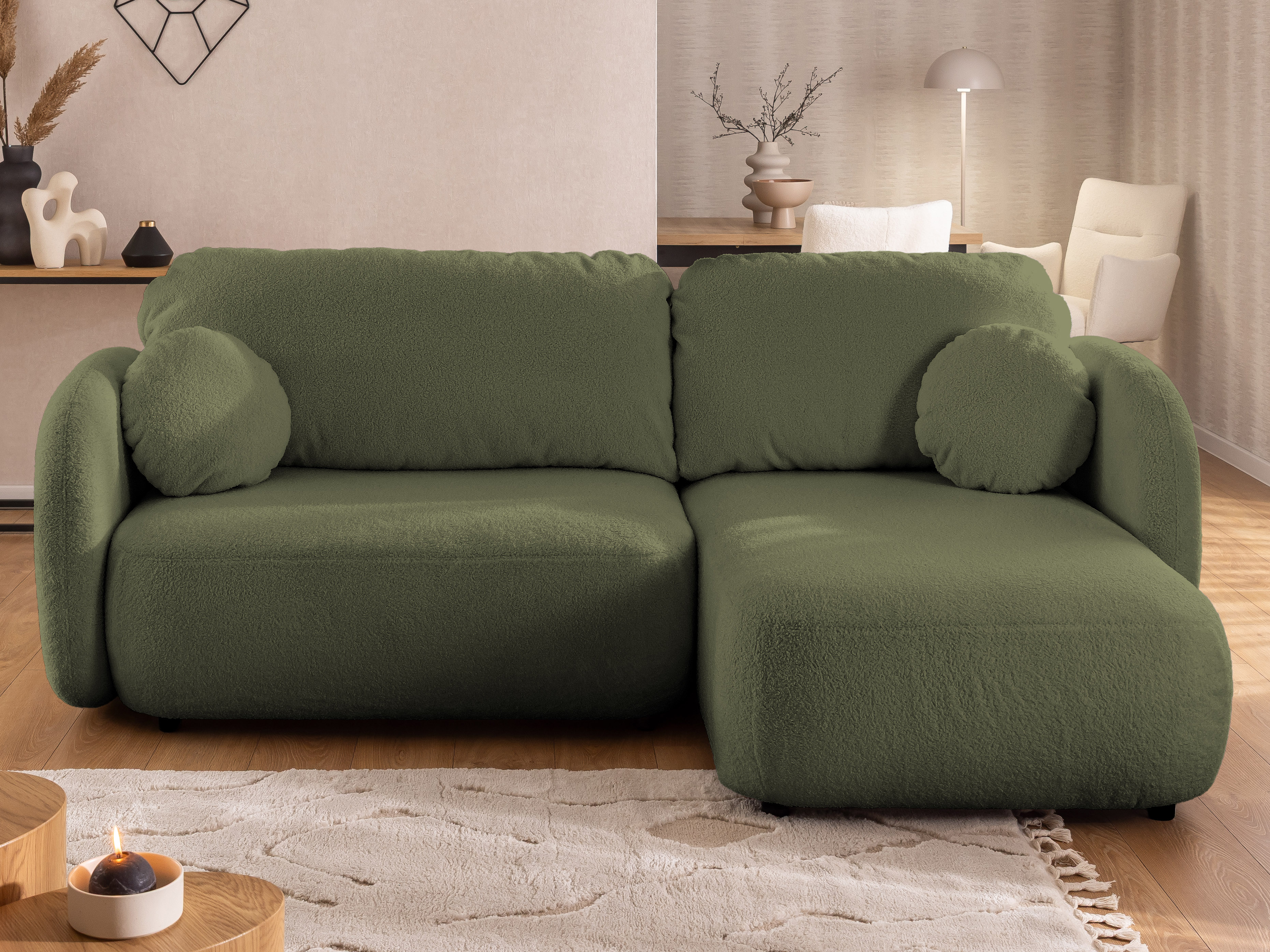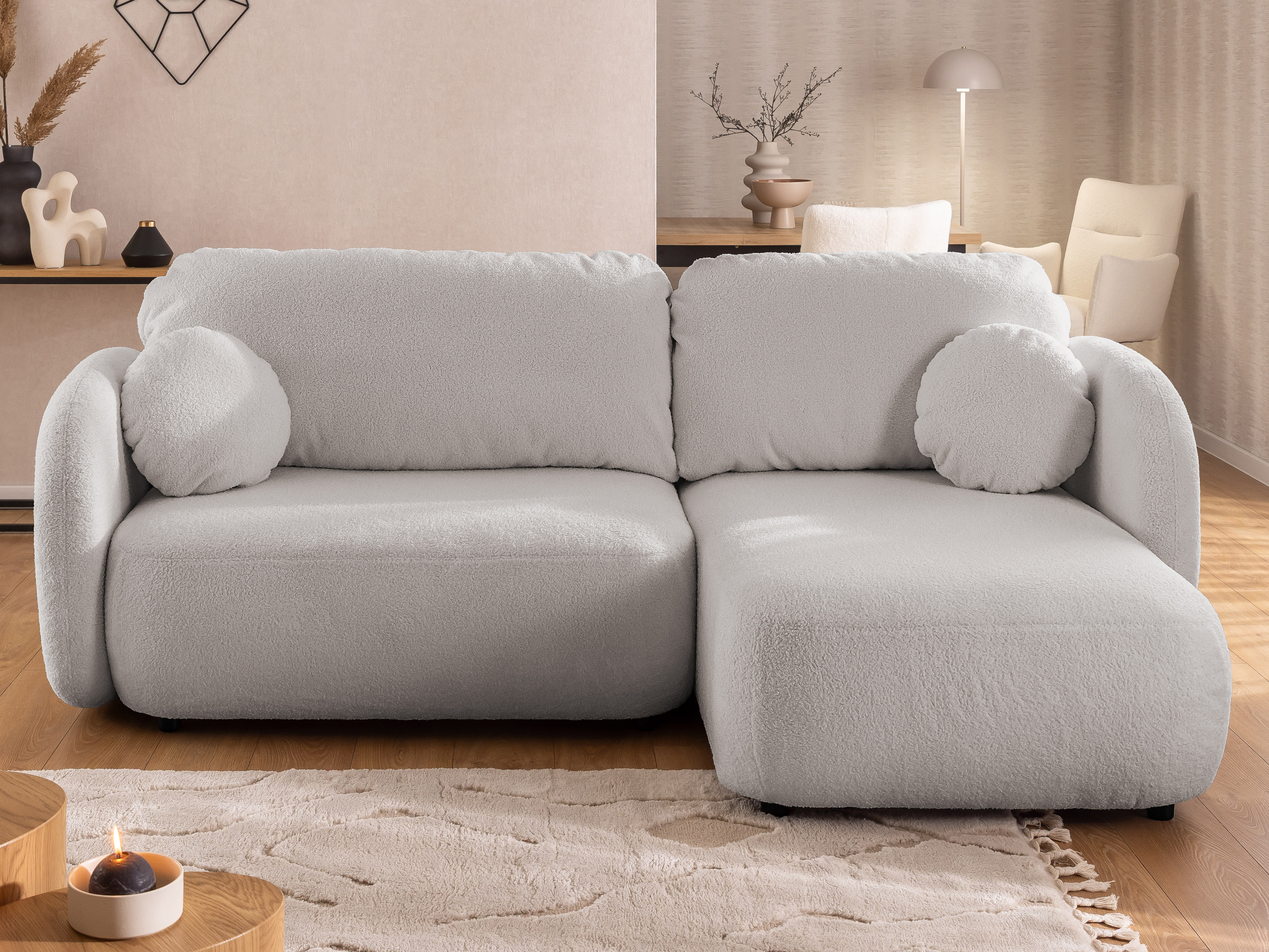 Ten elegancki narożnik w kształcie litery L wyróżnia się miękkimi, zaokrąglonymi liniami i przytulną formą, wprowadzając do wnętrza atmosferę harmonii i relaksu.