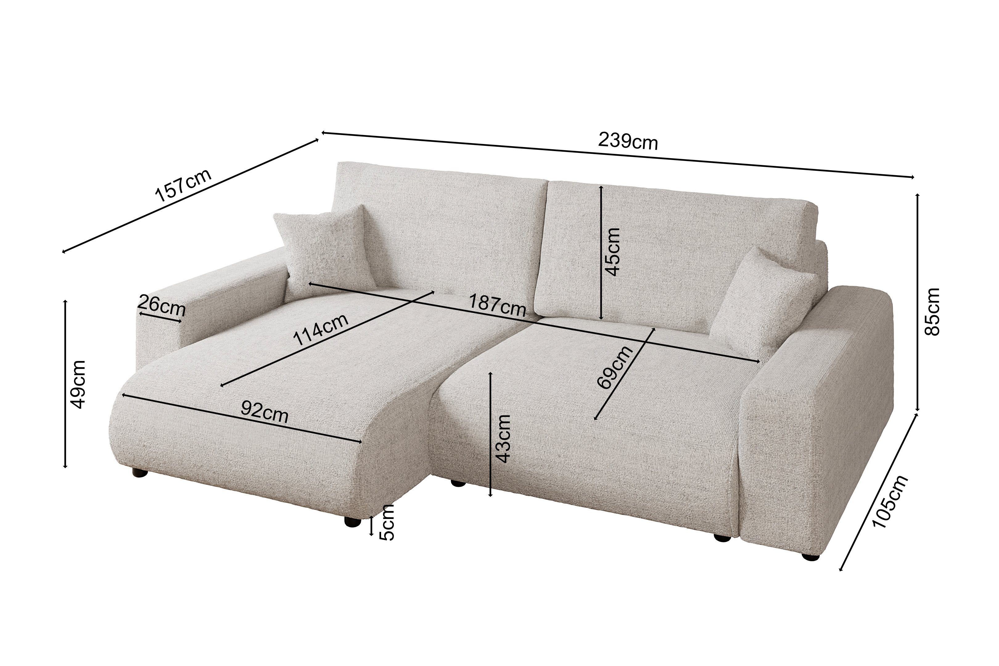 Ten elegancki narożnik w kształcie litery L zachwyca miękkimi, zaokrąglonymi liniami oraz przytulną formą, wprowadzając do wnętrza atmosferę relaksu i harmonii.