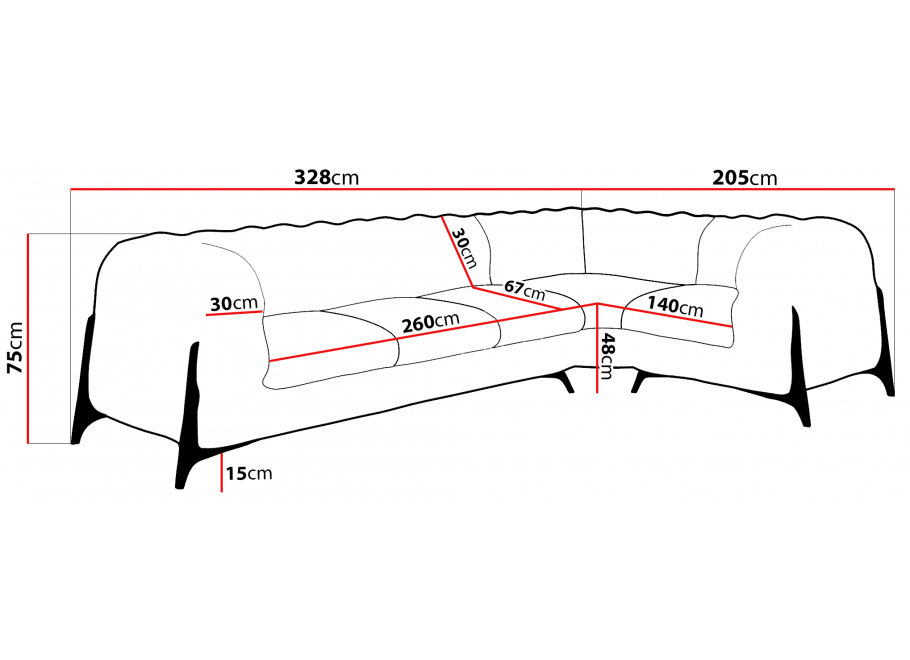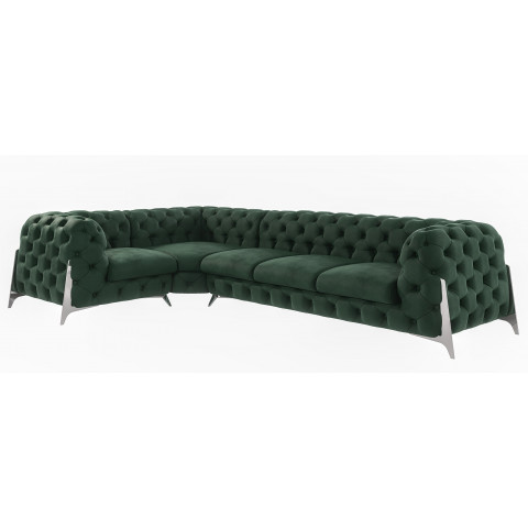 Starannie wykonane pikowania i eleganckie przeszycia nadają narożnikowi charakterystycznego, ponadczasowego stylu glamour. W zestawieniu z intensywnym odcieniem butelkowej zieleni, mebel prezentuje się niezwykle efektownie i od razu przyciąga wzrok. Ten kolor podkreśla luksusowy charakter narożnika, a jednocześnie doskonale komponuje się z aranżacjami w stylu klasycznym, nowoczesnym, loftowym czy modern classic. Głęboka zieleń nadaje wnętrzu szlachetności i wyjątkowej atmosfery.