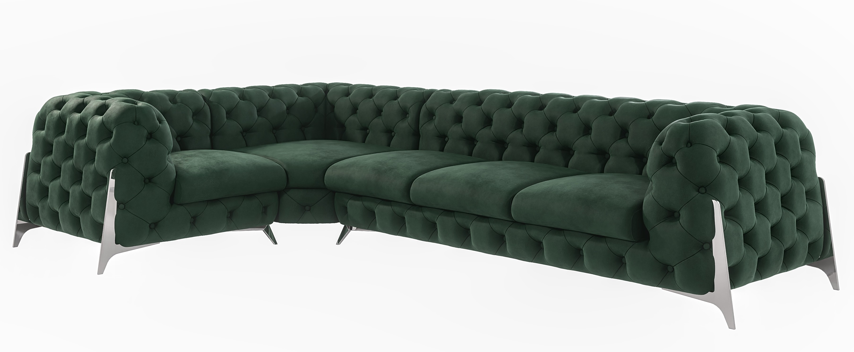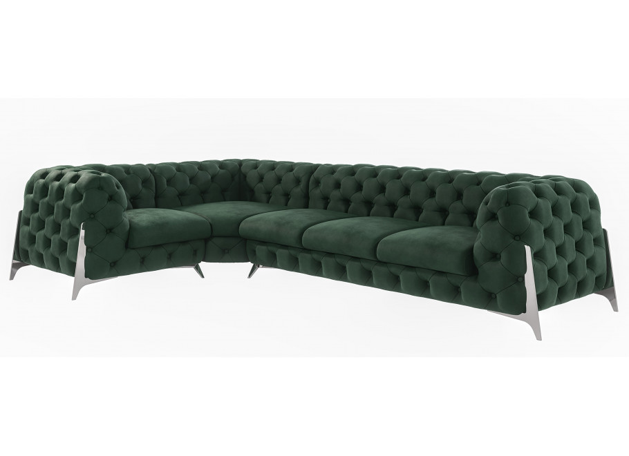 Narożnik Kalifornia w butelkowej zieleni to idealne połączenie stylu glamour, wysokiej wygody i wyrazistej kolorystyki, która podkreśli wyjątkowy charakter Twojego salonu.