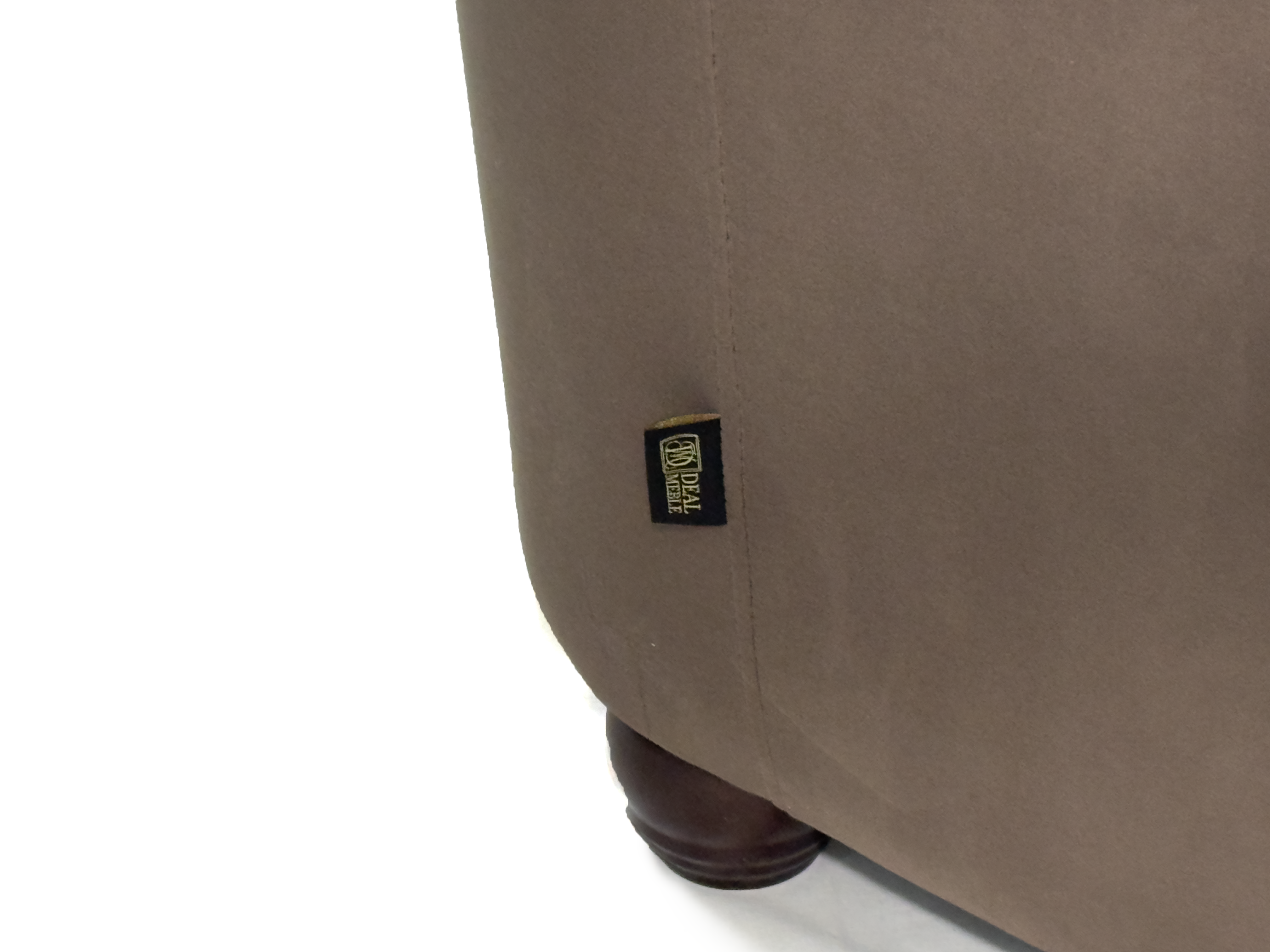 Sofa została obita tkaniną Riviera 26 – to miękki, welurowy materiał obiciowy w nasyconym, luksusowym odcieniu brązu. Tkanina Riviera charakteryzuje się wysoką odpornością na ścieranie i przyjemną w dotyku, aksamitną strukturą z delikatnym połyskiem. Materiał ma niską podatność na mechacenie, dobrą odporność na światło oraz spełnia normę trudnopalności EN 1021-1 (test papierosa). Ten wybór gwarantuje długotrwałą estetykę i bezpieczeństwo.