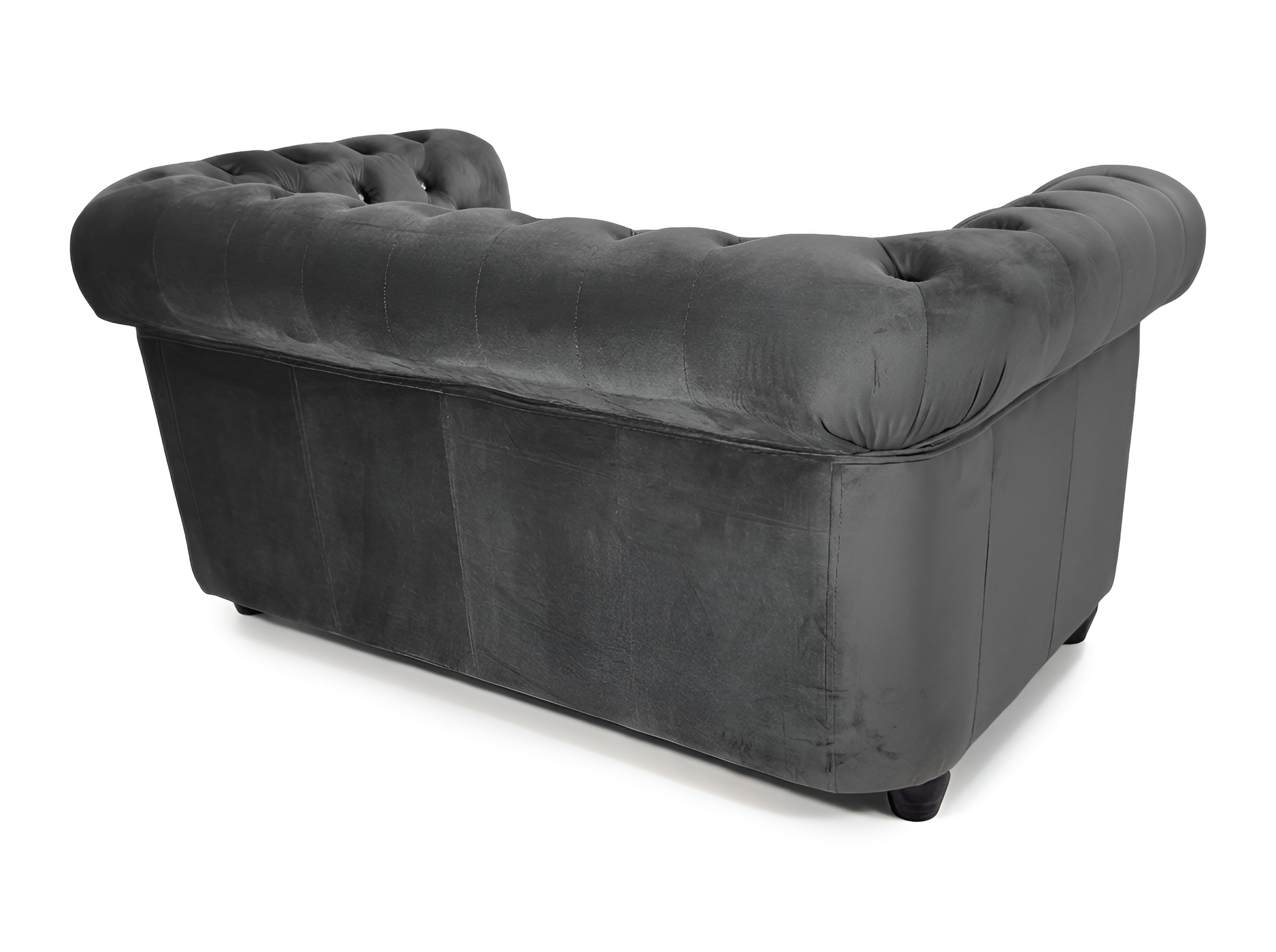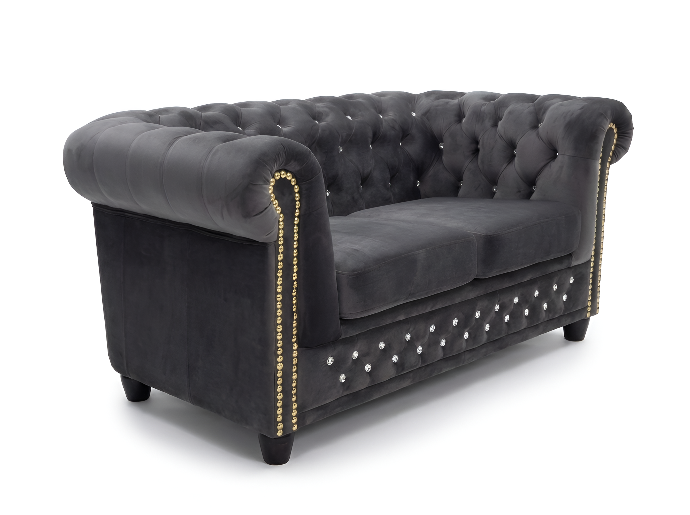 Charakterystyczne głębokie pikowanie, zdobiące całe oparcie i podłokietniki, jest znakiem rozpoznawczym stylu Chesterfield i nadaje sofie wyjątkowej głębi oraz prestiżu. Luksusowy charakter mebla podkreślają metalowe elementy dekoracyjne: wzdłuż podłokietników biegną lśniące złote nity (ćwieki), a pikowanie sofy ozdobione zostało efektownymi, błyszczącymi srebrnymi kryształkami.