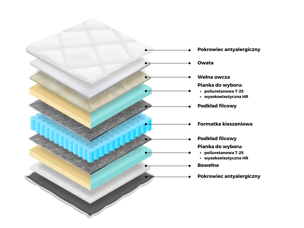 Pianka HR - to pianka wysokoelastyczna, która charakteryzuje się wysoką gęstością i trwałością. Wypełnienie materaca pianką HR pozwala na utrzymanie optymalnego kształtu materaca oraz zapewnienie odpowiedniego podparcia dla ciała podczas snu.