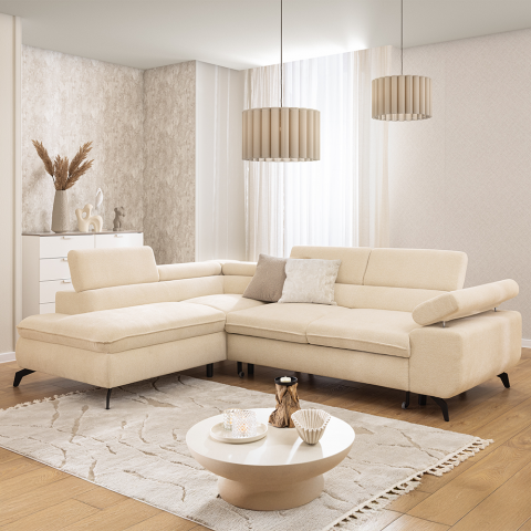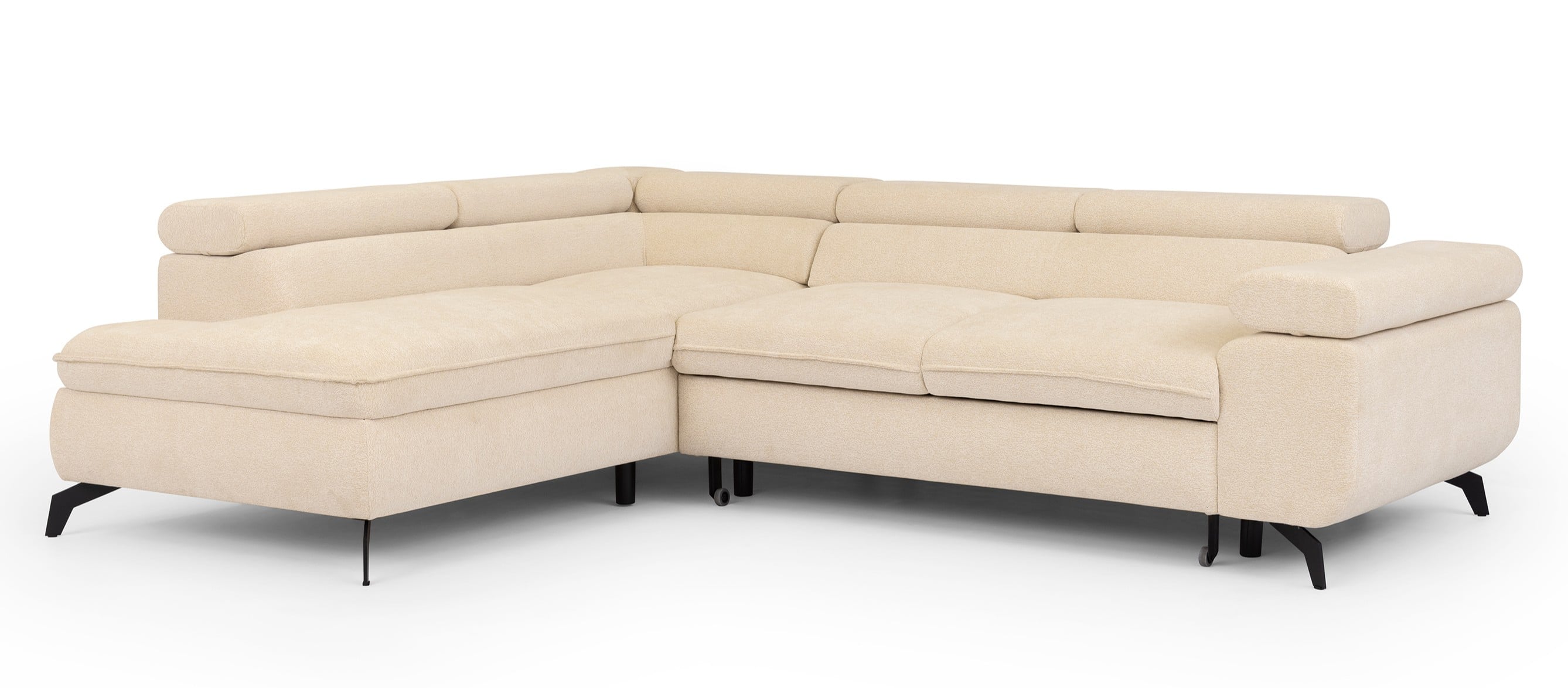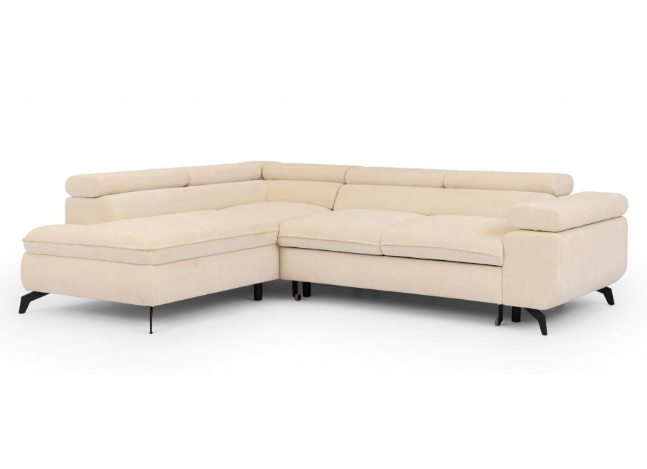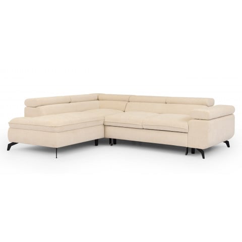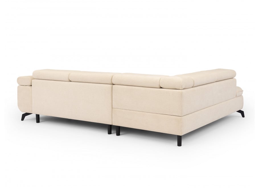 Stabilna konstrukcja narożnika wykonana jest z litego drewna, płyty MDF, HDF oraz sklejki, co gwarantuje wieloletnie i niezawodne użytkowanie. Narożnik Melvano dostępny jest w wersji prawej lub lewej, co ułatwia jego idealne wkomponowanie w przestrzeń. Ten beżowy model z funkcją spania i pojemnikiem to elegancki element wystroju, który wprowadzi do salonu atmosferę relaksu, nowoczesnego komfortu i subtelnego stylu.