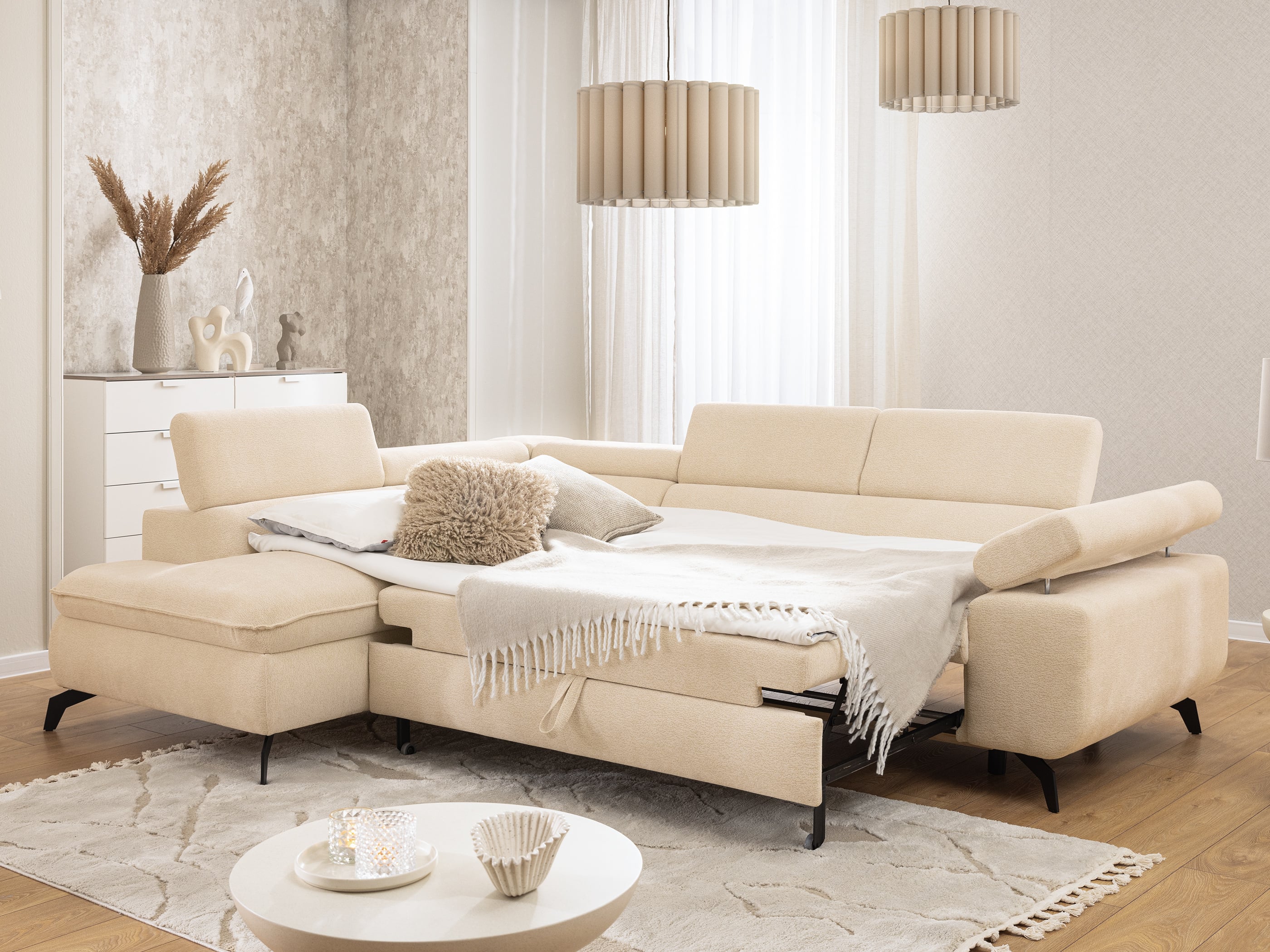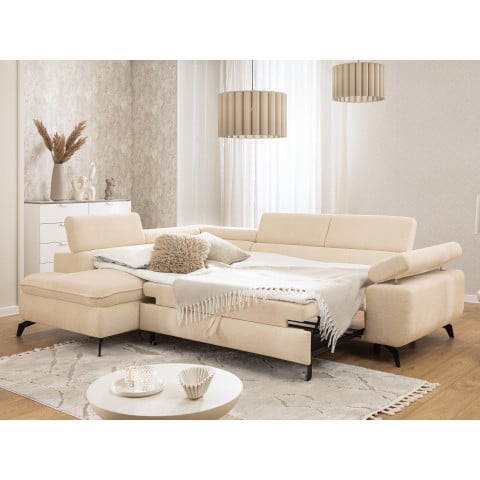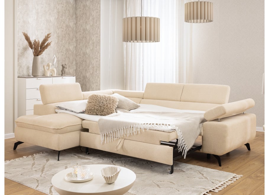 Kluczowym atutem narożnika jest praktyczna funkcja spania, która pozwala na błyskawiczną transformację w komfortowe łóżko dla gości lub domowników. Dodatkowo, pojemny schowek na pościel stanowi idealne miejsce do przechowywania poduszek, koców i kołder, ułatwiając utrzymanie porządku w salonie. Komfort użytkowania podnoszą regulowane zagłówki i ruchomy podłokietnik, umożliwiające personalizację pozycji – idealne rozwiązanie dla tych, którzy cenią możliwość dopasowania mebla do indywidualnych potrzeb.