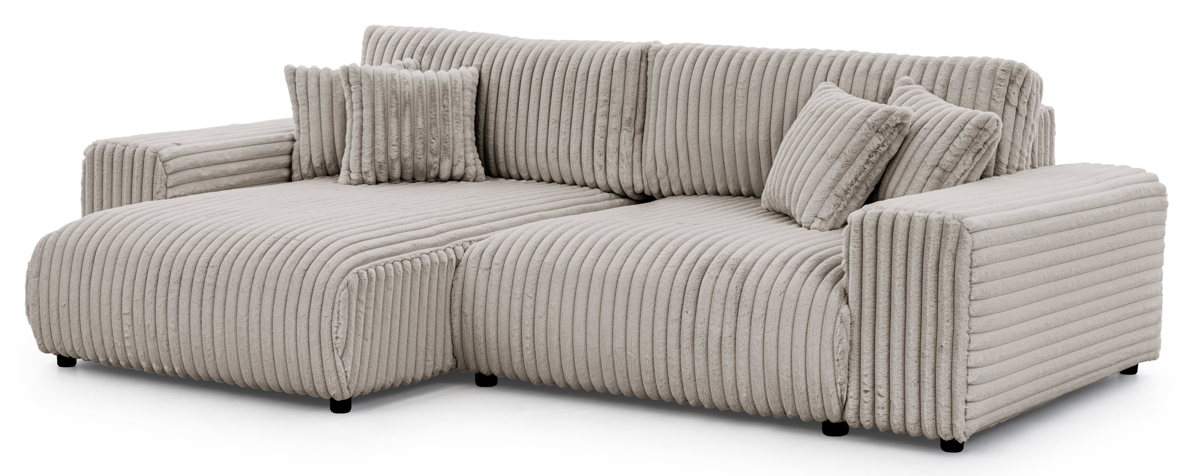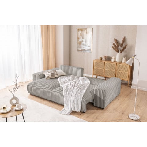Narożnik posiada wbudowaną funkcję spania, dzięki której błyskawicznie zorganizujesz wygodne miejsce noclegowe dla gości lub członków rodziny. Dodatkowym atutem jest przestronny pojemnik na pościel, który umożliwia łatwe przechowywanie kołder, koców czy poduszek, pomagając utrzymać porządek w salonie. Szary kolor tapicerki jest klasyczny i elegancki. Konstrukcja z uniwersalną otomaną pozwala na dowolną konfigurację ustawienia (lewostronną lub prawostronną), co ułatwia idealne dopasowanie narożnika do wymiarów i układu każdego pomieszczenia.