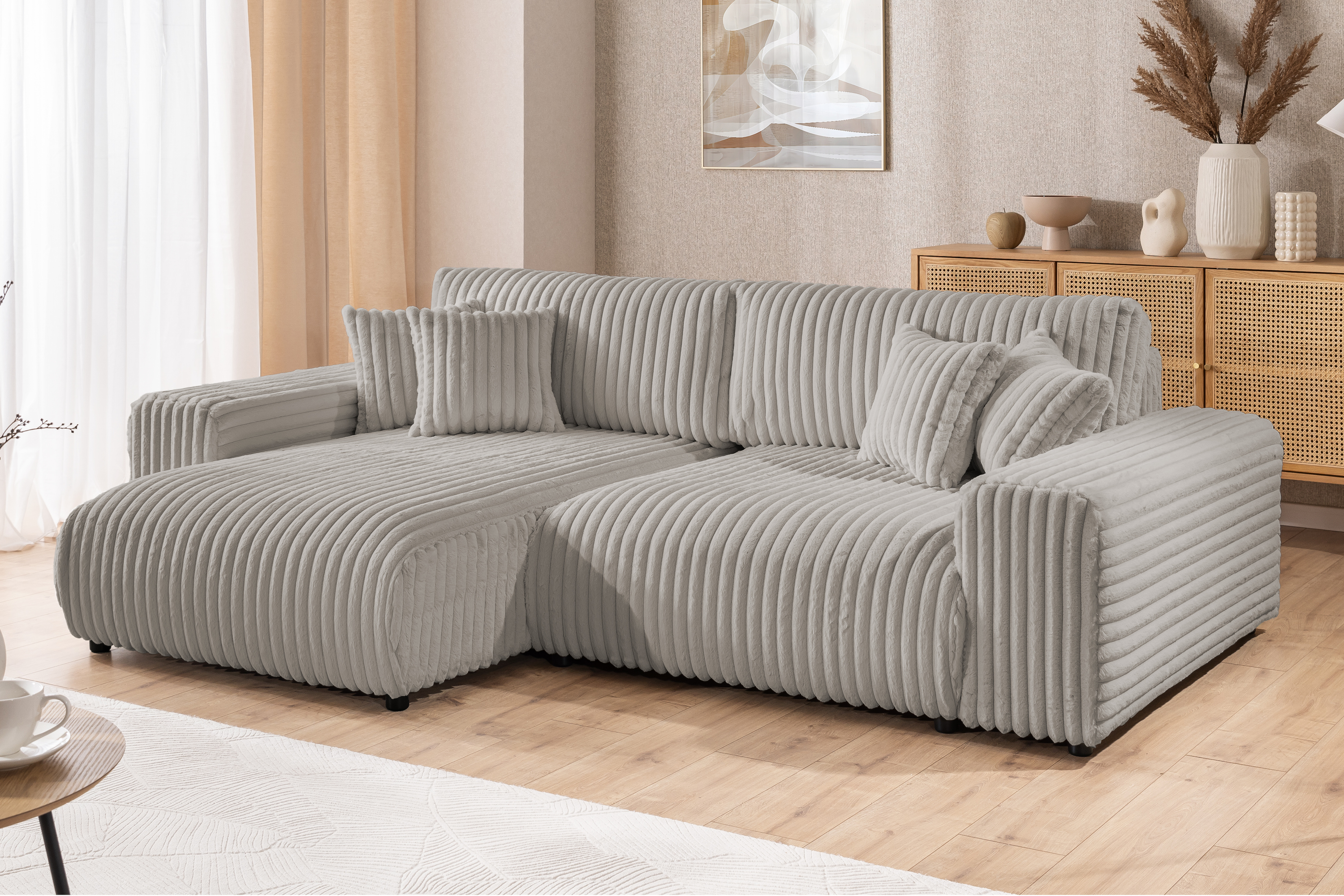 Wprowadź do swojej strefy relaksu nowy wymiar komfortu, wybierając narożnik Nubo, który zachwyca wyjątkową formą i praktycznymi rozwiązaniami. Ten elegancki mebel, o uniwersalnym kształcie litery L, łączy nowoczesny design z miękkimi, przytulnymi liniami, tworząc atmosferę luksusowego wypoczynku. Siedzisko i oparcie zostały starannie zaprojektowane i wykonane z wysokoelastycznej pianki poliuretanowej, co zapewnia optymalne podparcie ciała i gwarantuje wyjątkową wygodę podczas codziennego relaksu.