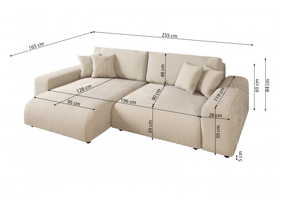 Konstrukcja szkieletu wykonana jest z wysokiej jakości materiałów, takich jak drewno lite, sklejka, płyty wiórowe, MDF i HDF, co zapewnia niezawodną wytrzymałość oraz odporność na lata intensywnego użytkowania. Nubo w beżowym kolorze z łatwością harmonizuje z różnorodnymi aranżacjami wnętrz. Ten narożnik to więcej niż tylko mebel – to miejsce spotkań i wypoczynku, które dzięki ponadczasowemu designowi, funkcjonalności i przytulnemu beżowemu odcieniowi stanie się sercem Twojego domu.