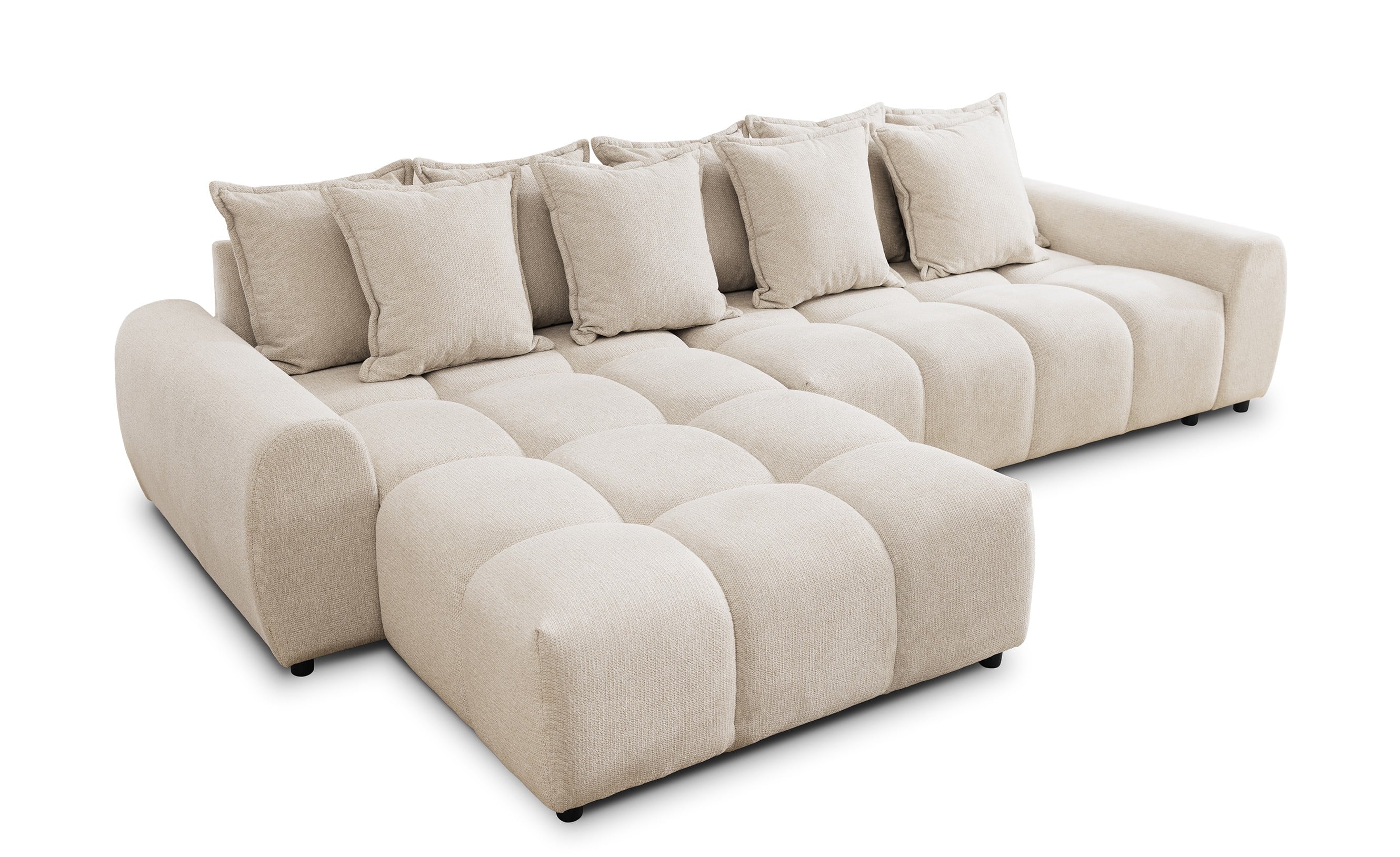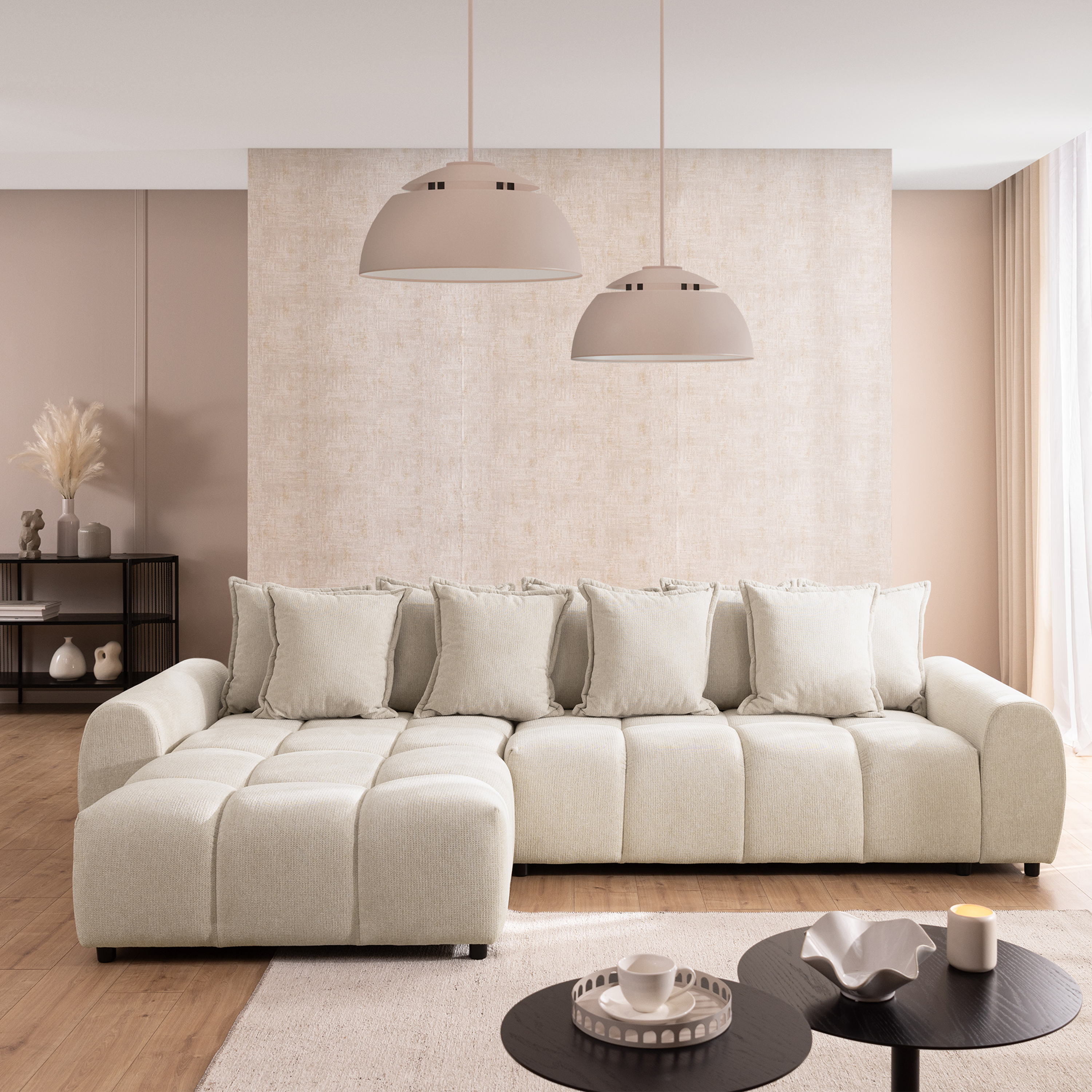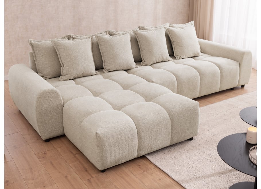 Wprowadź do swojego wnętrza powiew luksusu i harmonii dzięki narożnikowi Mallow, który w prezentowanej, beżowej odsłonie staje się kwintesencją przytulnego minimalizmu. Ten wyjątkowy mebel przyciąga wzrok swoimi charakterystycznymi, geometrycznymi pikowaniami, które nadają całej bryle miękkości i sprawiają, że przypomina ona puszystą chmurę. Dzięki niskiej linii oparcia i zaokrąglonym krawędziom projekt ten doskonale odnajdzie się w salonach urządzonych w duchu modern classic lub surowego loftu. Dla zapewnienia maksymalnej wygody podczas planowania przestrzeni, strona narożnika jest w pełni konfigurowalna (lewa lub prawa), co gwarantuje idealne dopasowanie do układu Twojego pokoju dziennego.