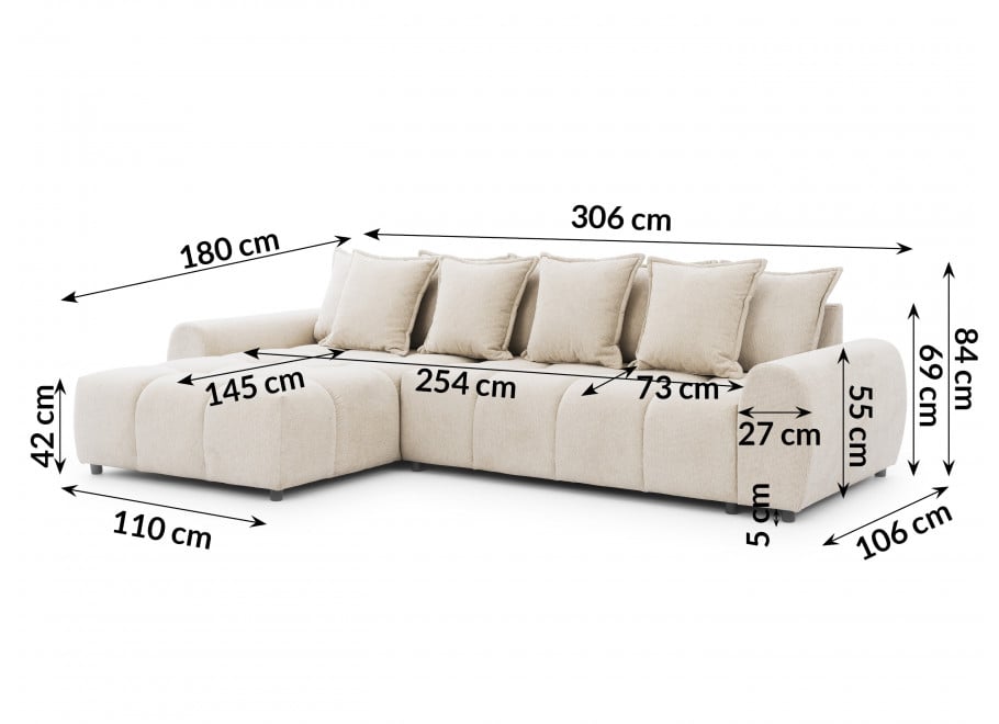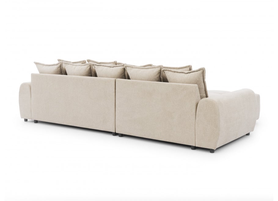 Wytrzymałość narożnika Mallow to zasługa przemyślanej konstrukcji opartej na solidnym stelażu z litego drewna, sklejki oraz wytrzymałych płyt MDF, HDF i wiórowych. Solidna baza idzie w parze z funkcjonalnością – po dokupieniu dedykowanego hockera, mebel zyskuje praktyczną opcję spania, tworząc rozległą powierzchnię idealną do nocnego wypoczynku lub seansów filmowych w gronie bliskich. Wyjątkowy charakter modelu podkreśla beżowa tkanina Aragon, która jako nowoczesna plecionka szenilowa zachwyca melanżowym splotem. Materiał ten posiada powłokę hydrofobową (Water Repellent), która blokuje wsiąkanie rozlanych płynów, ułatwiając utrzymanie czystości, a certyfikaty OEKO-TEX oraz REACH potwierdzają najwyższą jakość i bezpieczeństwo użytkowania materiału.