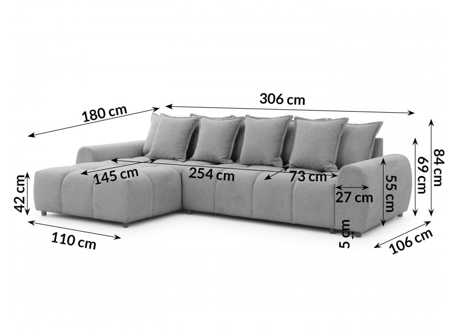 Za potęgę komfortu odpowiada zestaw 9 poduszek oparciowych o wymiarach 55x55x15 cm, które wypełniono profesjonalną mieszanką silikonu i pianki. Takie połączenie zapewnia idealne podparcie kręgosłupa i miękkość, która nie znika z czasem. Siedzisko bazuje na systemie sprężyn falistych oraz piance poliuretanowej o wysokiej elastyczności, co jest gwarancją komfortu i braku odkształceń. Całość opiera się na wieloskładnikowym stelażu z litego drewna, sklejki i płyt HDF/MDF, co świadczy o najwyższej jakości wykonania.