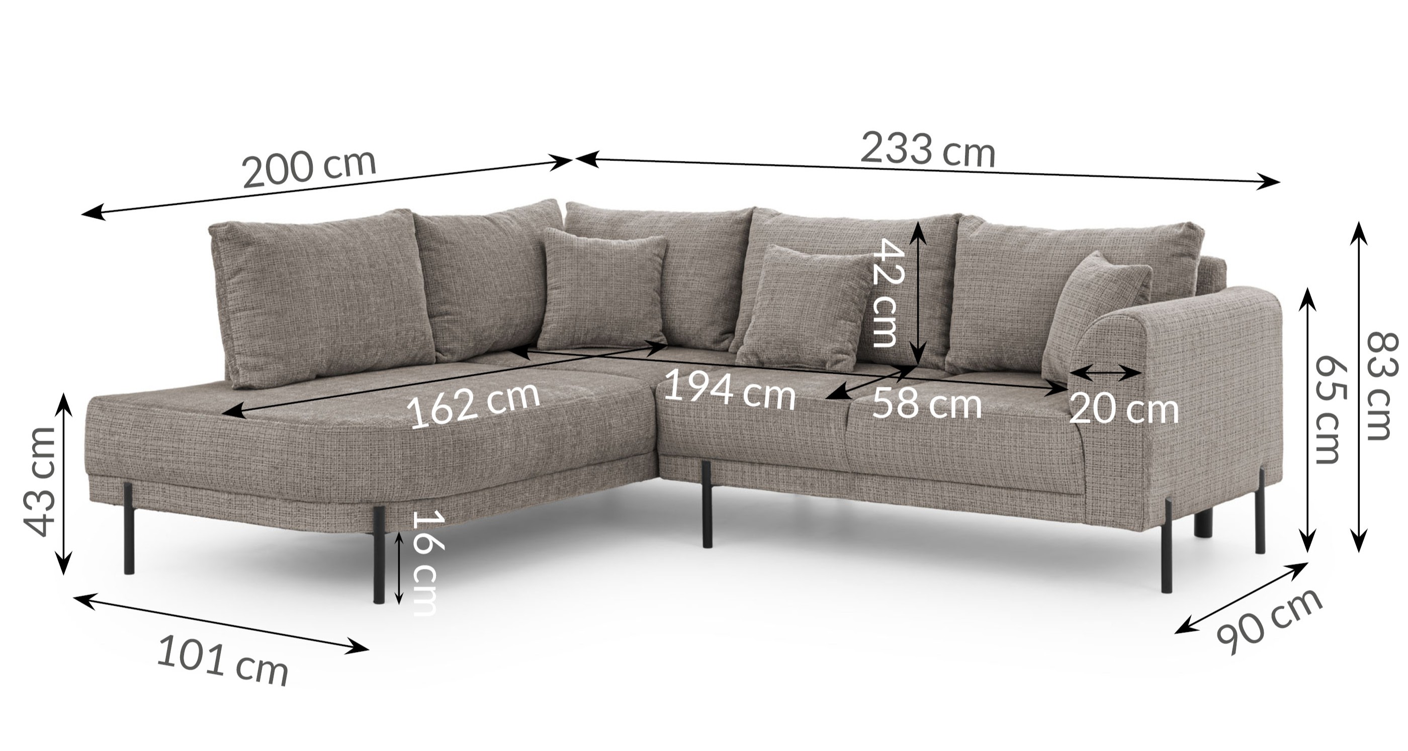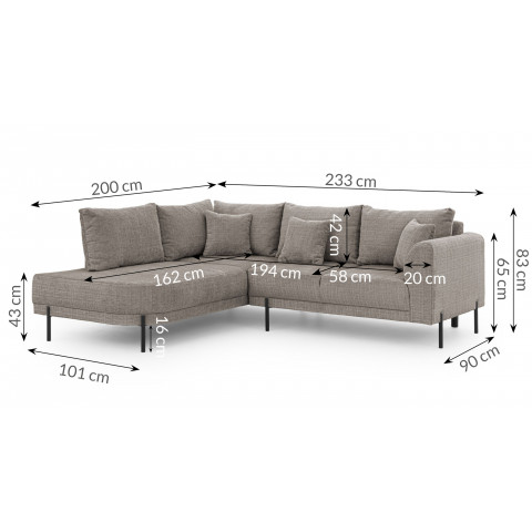 Wnętrze narożnika kryje system zapewniający maksymalny komfort: piankę wysokoelastyczną oraz sprężyny faliste. To zestawienie sprawia, że siedzisko jest sprężyste i idealnie podpiera ciało w każdej pozycji. Oparcie tworzą komfortowe, luźne poduszki z wkładem piankowo-silikonowym, oferujące miękkość, w której można się dosłownie zanurzyć. Trwałość całej jednostki zapewnia wieloskładnikowy stelaż z drewna litego, sklejki i płyt meblowych (MDF, HDF, wiórowa), będący gwarancją wieloletniej wytrzymałości.