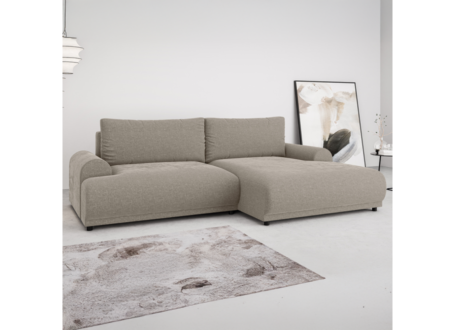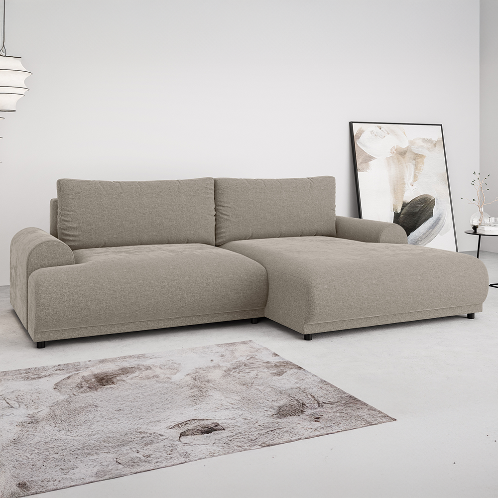 Fundamentem trwałości tego modelu jest solidny stelaż, do którego produkcji wykorzystano wyselekcjonowane materiały: lite drewno, sklejka oraz płyty MDF, HDF i wiórową. Taka konstrukcja to gwarancja stabilności przez długie lata. Za wyjątkowe wrażenia podczas odpoczynku odpowiada wypełnienie z wysokoelastycznej pianki poliuretanowej, która znajduje się zarówno w siedziskach, jak i oparciach. Materiał ten idealnie dopasowuje się do sylwetki, oferując optymalne podparcie ciała bez względu na to, czy siedzisz, czy leżysz. Prezentowany beżowy narożnik to nie tylko design, ale przede wszystkim funkcjonalność – model posiada intuicyjną funkcję spania, która pozwala w kilka sekund przeobrazić strefę relaksu w pełnowymiarowe miejsce do nocnego wypoczynku. Dodatkowym atutem jest zintegrowany, pojemny schowek na pościel, który pomaga utrzymać nienaganny porządek w salonie, oferując miejsce na zapasowe tekstylia, kołdry czy poduszki.