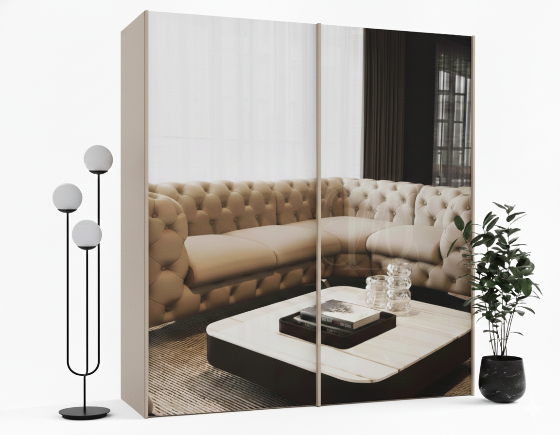 Szafa ALFA PREMIUM o imponującej wysokości 265 cm i szerokości 200 cm to połączenie nowoczesnej estetyki z wyjątkową trwałością. Wykonana z wysokiej jakości płyty wiórowej o grubości 18 mm, pokrytej laminatem, zapewnia solidność i długowieczność na lata. Zastosowany laminat nie tylko nadaje meblowi elegancki wygląd, ale również skutecznie chroni powierzchnię przed zarysowaniami i wilgocią. Fronty szafy wyposażone w duże lustra optycznie powiększają przestrzeń, łącząc funkcjonalność z efektownym designem.