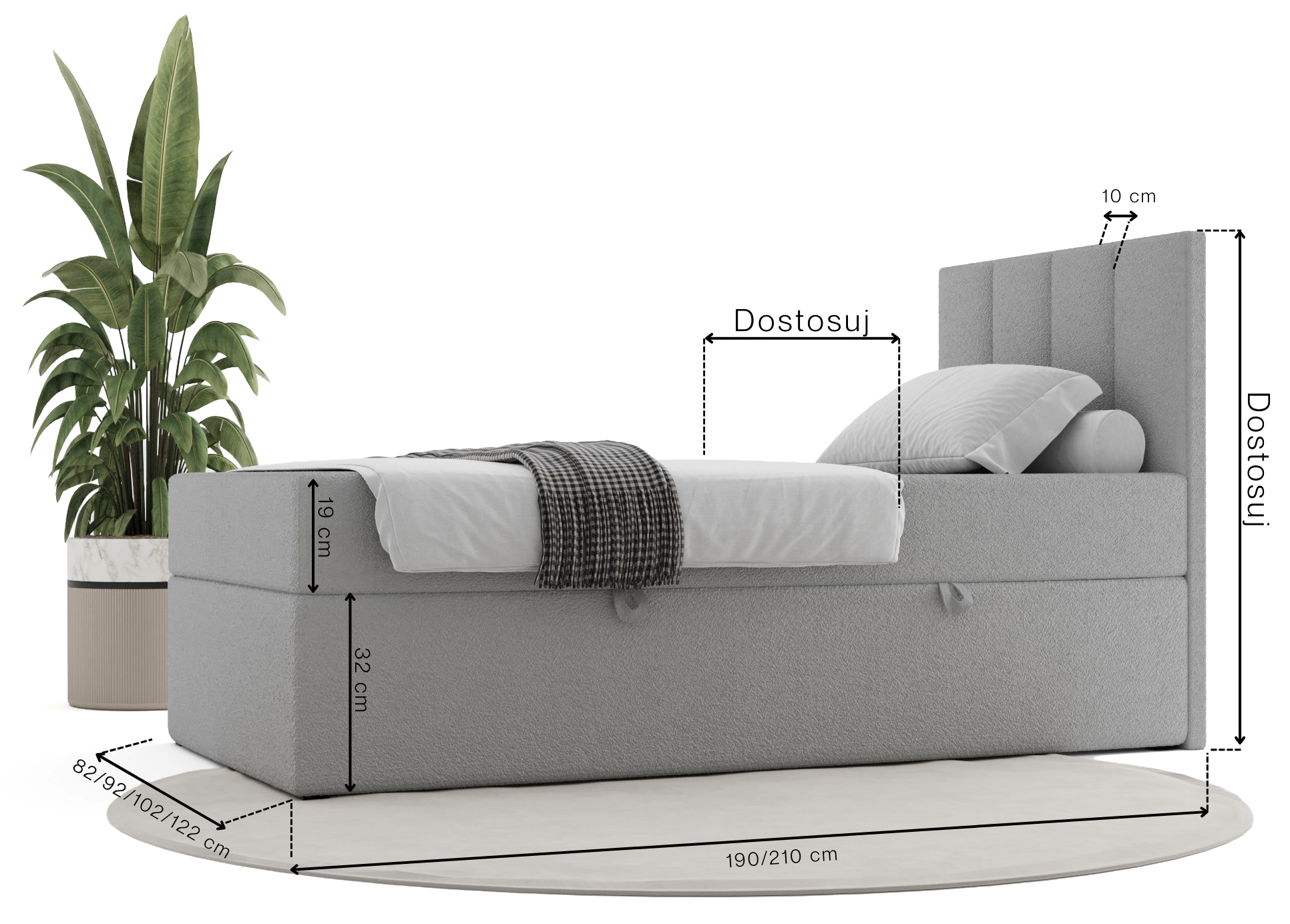 Wiemy, że każde pomieszczenie ma swoje unikalne wymagania, dlatego model Atlanta Comfort to łóżko dla dzieci, które możesz w pełni spersonalizować według własnych potrzeb. Jako polski producent stawiamy na podejście typu łóżka na wymiar, oferując aż osiem wariantów szerokości i długości, od kompaktowych 80x180 po bardzo przestronne 120x200, które idealnie sprawdzą się jako łóżka młodzieżowe dla nastolatków potrzebujących więcej swobody. Unikalną cechą tego modelu jest możliwość wyboru wysokości wezgłowia spośród trzech opcji: 80 cm, 90 cm lub 100 cm, co pozwala dopasować mebel do skosów na poddaszu lub preferencji estetycznych. Projektując to łóżko dla dziewczynki lub chłopca, sam decydujesz również o stronie otwierania pojemnika, wybierając stronę lewą lub prawą, co pozwala na idealne ustawienie mebla względem ścian i innych elementów wyposażenia.