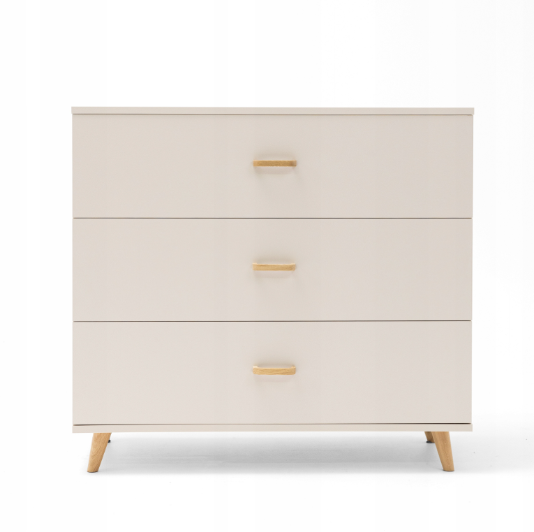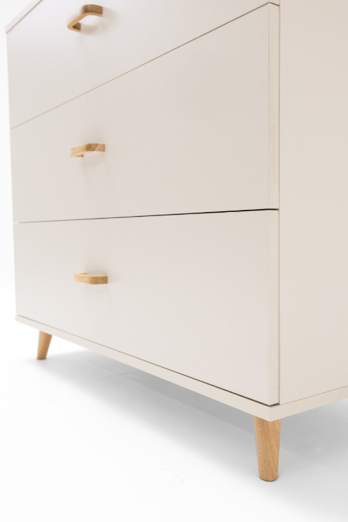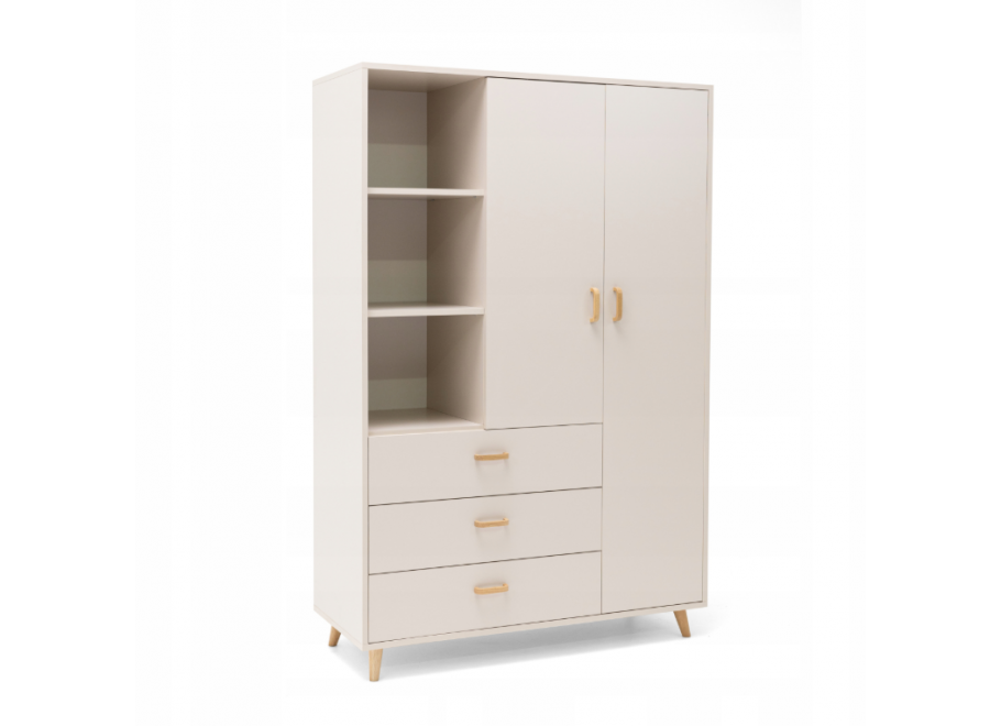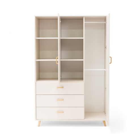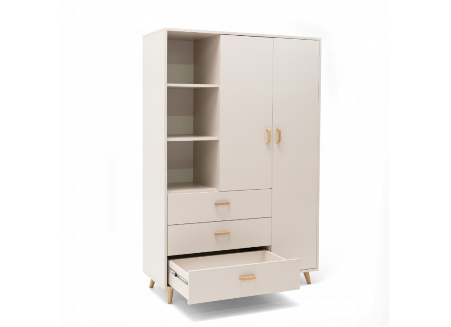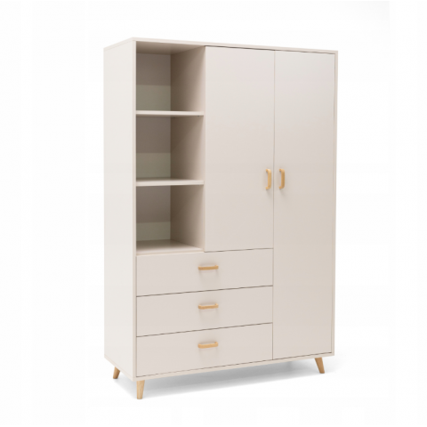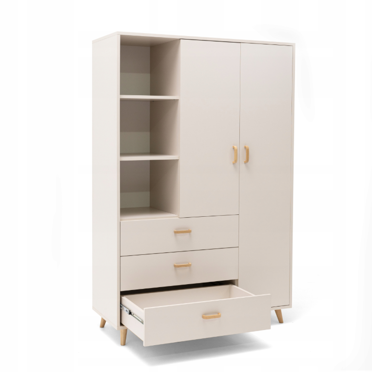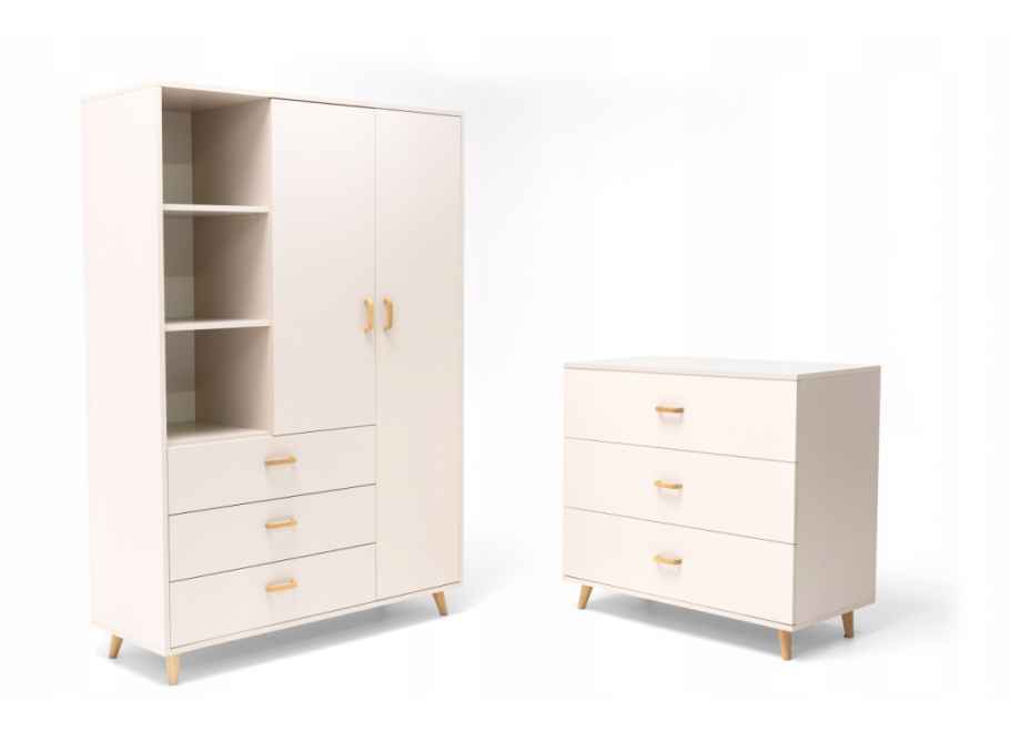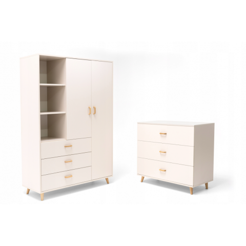 Ten stylowy komplet mebli to kwintesencja nowoczesnego designu inspirowanego nurtem skandynawskim, który w elegancki sposób łączy minimalistyczną formę z wyjątkową użytecznością. Zestaw składa się z wielofunkcyjnej szafy-garderoby oraz dopasowanej komody, tworząc spójną i harmonijną aranżację idealną do sypialni, pokoju dziecięcego czy przedpokoju. Szafa wyróżnia się asymetryczną, segmentową budową, oferując otwarty regał z półkami, pojemną szafkę górną, trzy szuflady oraz wysoki moduł boczny na ubrania wiszące. Komoda stanowi doskonałe dopełnienie zestawu, zapewniając trzy dodatkowe, głębokie szuflady na bieliznę, dokumenty lub domowe tekstylia.