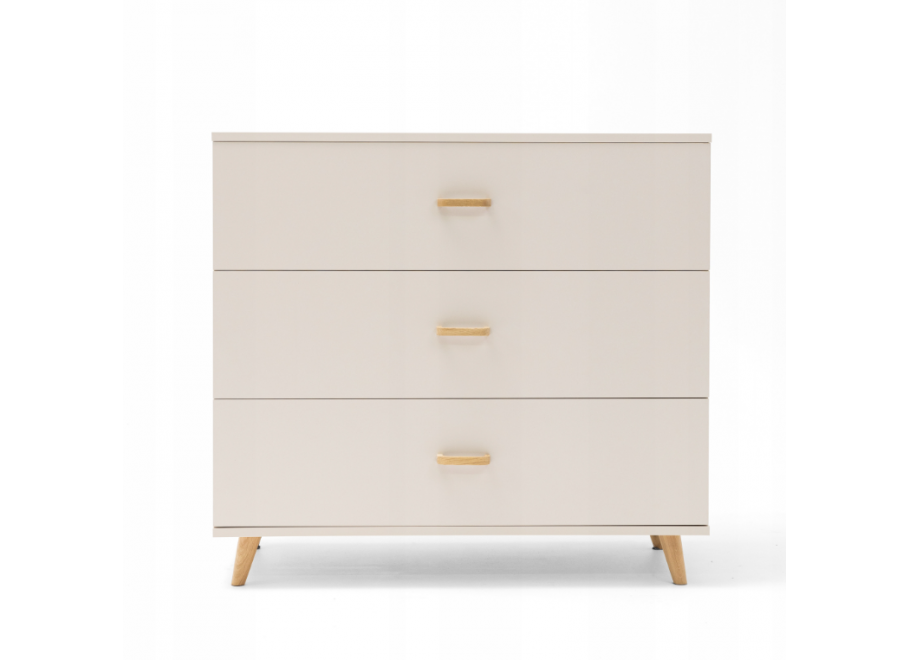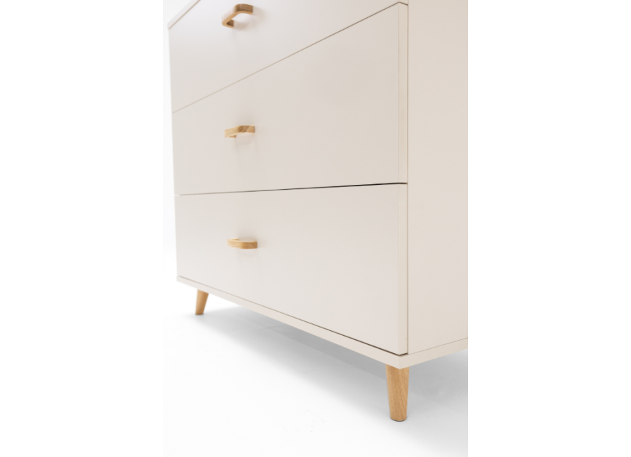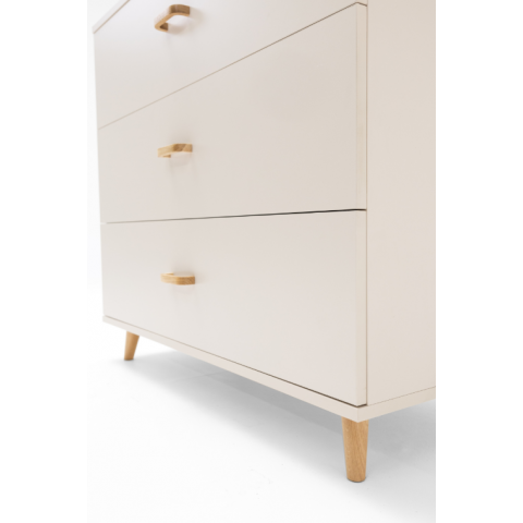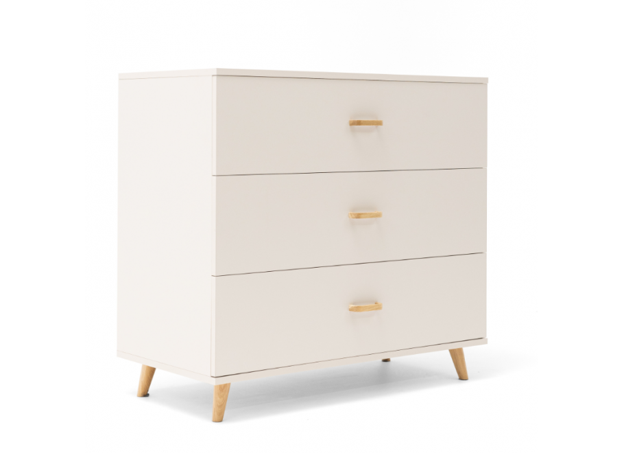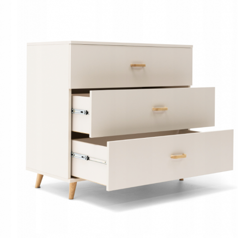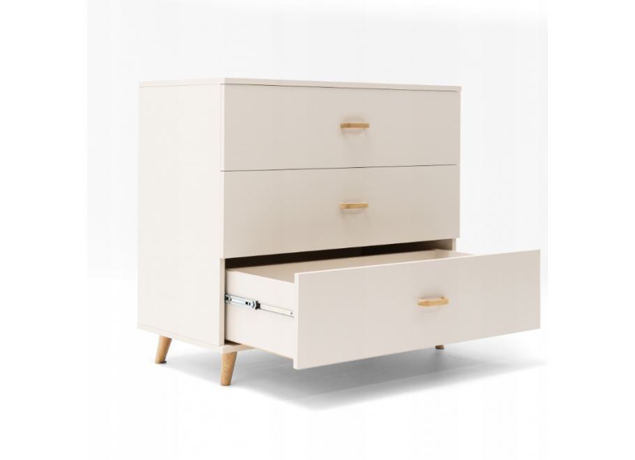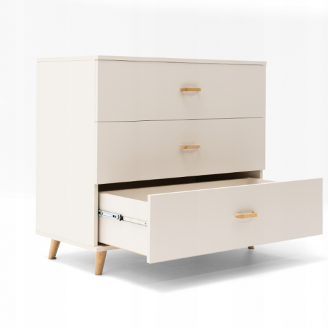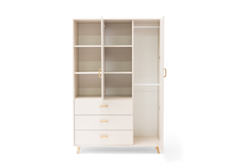 Ten stylowy komplet mebli to kwintesencja nowoczesnego designu inspirowanego nurtem skandynawskim, który w elegancki sposób łączy minimalistyczną formę z wyjątkową użytecznością. Zestaw składa się z wielofunkcyjnej szafy-garderoby oraz dopasowanej komody, tworząc spójną i harmonijną aranżację idealną do sypialni, pokoju dziecięcego czy przedpokoju. Szafa wyróżnia się asymetryczną, segmentową budową, oferując otwarty regał z półkami, pojemną szafkę górną, trzy szuflady oraz wysoki moduł boczny na ubrania wiszące. Komoda stanowi doskonałe dopełnienie zestawu, zapewniając trzy dodatkowe, głębokie szuflady na bieliznę, dokumenty lub domowe tekstylia.