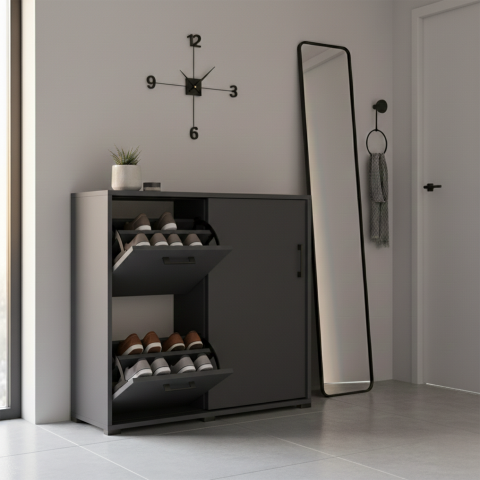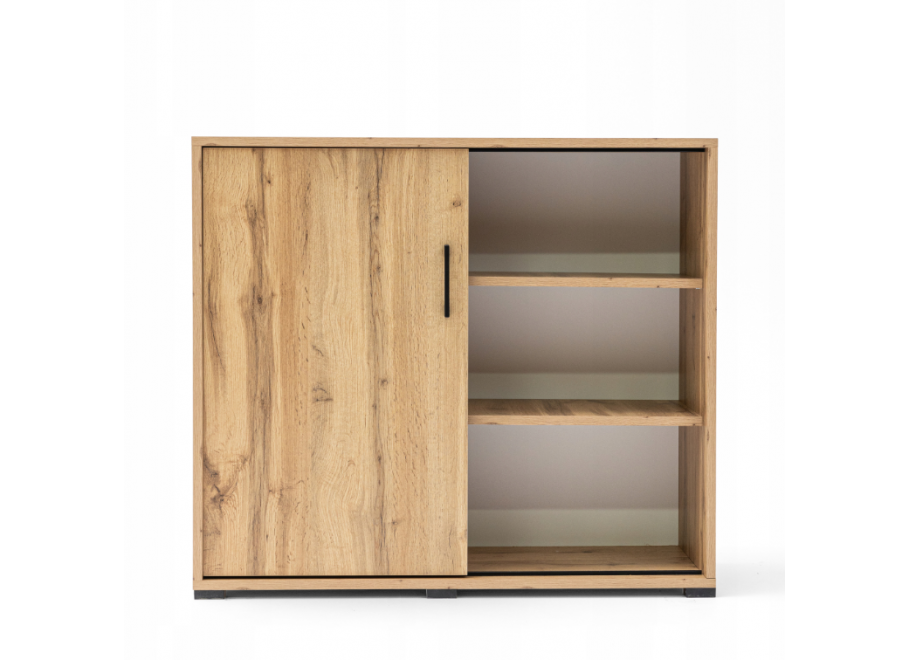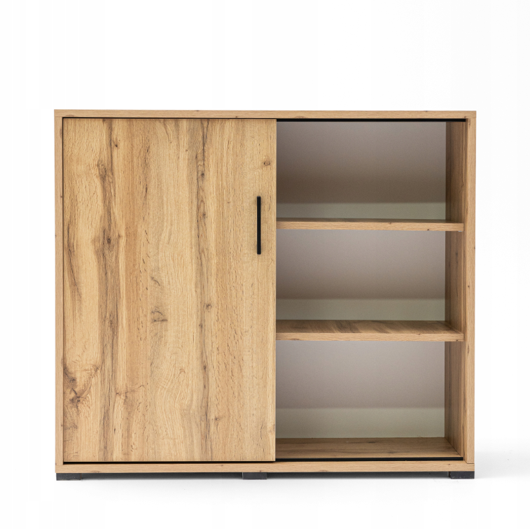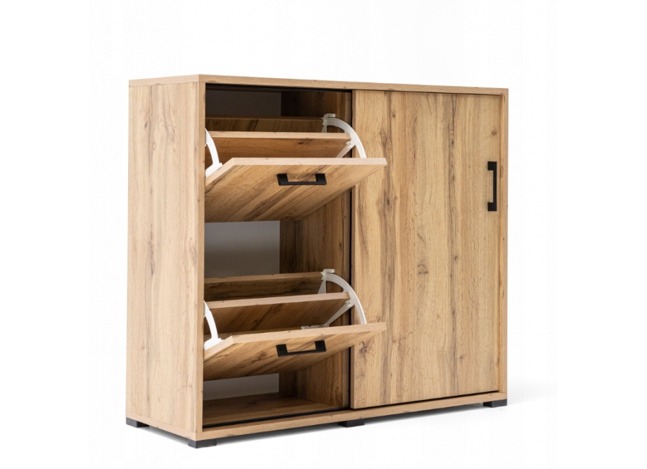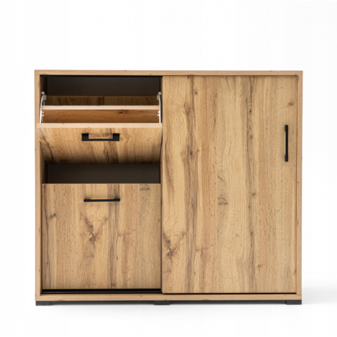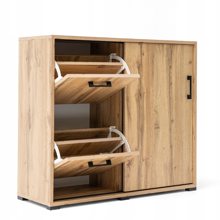 Ta kompaktowa szafka na buty z serii Naomi to idealne rozwiązanie do mniejszych przedpokojów, gdzie liczy się każdy centymetr kwadratowy bez kompromisów w kwestii stylu. Mebel utrzymany jest w ciepłym, dębowym dekorze o wyraźnym rysunku drewna, który w połączeniu z czarnymi, minimalistycznymi uchwytami tworzy nowoczesną i przytulną atmosferę już od progu domu. Konstrukcja szafki została zoptymalizowana pod kątem różnorodnych potrzeb: lewa strona oferuje dwa uchylne fronty z dwurzędowymi koszami na obuwie codzienne, natomiast prawa strona kryje przesuwny moduł drzwiowy, doskonały na wyższe buty lub akcesoria.