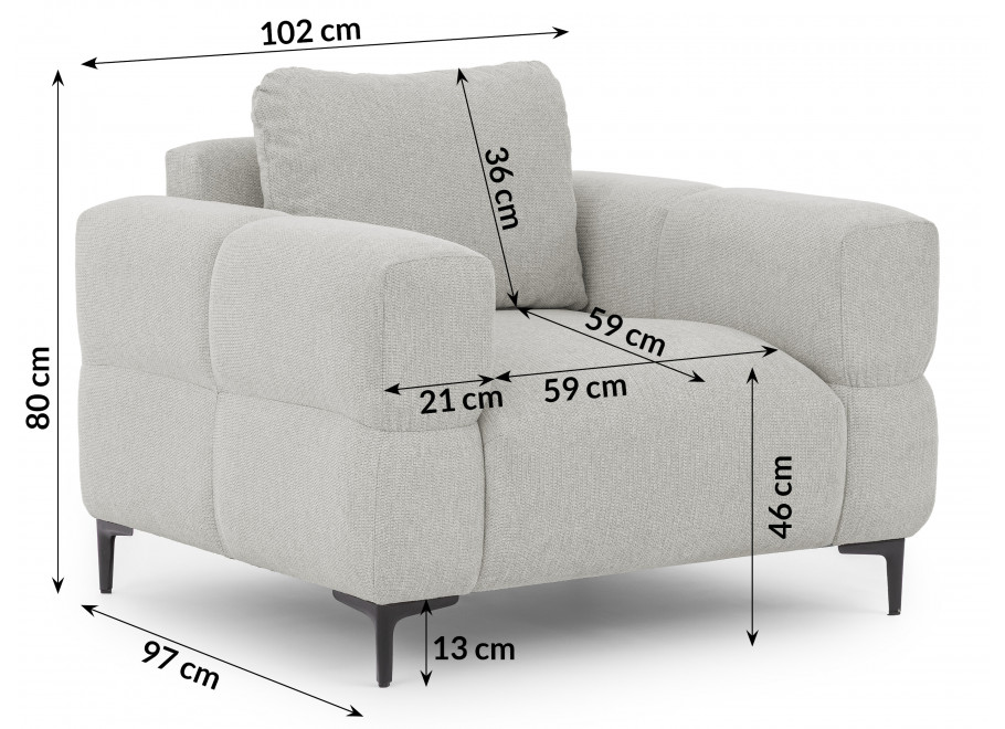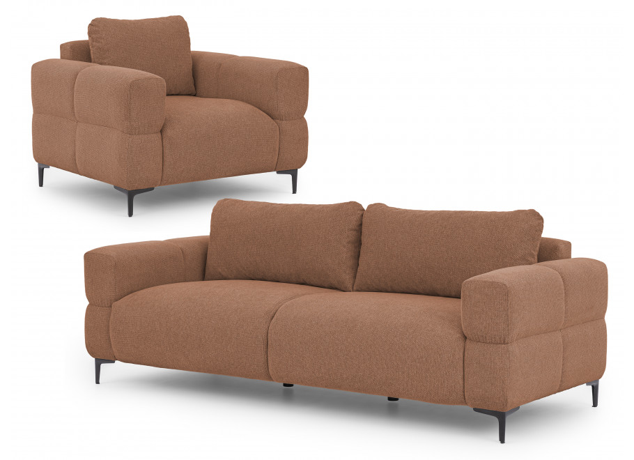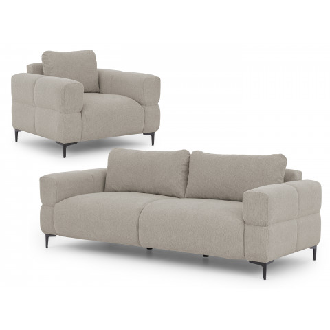 Każdy element zestawu został zaprojektowany z myślą o maksymalnym komforcie, jaki może zaoferować nowoczesna strefa relaksu. Siedziska wypełnia wysokoelastyczna pianka poliuretanowa oparta na wytrzymałych sprężynach falistych, co zapewnia idealny balans między miękkością a odpowiednim wsparciem ciała. Za wyjątkową przytulność odpowiadają luźne poduszki oparciowe wypełnione mieszanką pianki i silikonu, które pozwalają zatopić się w relaksie po długim dniu. Solidna konstrukcja każdego mebla, wykonana z drewna litego, sklejki oraz płyt MDF i HDF, gwarantuje, że zestaw będzie służył Twojej rodzinie przez długie lata. Co ważne, tył mebli jest otapicerowany tkaniną, co daje pełną swobodę w ustawieniu sofy i fotela – mogą one dumnie prezentować się nawet na środku otwartego salonu.