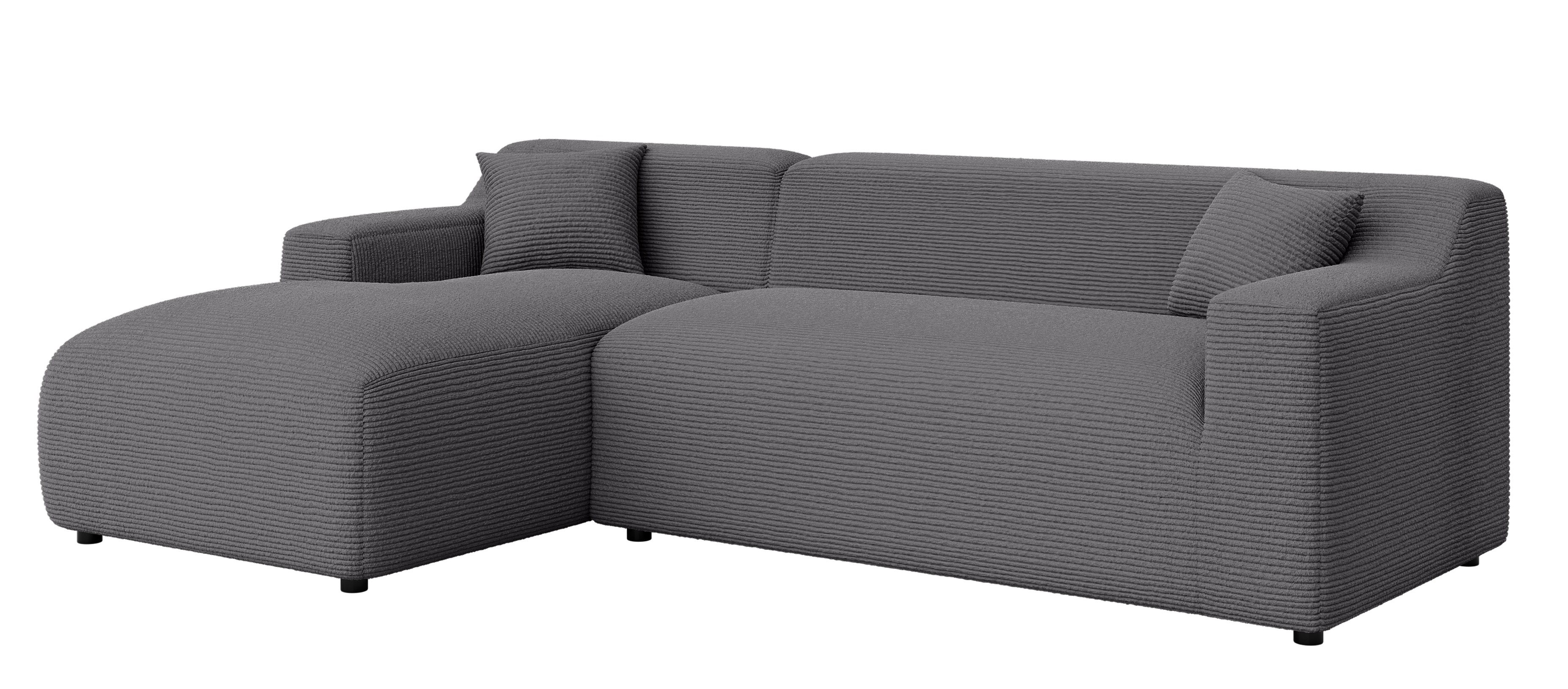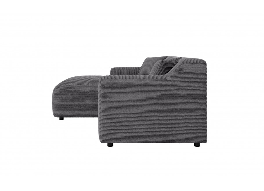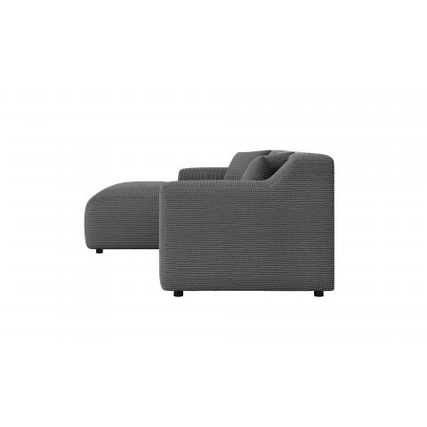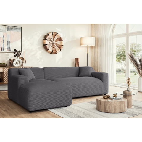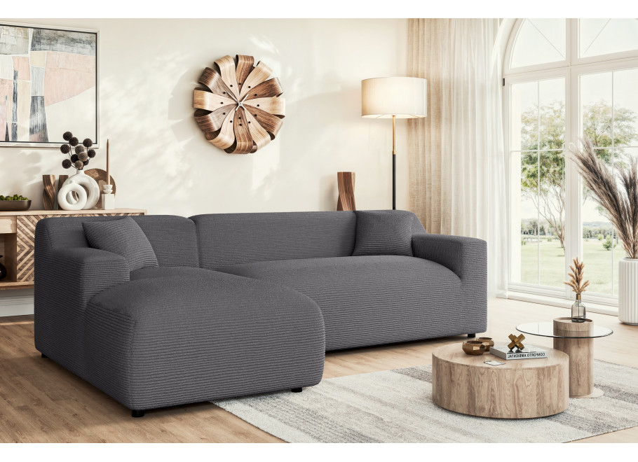 To, co wyróżnia ten model na tle innych, to tkanina Lincoln D – stylowy sztruks o szerokich prążkach (ok. 10 mm), który nadaje szaremu narożnikowi unikalnego charakteru 3D. Materiał o gramaturze 330g/m² cechuje się wysoką trwałością, jest odporny na ścieranie oraz działanie światła słonecznego, co zapobiega płowieniu koloru. Tkanina jest oddychająca i ogranicza szybkie wchłanianie rozlanych płynów, co czyni ten narożnik idealnym wyborem dla rodzin.