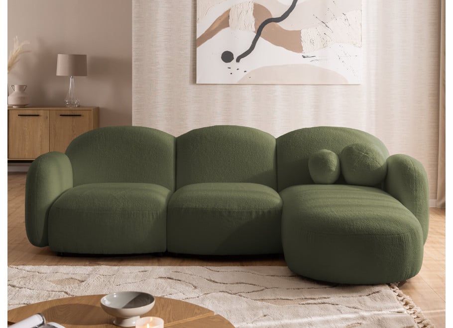 Zieleń w ciemnym wydaniu ma niezwykłe właściwości uspokajające. W połączeniu z miękką, fakturowaną tkaniną (np. typu boucle), narożnik Bloop tworzy wrażenie bezpiecznego azylu.