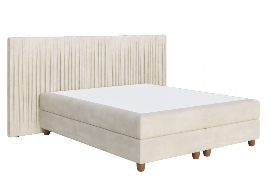 Największym atutem modelu Cascada jest jego dwuelementowe wezgłowie. Zastosowano tu innowacyjną technikę pionowego marszczenia tkaniny, która tworzy strukturę przypominającą kaskadę lub elegancką, plisowaną firanę. Dzięki takiemu rozwiązaniu, łóżko nabiera wizualnej lekkości i niezwykłej głębi, idealnie wpisując się w trendy luksusowych apartamentów.