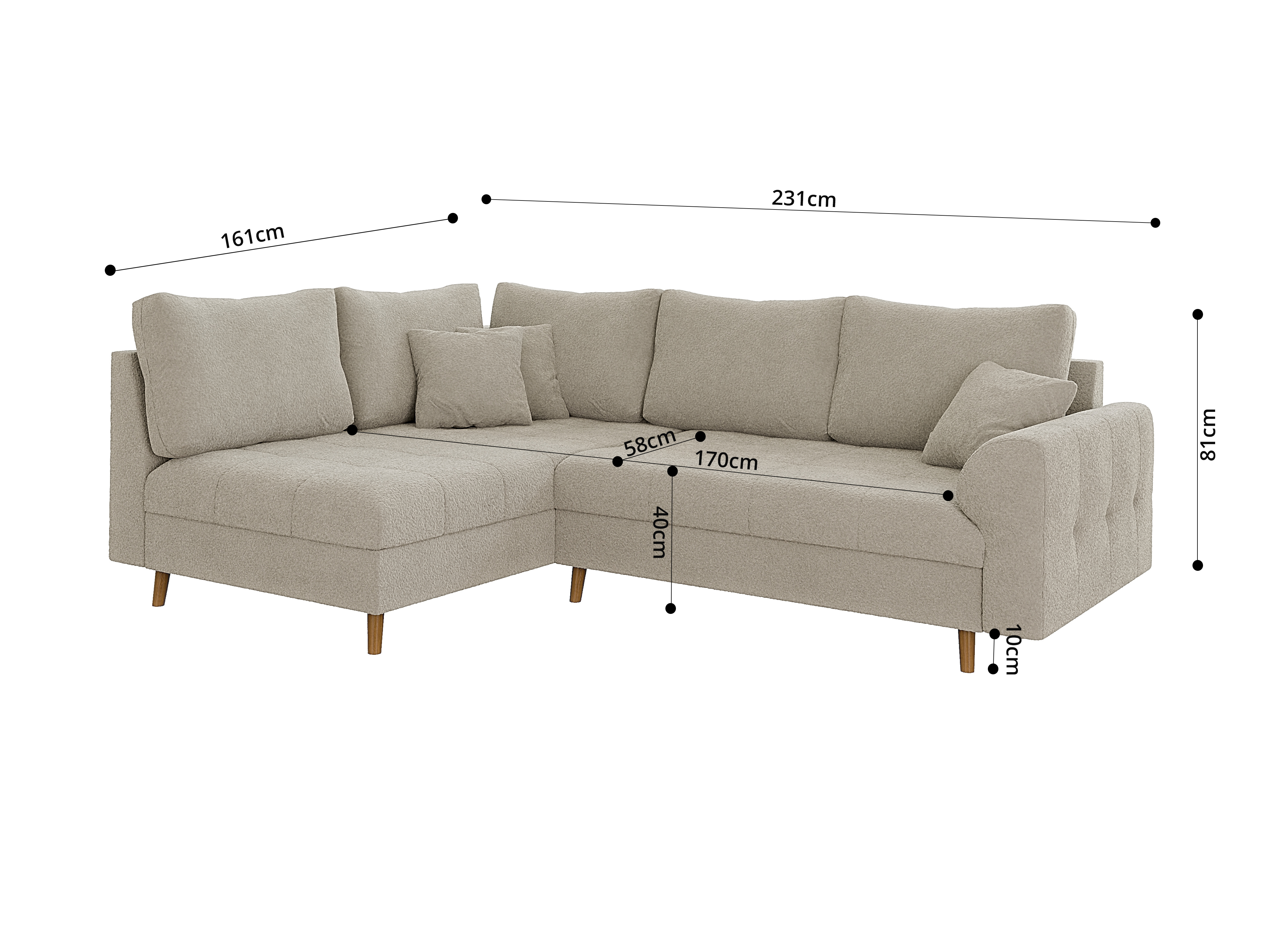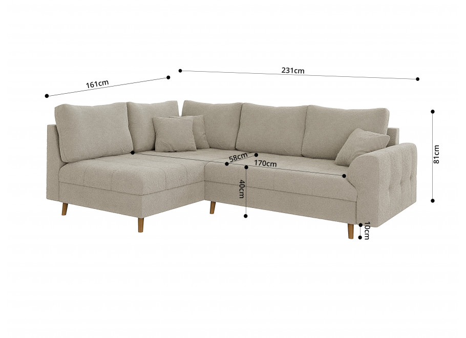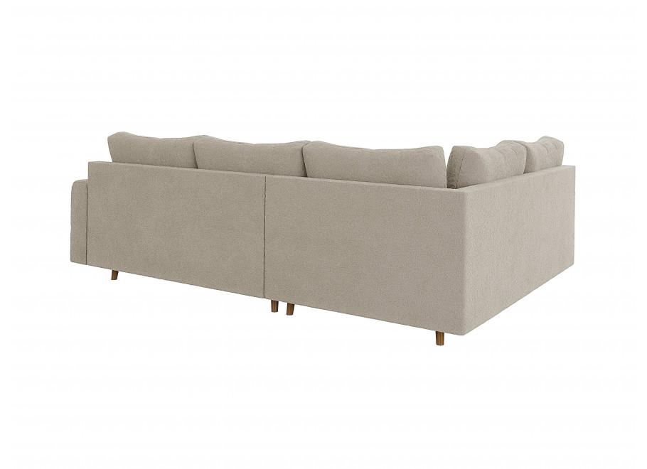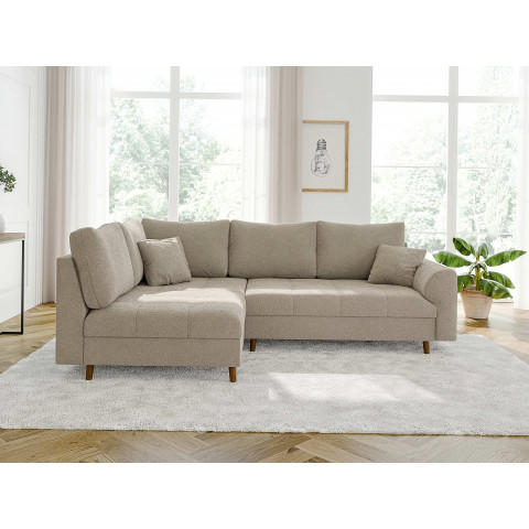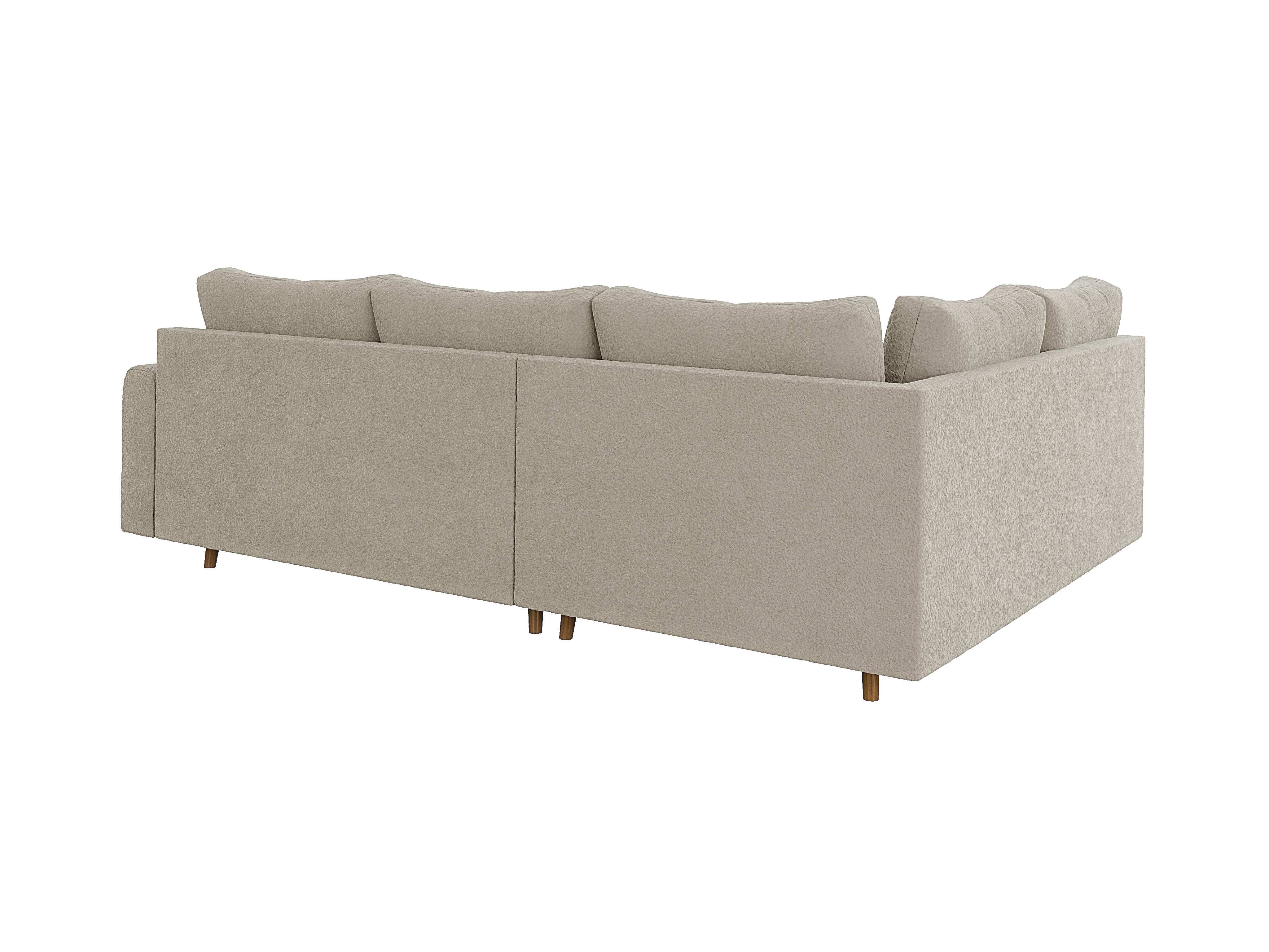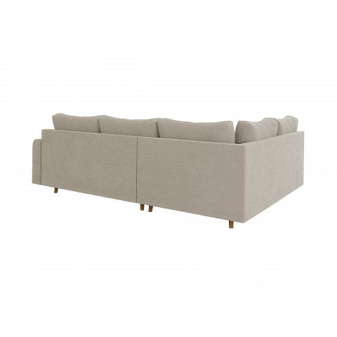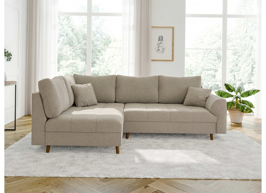 Wersja kolorystyczna szarobeżowy to idealny kompromis dla osób szukających barw neutralnych, ale z charakterem. Ten elegancki, nieoczywisty odcień doskonale maskuje ewentualne zabrudzenia i pięknie pracuje ze światłem, nadając wnętrzu wyrafinowanego sznytu. Wyjątkowość tego wariantu podkreśla zastosowana tkanina typu boucle – jest to materiał o grubym splotcie i charakterystycznej, mięsistej strukturze, która jest niesamowicie przyjemna i miękka w dotyku. Mimo swojej przytulnej faktury, tkanina wyróżnia się wysoką odpornością na ścieranie, co w połączeniu z kolorem szarobeżowym sprawia, że narożnik jest niezwykle praktyczny w codziennym użytkowaniu i zachowuje swoją estetykę przez lata.