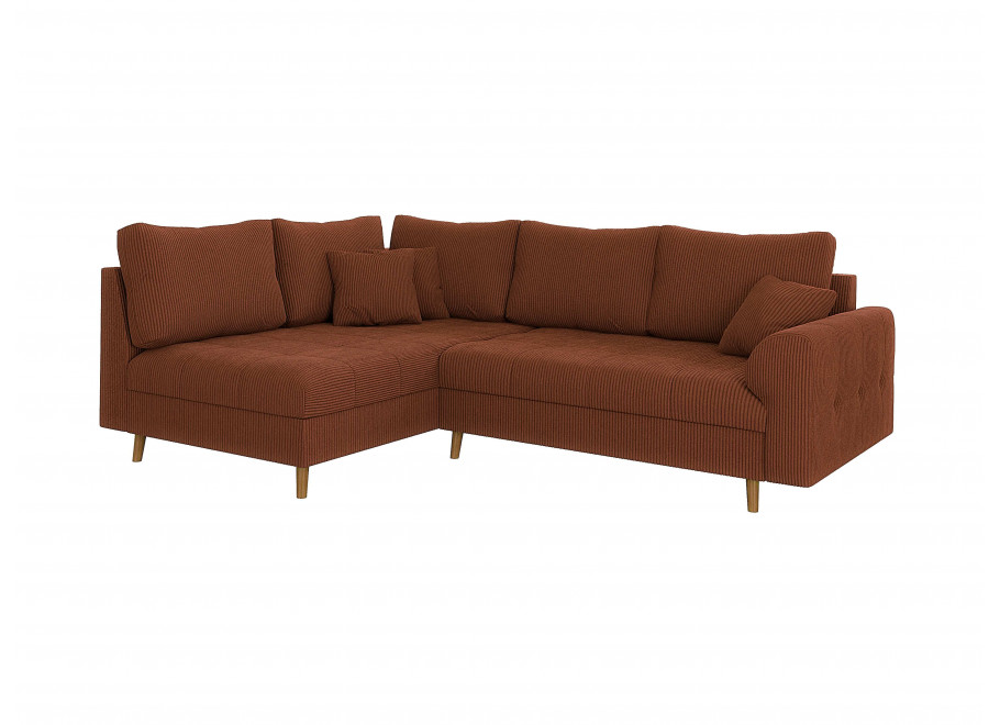 Konstrukcja mebla opiera się na solidnym fundamencie wykonanym z drewna litego, sklejki oraz wytrzymałych płyt MDF i HDF, co gwarantuje stabilność i trwałość na lata. Dopracowana strona estetyczna, w tym pikowane siedzisko, nadaje bryle nowoczesnego rytmu, a osadzenie mebla na eleganckich, drewnianych nóżkach dodaje mu wizualnej lekkości. Takie rozwiązanie nie tylko świetnie wygląda, ale jest też bardzo praktyczne, umożliwiając łatwe sprzątanie pod powierzchnią narożnika.