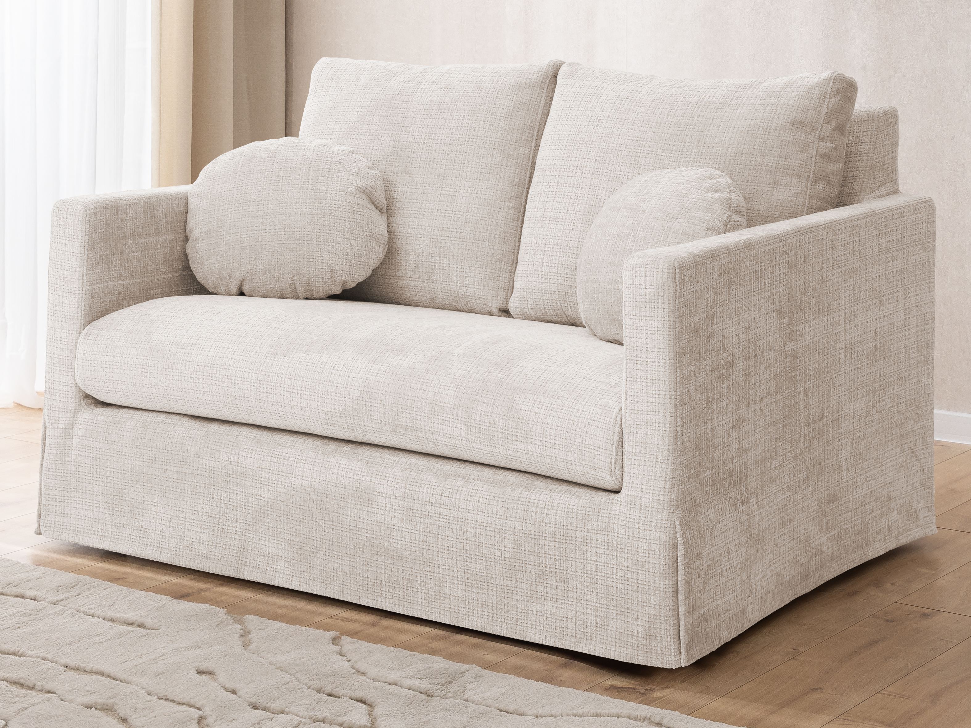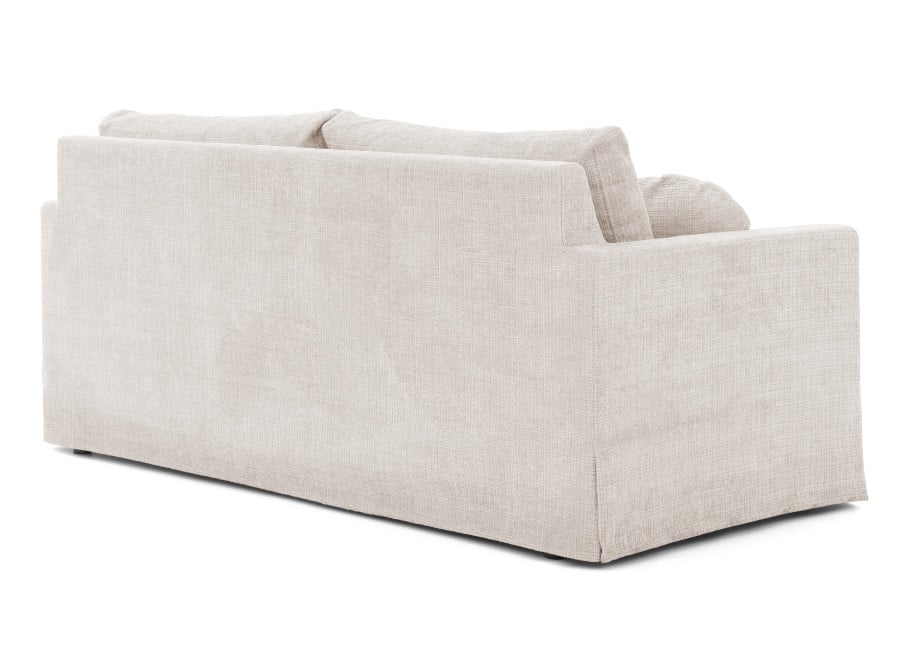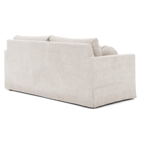 Design zestawu Nerio to połączenie nowoczesnej prostoty z nutą przytulności. Delikatne, zaokrąglone linie poduszek dekoracyjnych, często widocznych na zdjęciach, dodają meblom miękkości i organicznego charakteru. Szerokie, solidne podłokietniki o szerokości 10 cm nie tylko zwiększają komfort, ale także stanowią praktyczne miejsce na filiżankę kawy, pilota czy ulubioną książkę. Całkowita wysokość mebli wynosi 89 cm, co w połączeniu z ich proporcjami tworzy spójny i estetyczny obraz. Nóżki o wysokości 15 cm, wykonane z trwałego plastiku w kolorze czarnym, są dyskretnie ukryte pod elegancką, drapowaną osłoną tapicerki, która dodaje meblom lekkości i sprawia, że wyglądają one, jakby unosiły się nad podłogą, jednocześnie chroniąc podłogę przed zarysowaniami i zapewniając stabilność konstrukcji. To przemyślany design, który łączy estetykę z praktycznością.