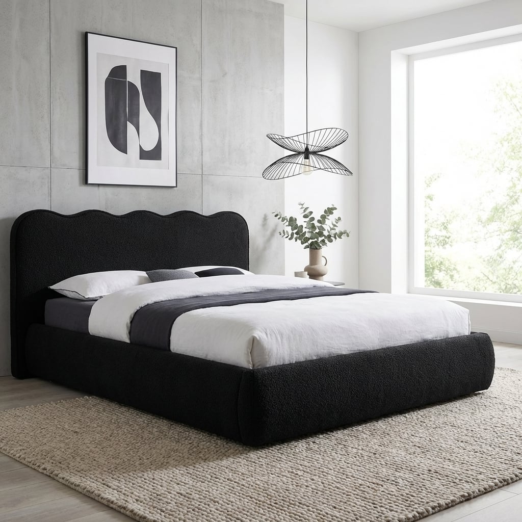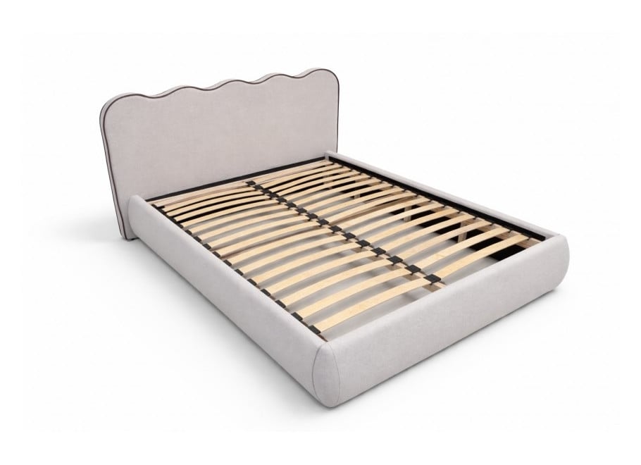 Design łóżka Rodos to prawdziwa uczta dla oczu i dotyku. Jego najbardziej charakterystycznym elementem jest wyjątkowe, faliste wezgłowie, które natychmiast przyciąga wzrok i nadaje całemu meblowi niezwykle miękkiego, organicznego charakteru. W zdjęciach produktowych widzimy, że falista linia wezgłowia jest często podkreślona delikatną, kontrastującą lamówką, co dodaje mu wyrafinowania i podkreśla jego unikalny kształt, przypominający delikatne obłoki lub spokojne morskie fale. To subtelne, ale zarazem odważne rozwiązanie projektowe sprawia, że łóżko Rodos wyróżnia się na tle tradycyjnych modeli, oferując estetykę, która jest jednocześnie nowoczesna i ponadczasowa. Cała rama łóżka, widoczna na zdjęciach, prezentuje się niezwykle solidnie, a jednocześnie lekko dzięki zaokrąglonym krawędziom i miękkiej tapicerce, która otula każdy element, tworząc spójną i harmonijną całość.