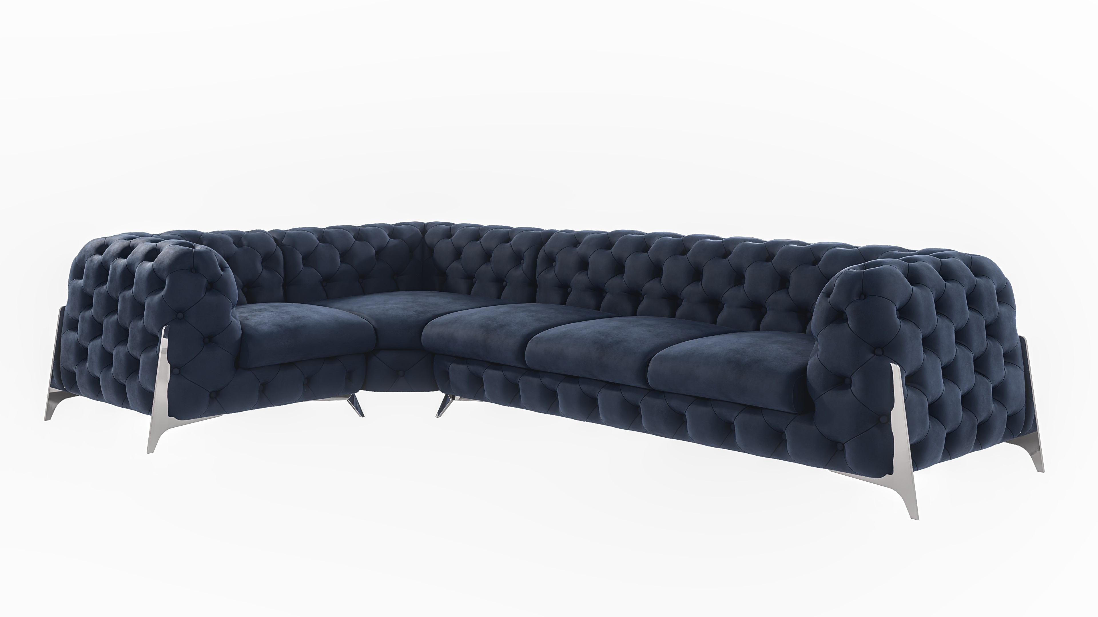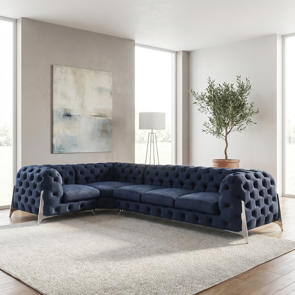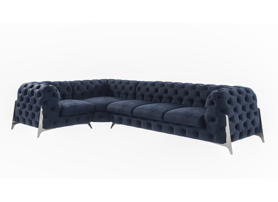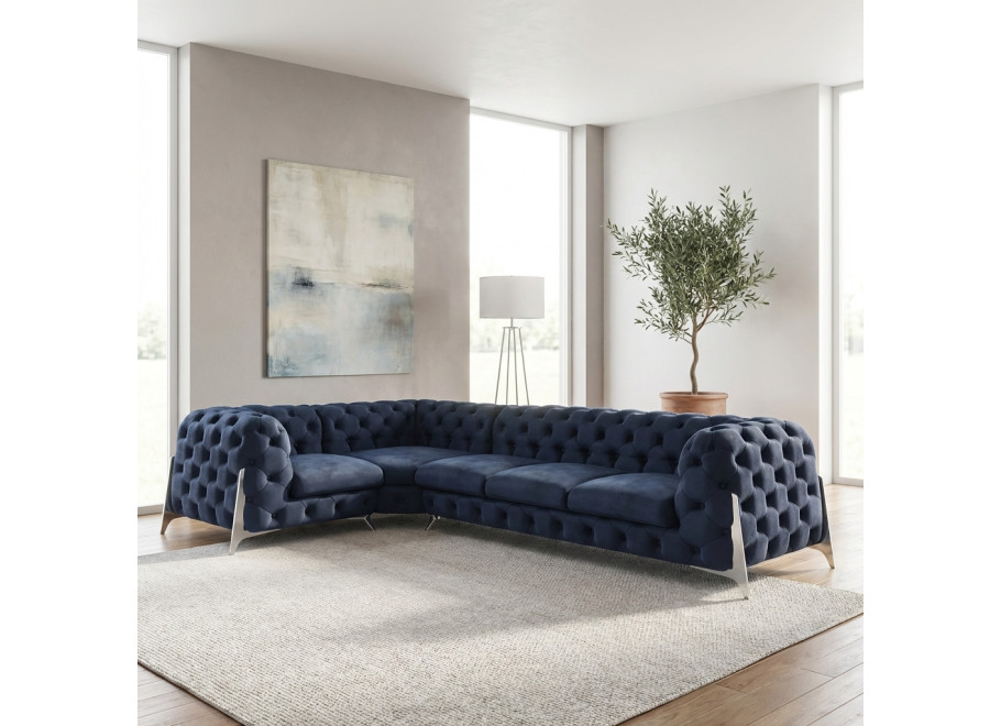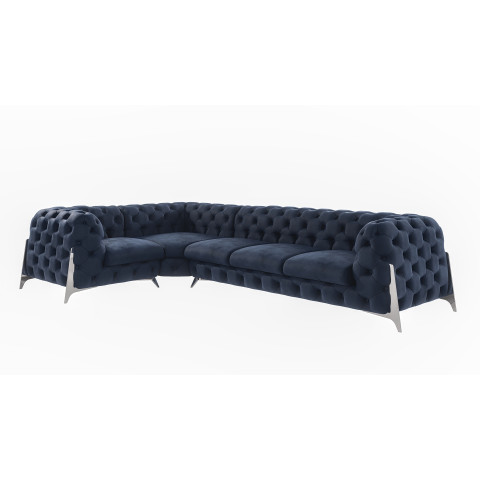 Poznaj Elegancki narożnik Chesterfield pikowany granatowy KALIFORNIA 1+E+3, który stanowi kwintesencję stylu glamour i klasycznej elegancji w nowoczesnym wydaniu. Ten przestronny narożnik to idealne rozwiązanie dla osób poszukujących mebla, który nie tylko zapewni wygodny wypoczynek, ale także stanie się centralnym punktem i ozdobą każdego reprezentacyjnego salonu. Jego unikalny design, łączący tradycyjne pikowania Chesterfield z granatową, aksamitną tkaniną i smukłymi metalowymi nóżkami, sprawia, że pasuje zarówno do wnętrz klasycznych, jak i tych urządzonych w duchu współczesnego luksusu.
