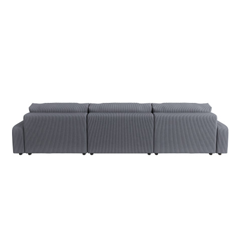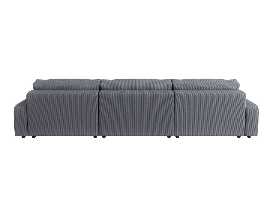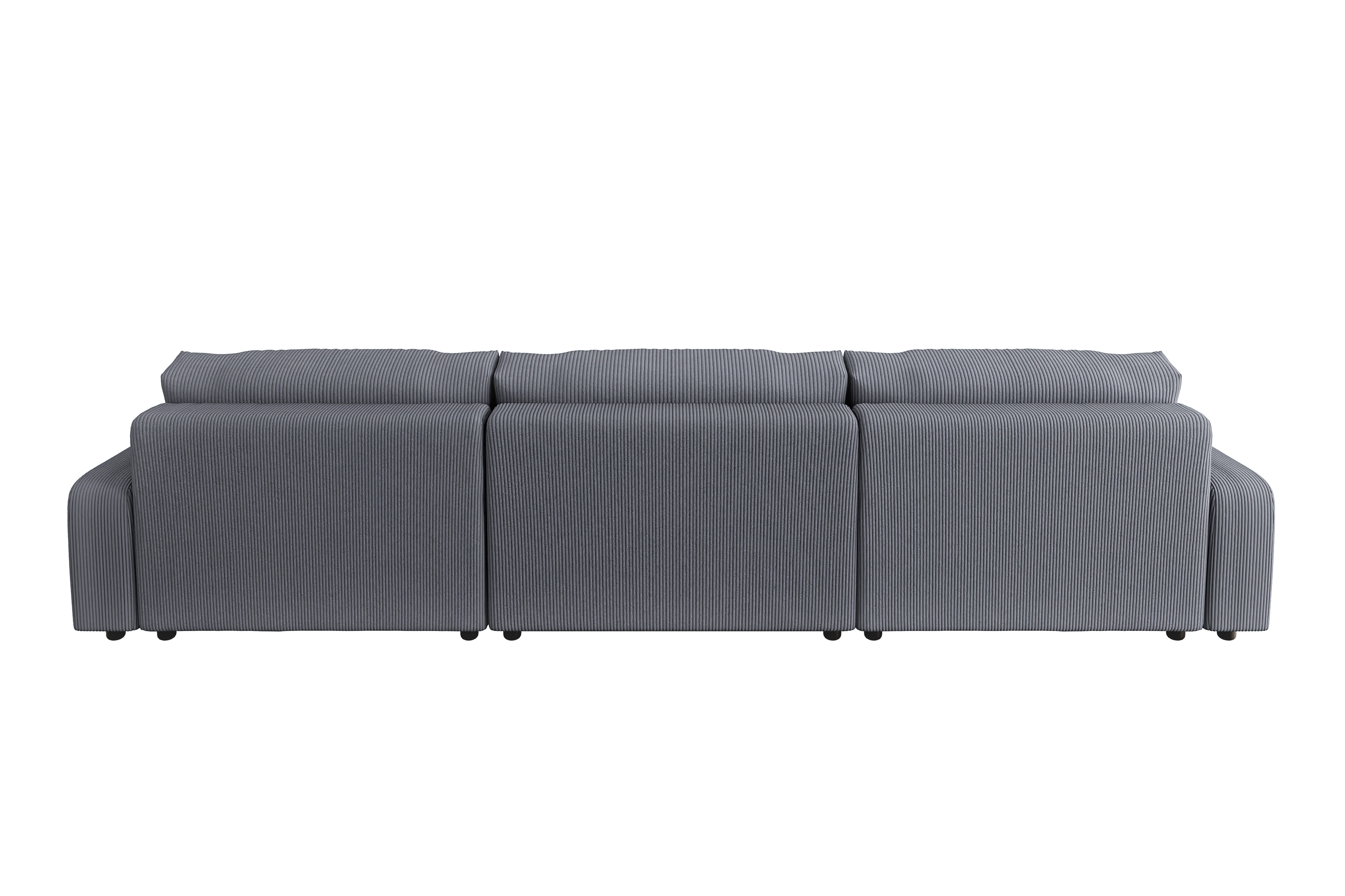 Oparcie narożnika wypełnione jest również wysokoelastyczną pianką poliuretanową, co zapewnia miękkie i komfortowe podparcie dla pleców. Całość tapicerowana jest tkaniną Lincoln 90 w ciemnoszarym odcieniu, która charakteryzuje się delikatną, prążkowaną strukturą. Tkanina obiciowa pokrywa także tył oparcia, co pozwala na swobodne ustawienie narożnika Sergio U na środku salonu, bez konieczności dosuwania go do ściany. Nóżki wykonane z czarnego plastiku są niskie, dyskretne i stabilne, harmonijnie dopełniając minimalistyczny design mebla.