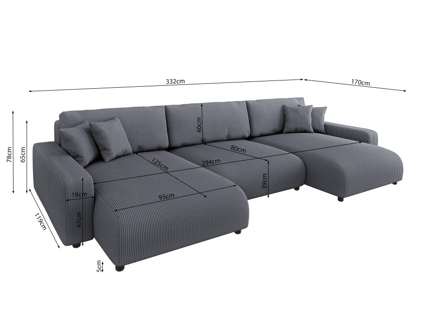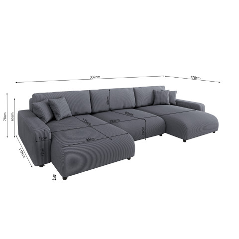 Rozkładany narożnik nowoczesny Sergio U ma szerokość całkowitą 332 cm, głębokość całkowitą 170 cm i wysokość 78 cm. Powierzchnia spania wynosi 148 x 196 cm, a wysokość siedziska to 39 cm.