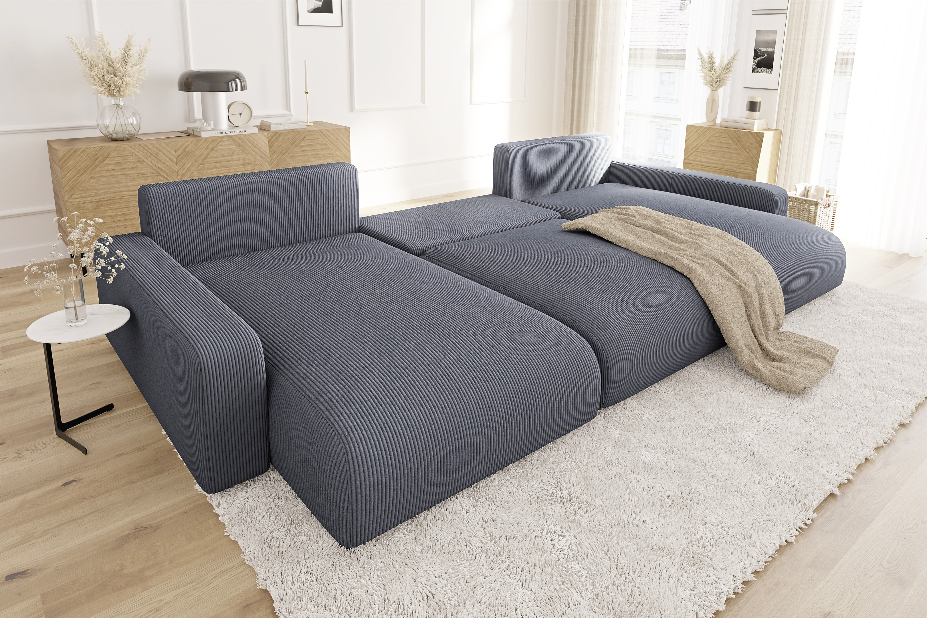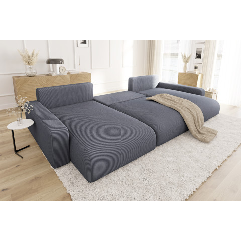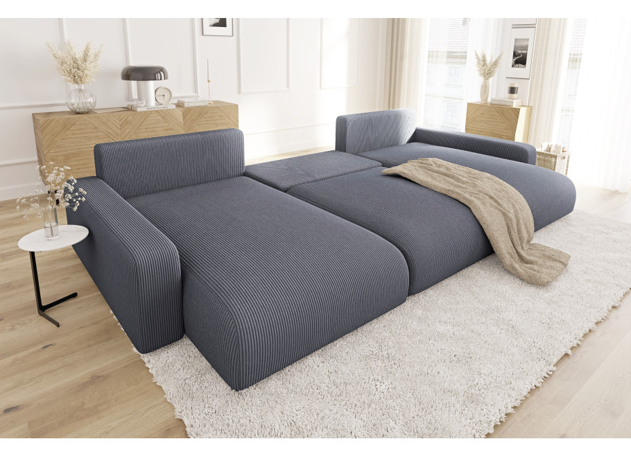 Główną przewagą narożnika Sergio U nad innymi meblami wypoczynkowymi jest jego uniwersalność połączona z imponującymi wymiarami. Oferuje on nie tylko obszerne miejsce do siedzenia dla sześciu osób, ale także pełnowymiarową funkcję spania oraz pojemny pojemnik na pościel, co czyni go kompleksowym rozwiązaniem dla każdego, kto potrzebuje maksymalnego wykorzystania przestrzeni i komfortu. Ten narożnik z funkcją spania i pojemnikiem na pościel to inwestycja w wygodę i porządek w Twoim salonie.