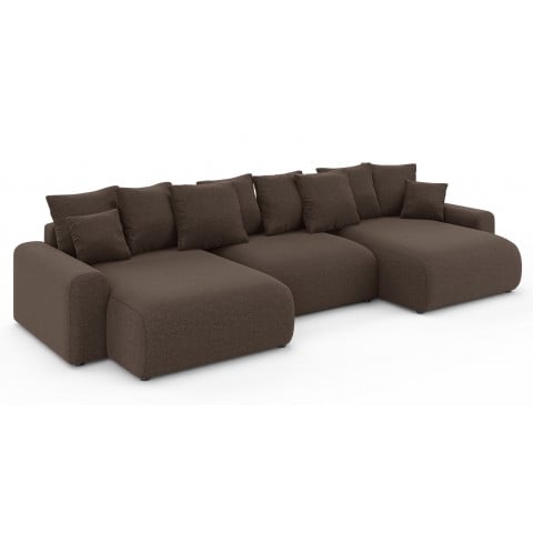 Narożnik U-kształtny brązowy Cleo Small został zaprojektowany jako mebel 6-osobowy, oferując obfitą przestrzeń do siedzenia i wspólnego wypoczynku. Jest to idealny duży narożnik do salonu dla rodzin i osób, które często przyjmują gości, zapewniając komfort dla każdego.