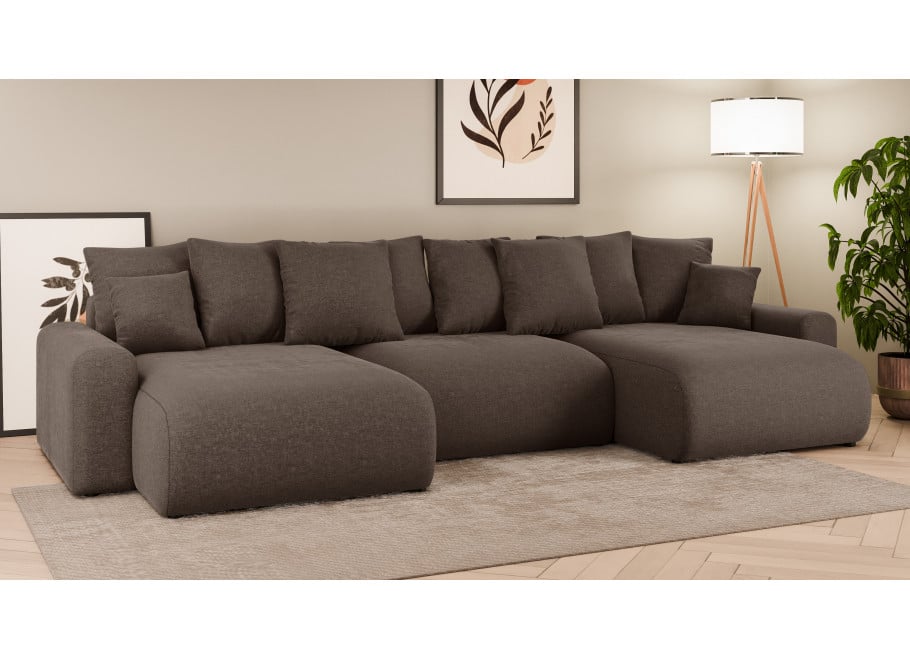 Rozkładany narożnik U-kształtny brązowy Cleo Small to synonim komfortu i funkcjonalności. Głębokie siedziska (83 cm i 57 cm, a otomana aż 104 cm) w połączeniu z wysokoelastyczną pianką poliuretanową oraz ośmioma dużymi poduszkami oparciowymi (50x50x20 cm) zapewniają wyjątkowo wygodne miejsce do codziennego wypoczynku. Dodatkowe dwie poduszki dekoracyjne (38x38x15 cm) podnoszą estetykę i komfort. Niezależnie od tego, czy czytasz książkę, oglądasz film, czy spędzasz czas z rodziną, ten narożnik brązowy gwarantuje relaks na najwyższym poziomie.