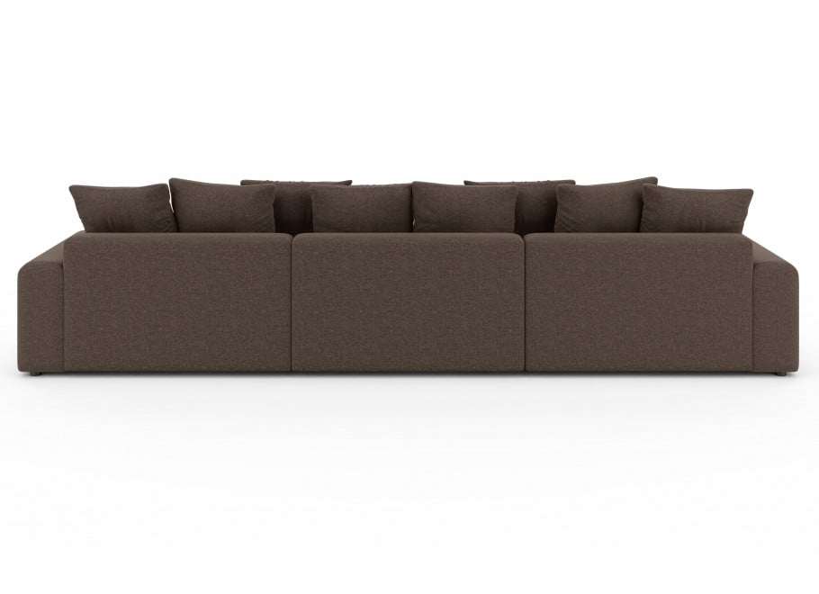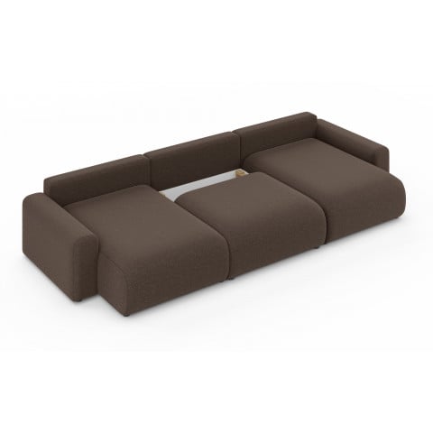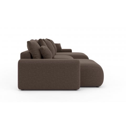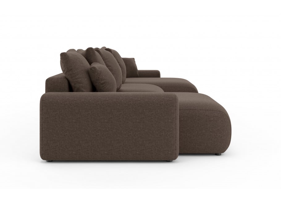 Narożnik Cleo Small wyróżnia się nowoczesnym, minimalistycznym designem z zaokrąglonymi, miękkimi liniami, które zapraszają do relaksu. Brązowy odcień tkaniny Wind 28, z delikatną, widoczną fakturą, nadaje mu ciepłego i przytulnego charakteru, jednocześnie zachowując elegancki wygląd. Obszerne poduszki oparciowe i dekoracyjne podkreślają jego komfortowy styl. Główną przewagą tego modelu jest połączenie obszernej, 6-osobowej przestrzeni wypoczynkowej z imponującą funkcją spania oraz praktycznym pojemnikiem na pościel, co czyni go wszechstronnym rozwiązaniem do każdego domu.