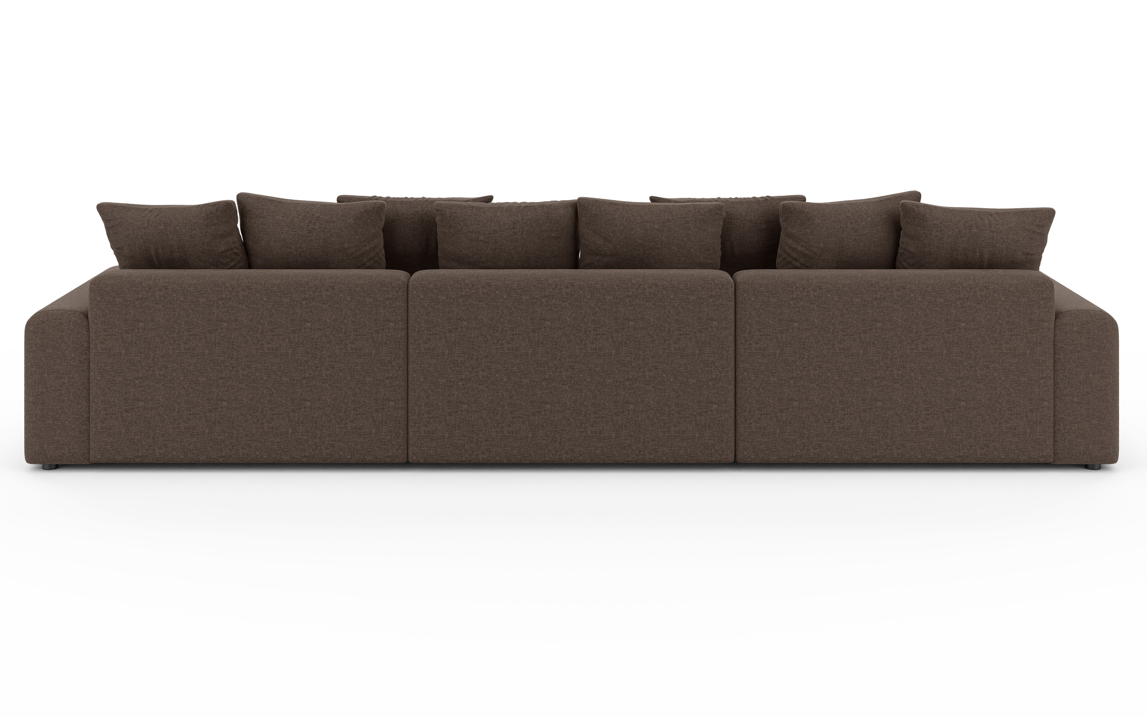 Tapicerka narożnika wykonana jest z tkaniny Wind 28 w brązowym odcieniu, charakteryzującej się widoczną, przyjemną w dotyku fakturą. Tył oparcia również został obity tą samą tkaniną, co sprawia, że narożnik U-kształtny brązowy Cleo Small jest wolnostojący i prezentuje się estetycznie z każdej strony. Całość dopełniają czarne, plastikowe nóżki o niskim profilu, które subtelnie podtrzymują konstrukcję.