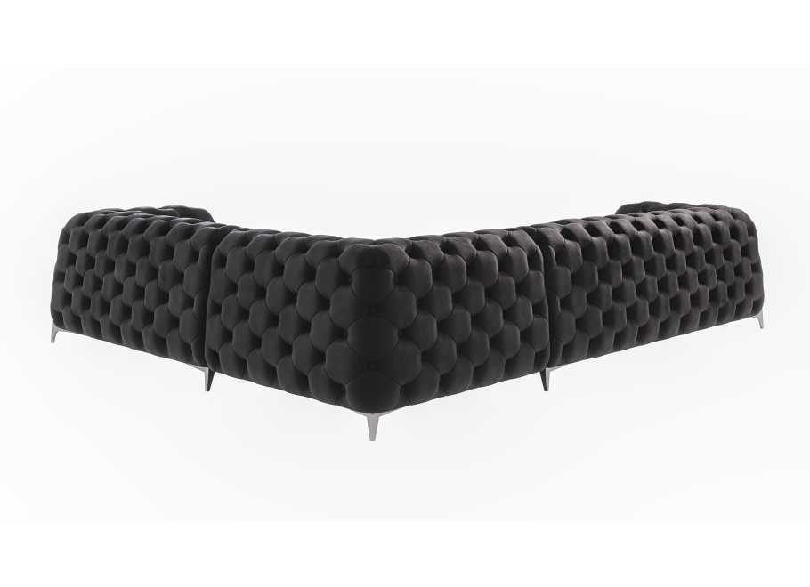 Czarny narożnik pikowany KALIFORNIA 3+E+2 to przykład solidnego rzemiosła, gdzie każdy element został starannie dobrany, by zapewnić trwałość i estetykę. Tapicerka wykonana jest z tkaniny Riviera 100, cenionej za swoją miękkość i wygląd przypominający aksamit, co dodaje meblowi luksusowego charakteru. Tkanina ta jest przyjemna w dotyku i stanowi eleganckie wykończenie dla głębokiego pikowania, które zdobi oparcia i podłokietniki. Tył oparcia jest również obity tkaniną obiciową, co sprawia, że ten duży narożnik jest meblem wolnostojącym i doskonale prezentuje się z każdej strony.