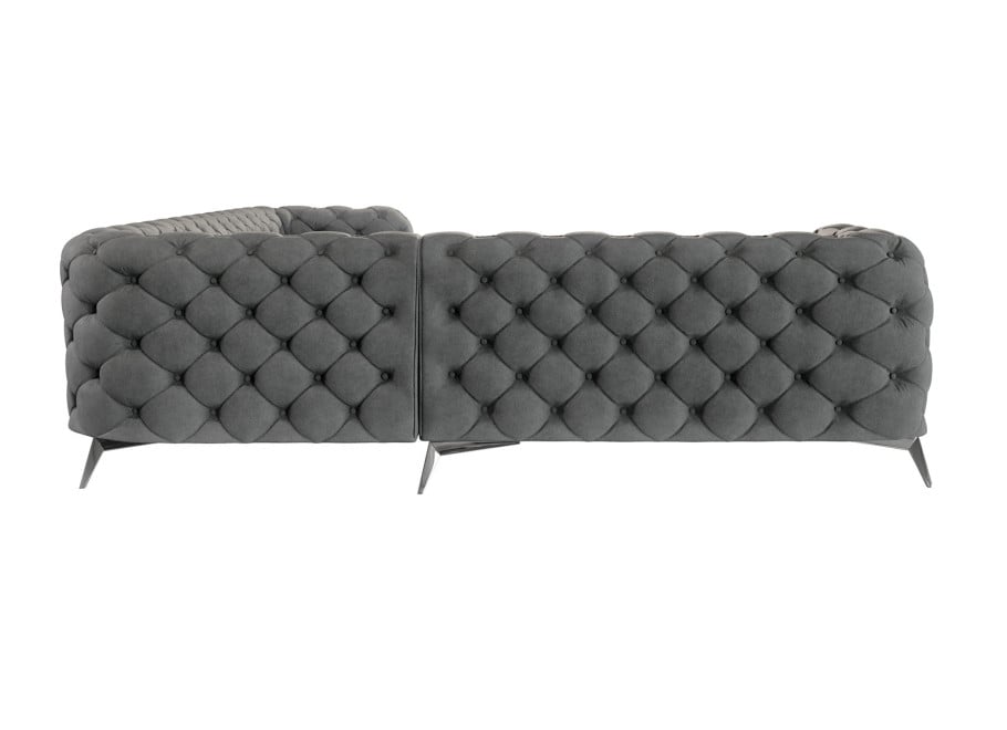Zaprojektowany z myślą o estetyce i trwałości, narożnik TEO urzeka ponadczasowym pikowaniem w stylu Chesterfield, które zdobi zarówno oparcie, jak i boki mebla. Miękka w dotyku tapicerka z weluru Riviera 91 w eleganckim, szarym odcieniu doskonale komponuje się z metalowymi nóżkami, nadając całości lekkości i nowoczesnego charakteru. To idealna sofa narożna dla osób ceniących sobie wyrafinowany styl i dbałość o detale, która wyróżnia się na tle innych mebli swoją monumentalną formą i niepowtarzalnym urokiem.