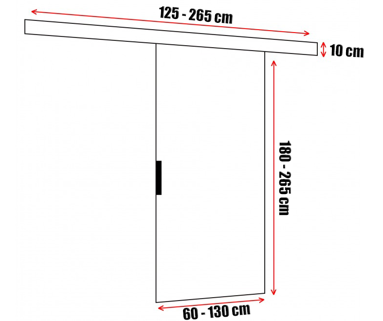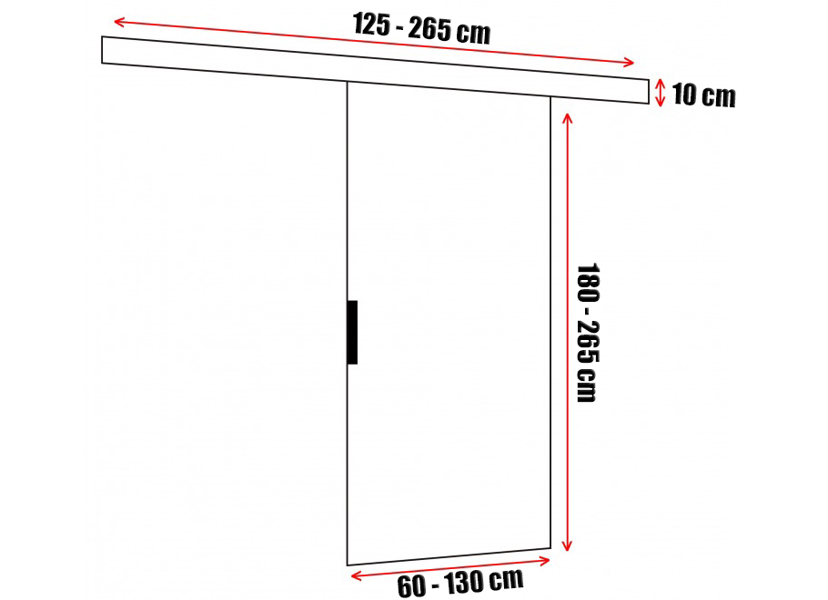 Drzwi przesuwne Moza oferują szeroki zakres wyboru wymiarów – ich wysokość może wynosić od 180 cm do 265 cm, a szerokość od 60 cm do 130 cm. To sprawia, że są one doskonałym rozwiązaniem zarówno do większych, jak i mniejszych przestrzeni. Dzięki temu każdy klient może dostosować drzwi do swoich potrzeb z dokładnością do 1 cm, uzyskując idealne proporcje i estetyczne dopasowanie do pomieszczenia. Maskownica o głębokości 8 cm i wysokości 10 cm, skutecznie ukrywa mechanizm przesuwu, co dodatkowo podkreśla minimalistyczny i schludny wygląd drzwi. Przestrzeń pomiędzy drzwiami, a ścianą wynosi 1,8cm, lecz istnieje możliwość powiększenia tego wymiaru do 3,6cm.